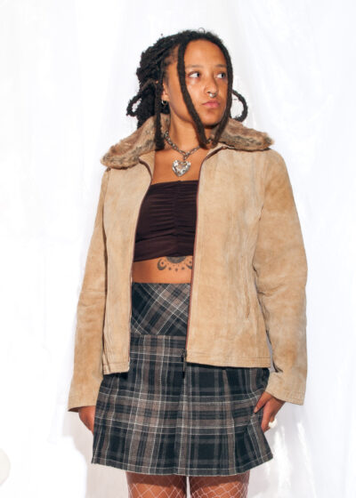 Vintage Y2K Leather Jacket w Faux Fur Collar in Beige Suede