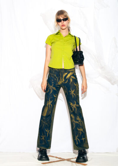 Reworked Vintage Y2K Hand-Painted Flare Jeans in Green