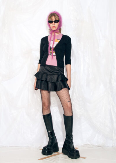 Vintage Y2K Frilly Mini Skirt in Black Satin w Low Rise