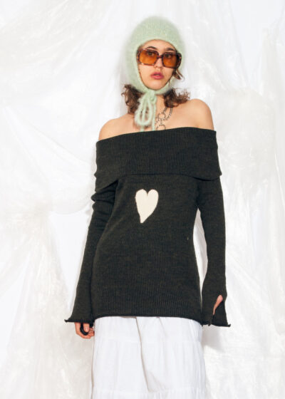 Vintage Y2K Off Shoulder Knit Jumper in Grey w Heart