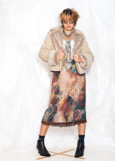 Vintage Y2K Leather Coat in Beige Suede Faux Fur Shearling