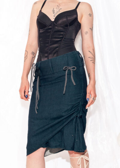 Vintage Denim Skirt Y2K Ruched Bow Midi in Blue