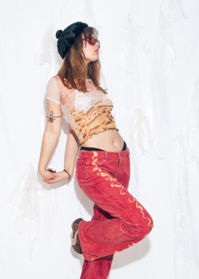 Vintage Y2K Mesh Baby Tee in Printed White and Brown