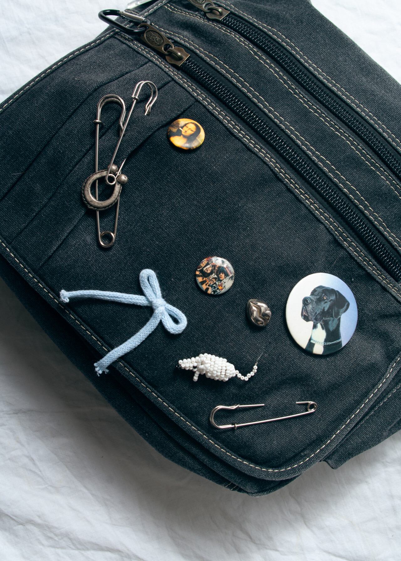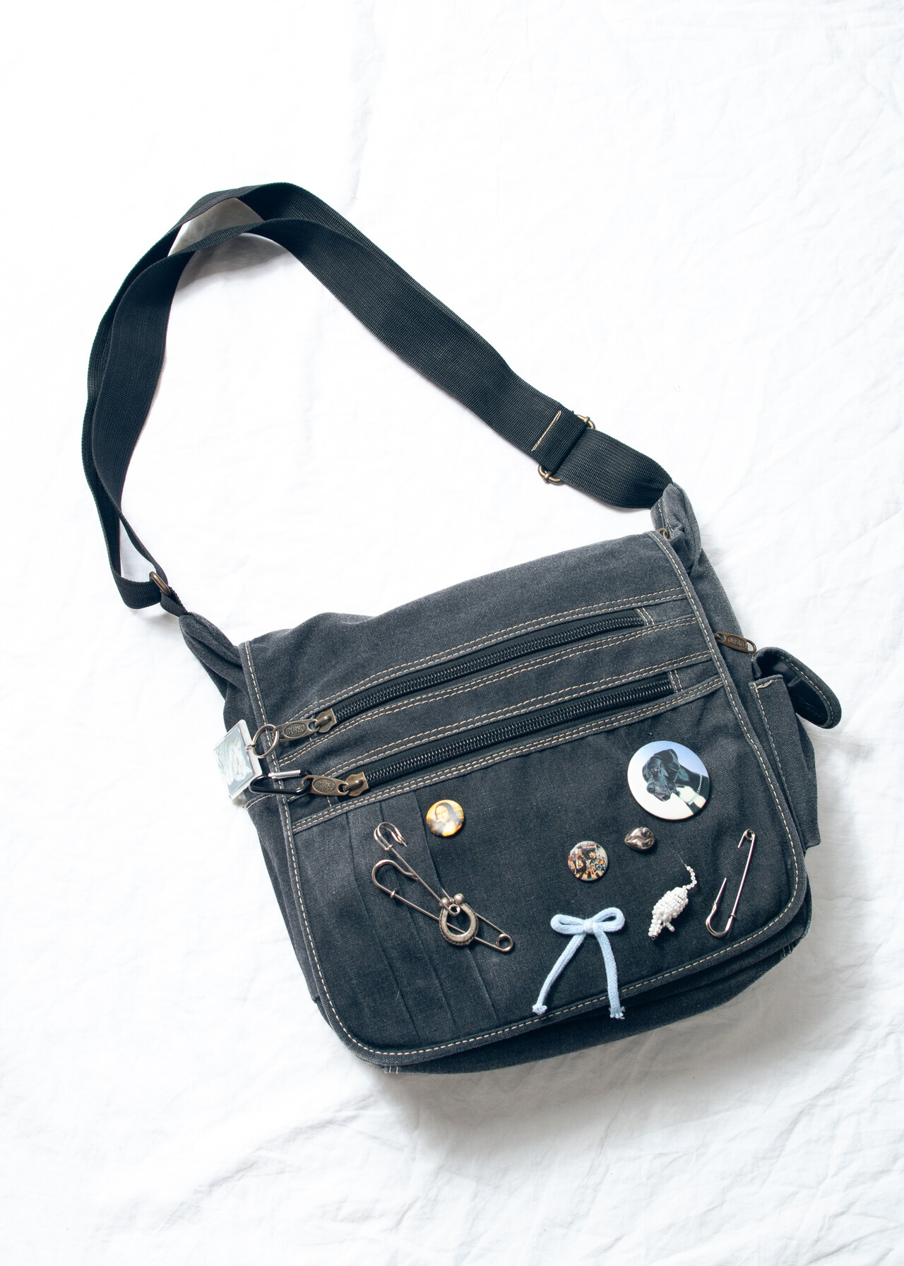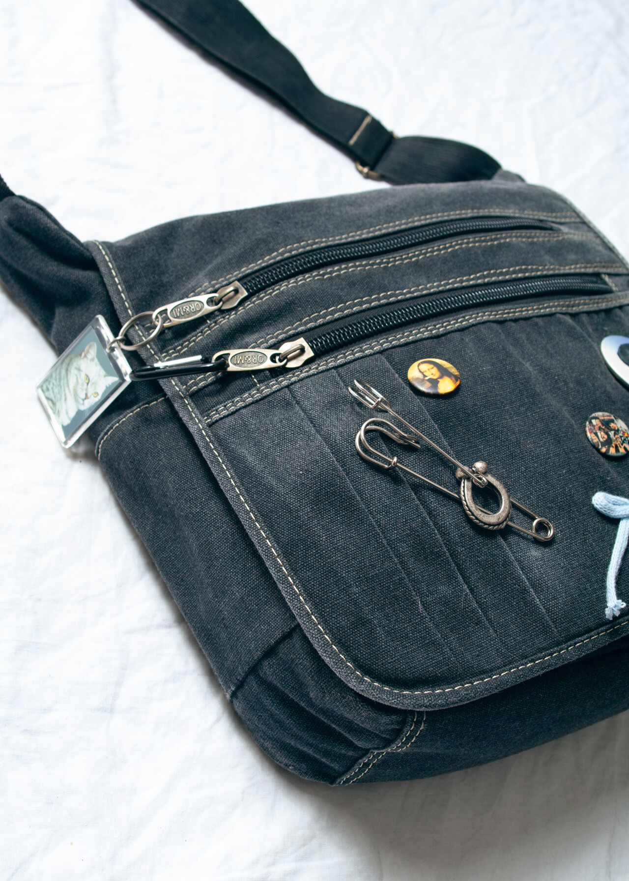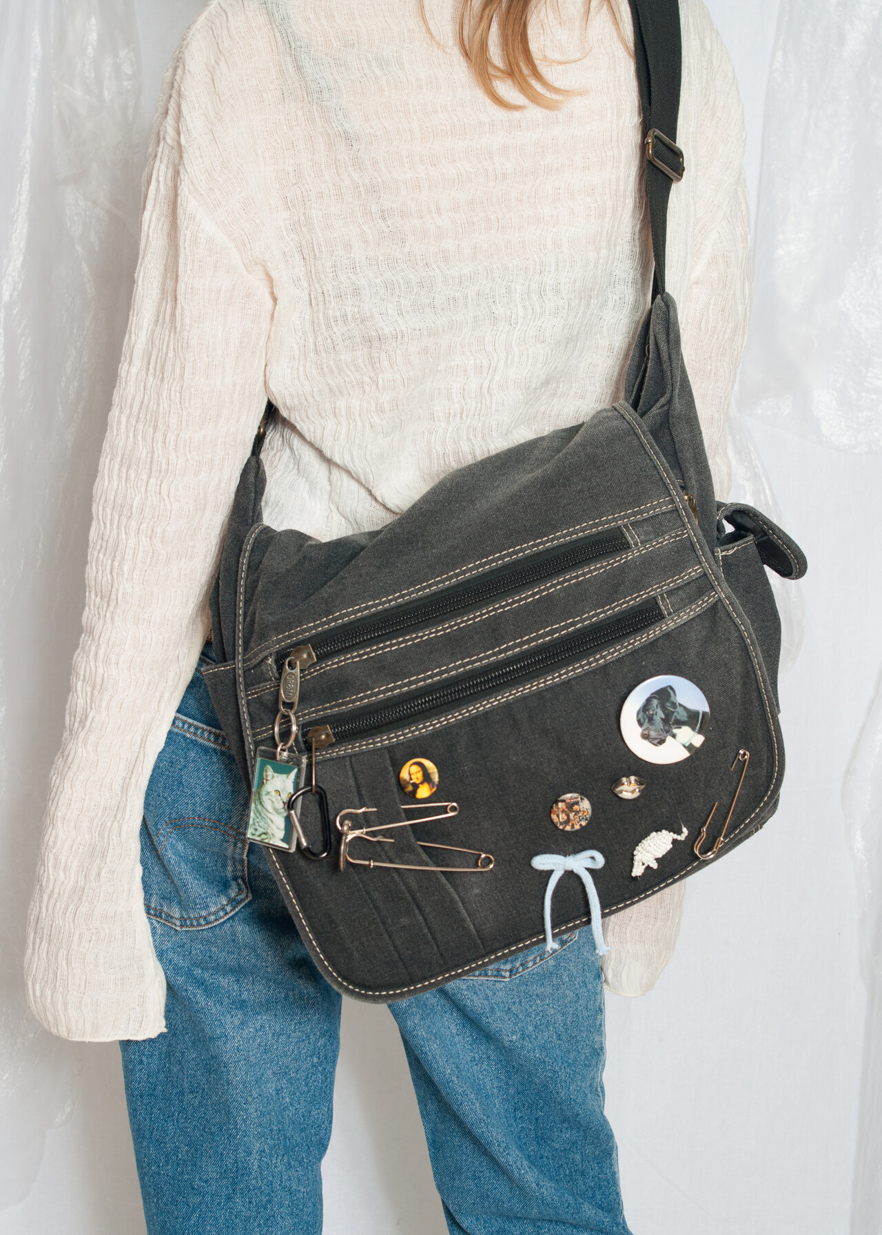 Tags: 00s streetwear, 2000s vintage fashion, alt fashion bag, cross body bag, grey canvas bag, messenger bag, pins charms, reworked, unisex bag, upcycled, whimsi twee, y2k grunge outfit, y2k style accessory