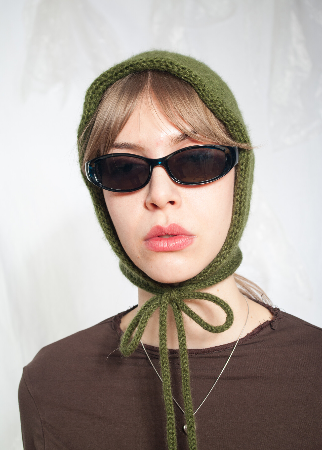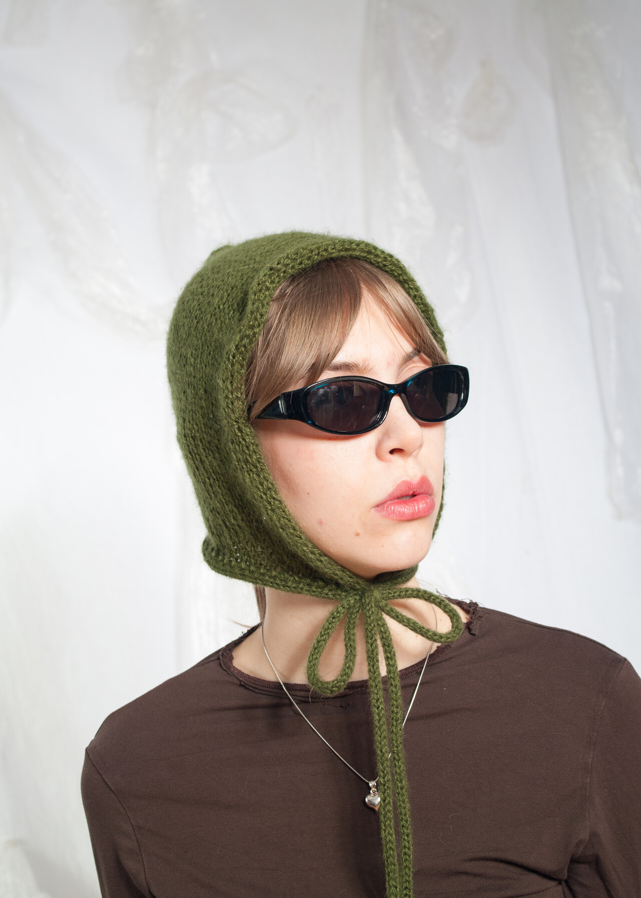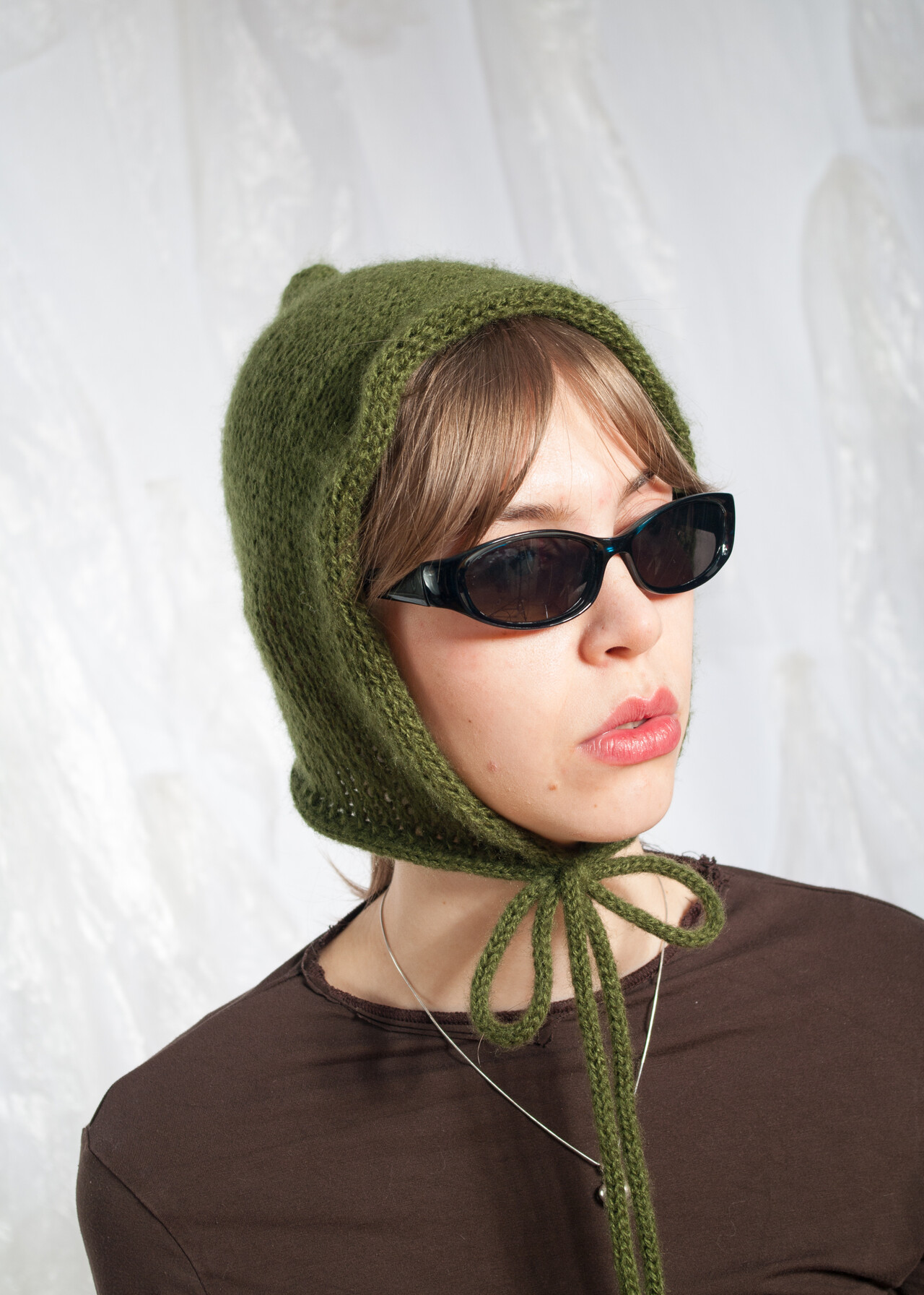 This Y2K vintage hood is a cozy knitted baby bonnet made from vintage yarn, ready to teleport your head back to the early 2000s with just a hint of green hilarity.