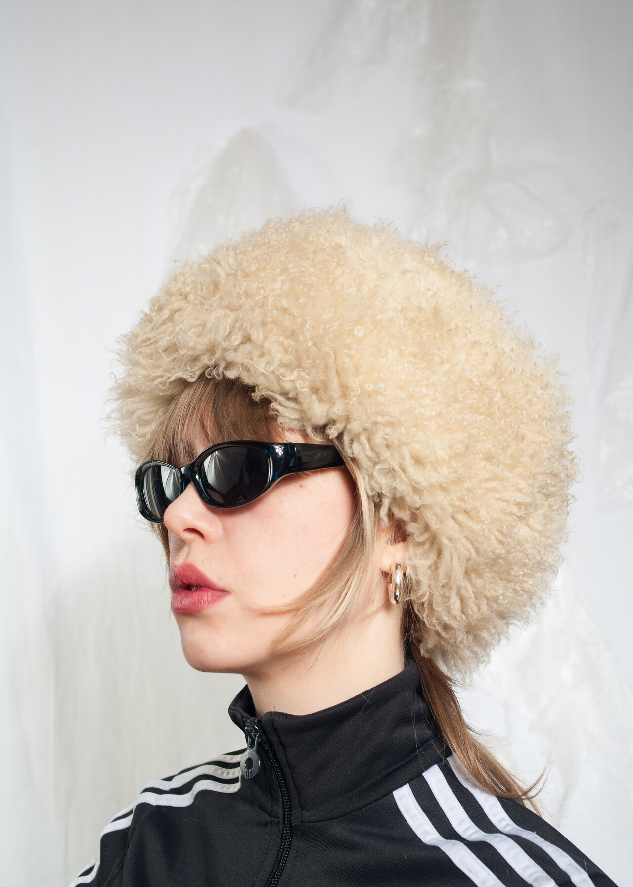 Tags: 60s vintage fashion, furry beanie, Penny Lane style, rare shearling hat, real fur hat, winter hat, y2k style accessory