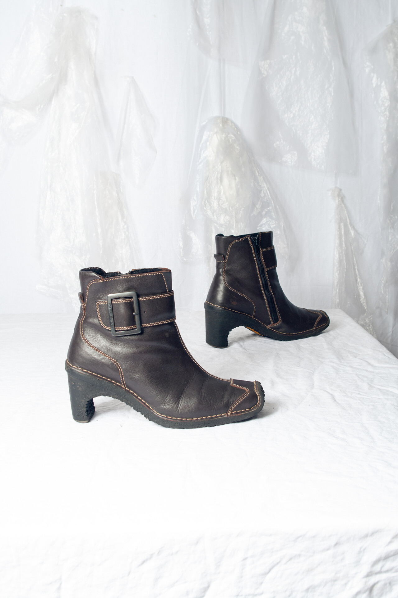 Tags: 00s streetwear, 2000s style fashion, brown ankle boots, Camel Active shoes, chunky buckle, high heels, real leather shoes, square toe, vintage footwear, whimsigoth, y2k accessory, y2k grunge outfit