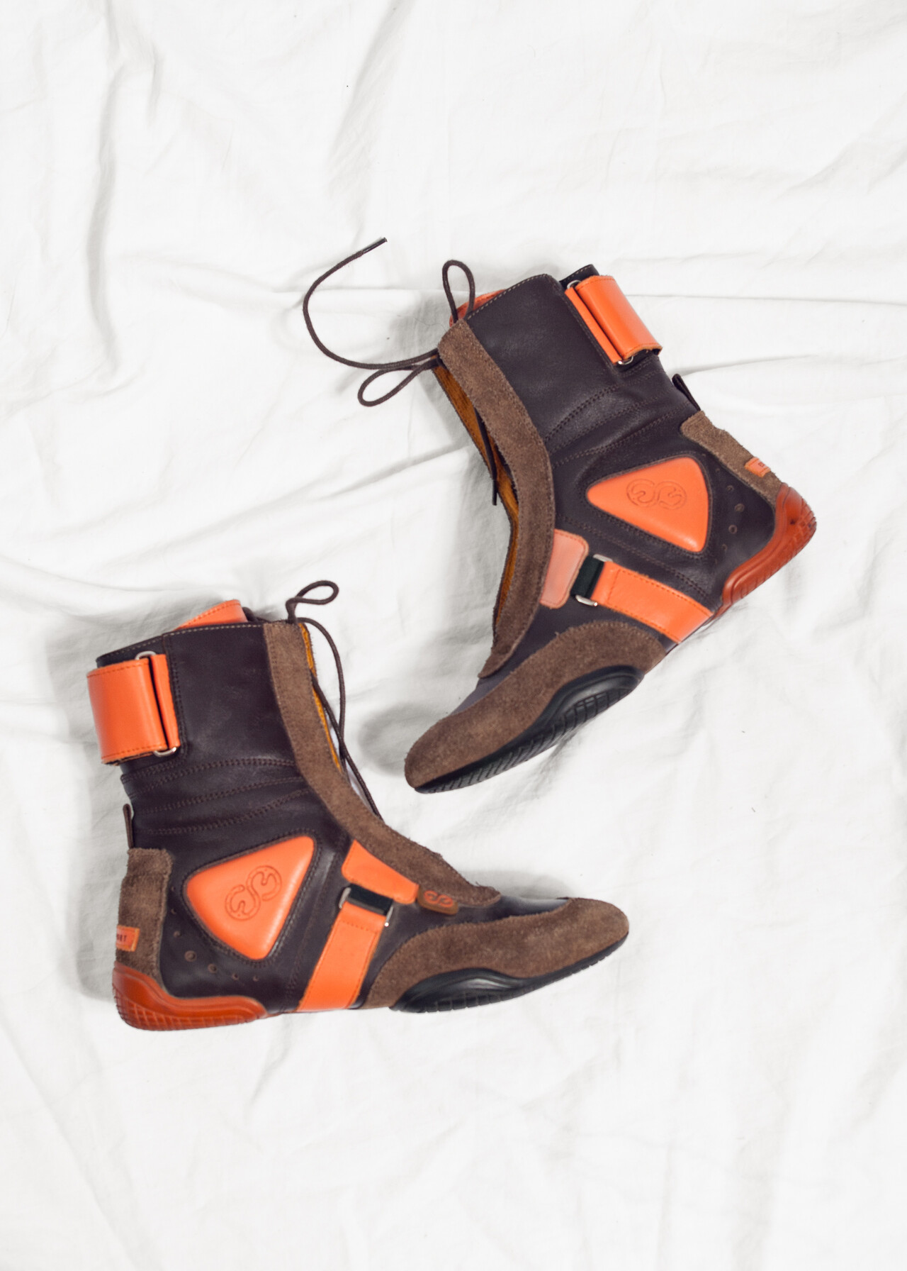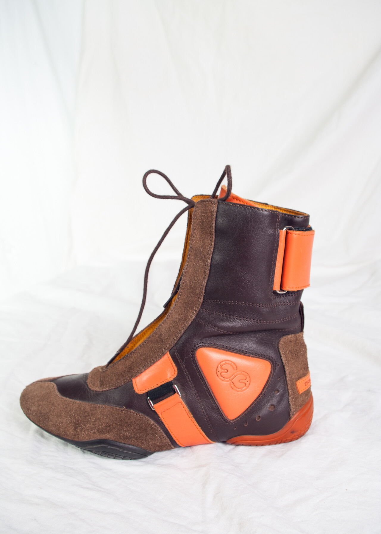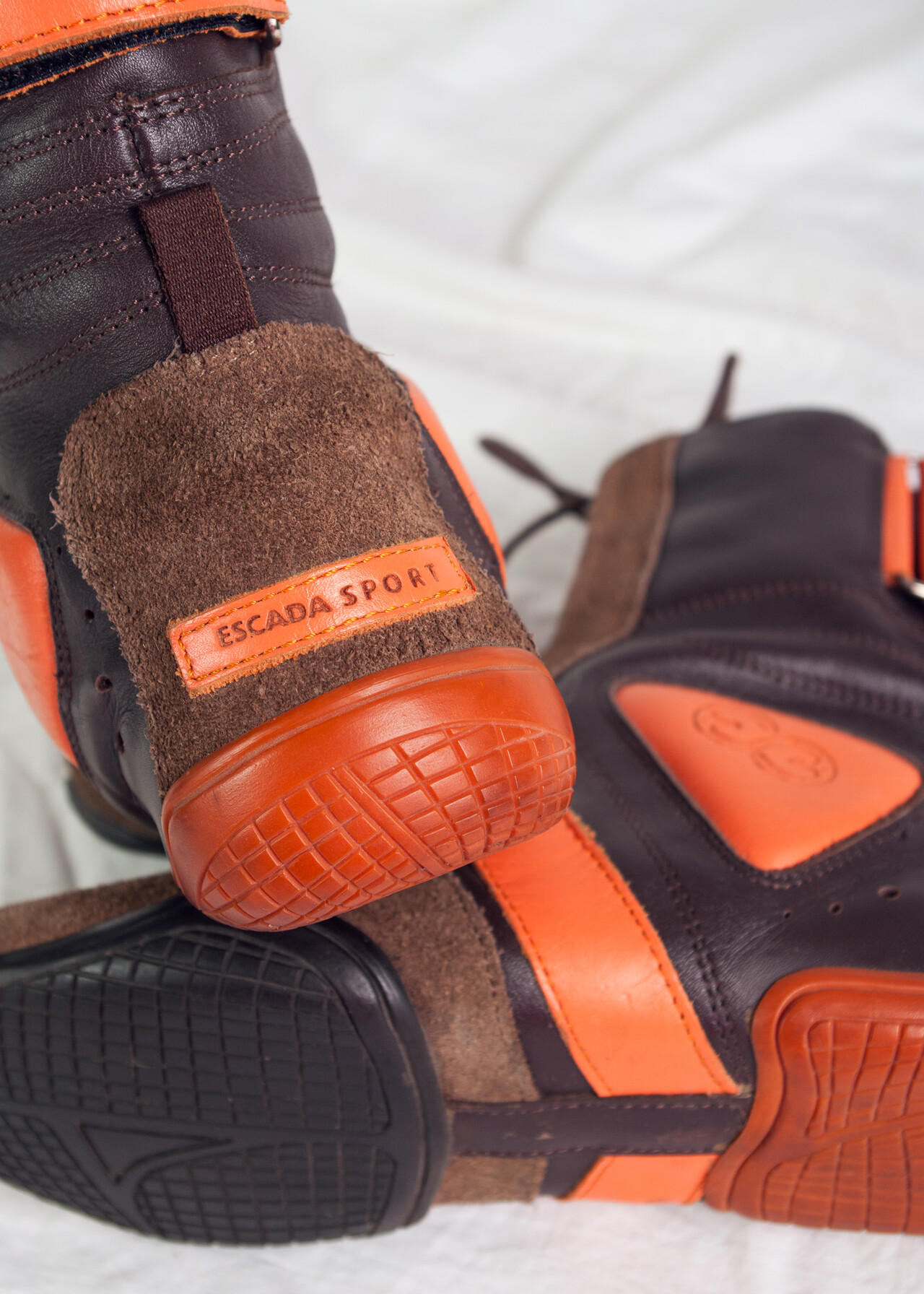 Y2K vintage Escada boots – these real leather gems are ready to kick your wardrobe into high gear with a splash of orange and brown boxing boot flair straight from the 2000s.