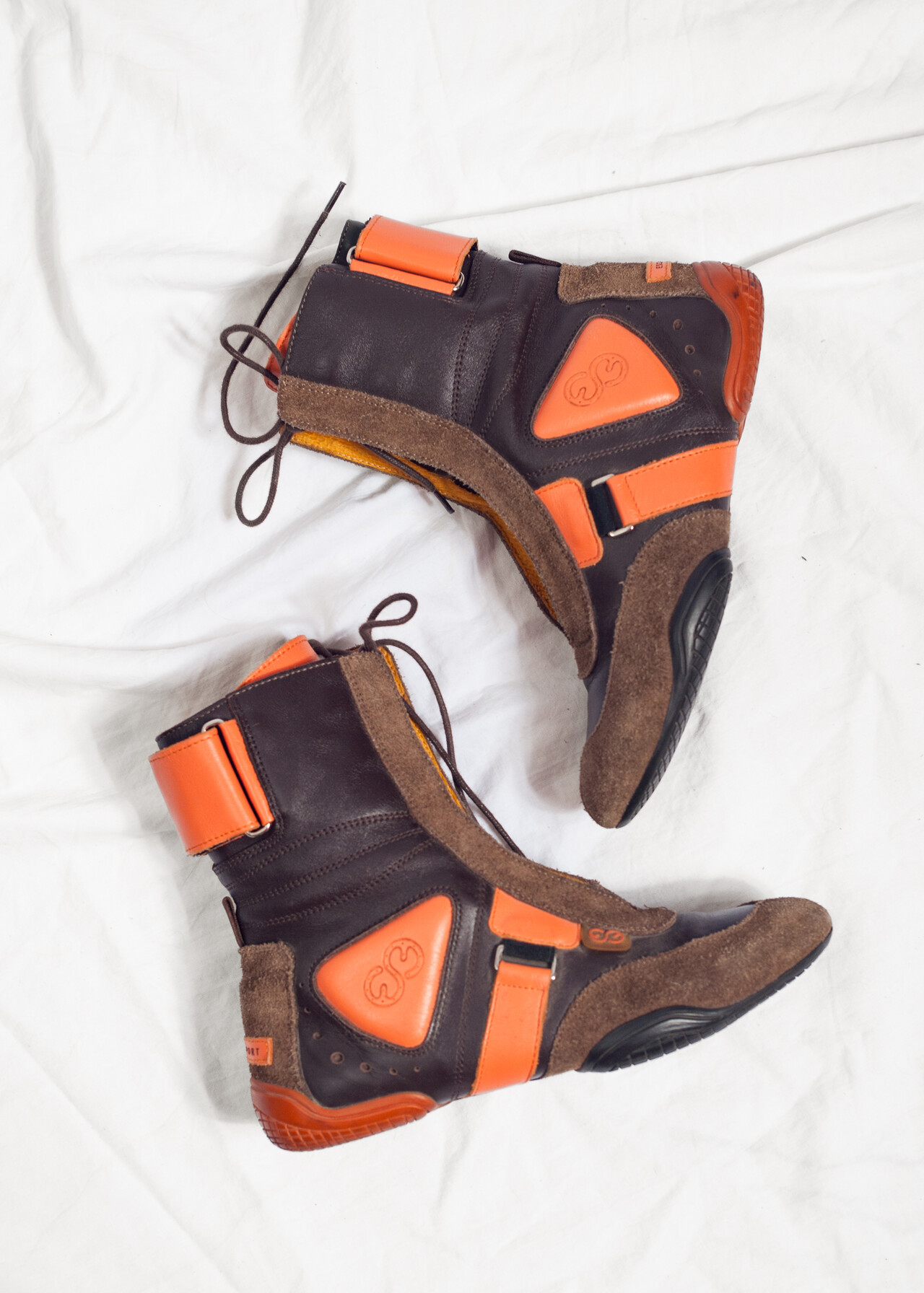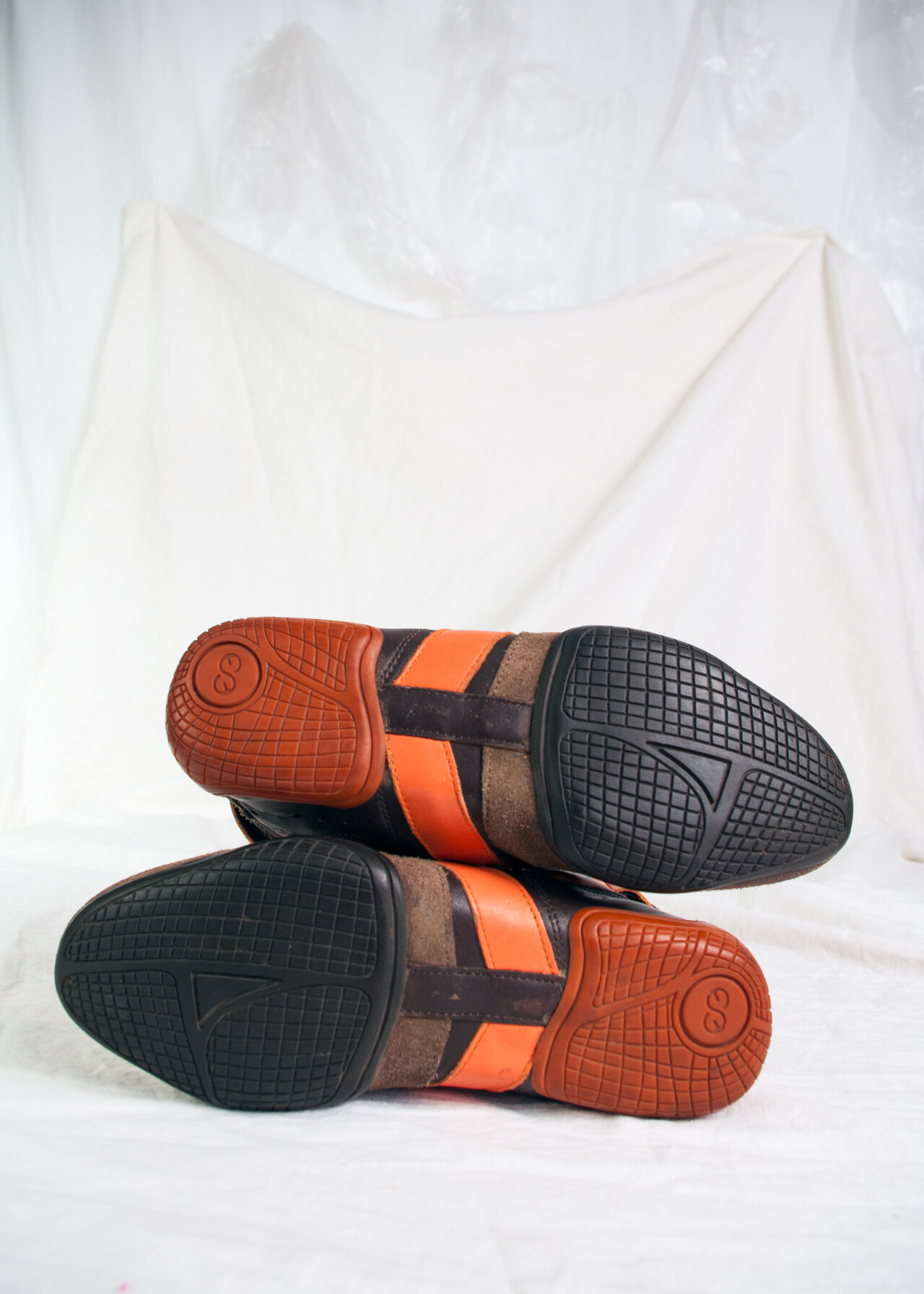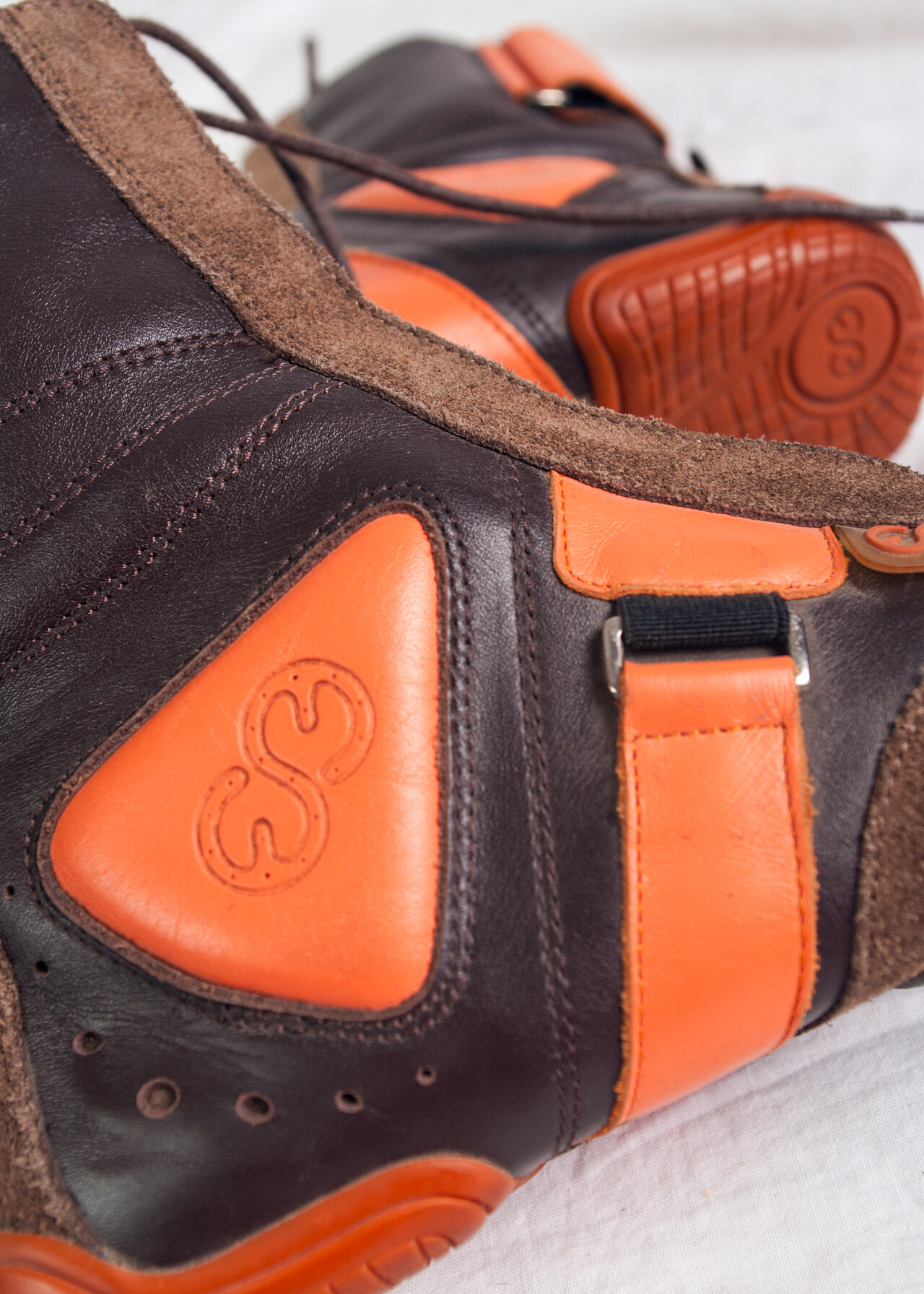 Y2K vintage Escada boots – these real leather gems are ready to kick your wardrobe into high gear with a splash of orange and brown boxing boot flair straight from the 2000s.