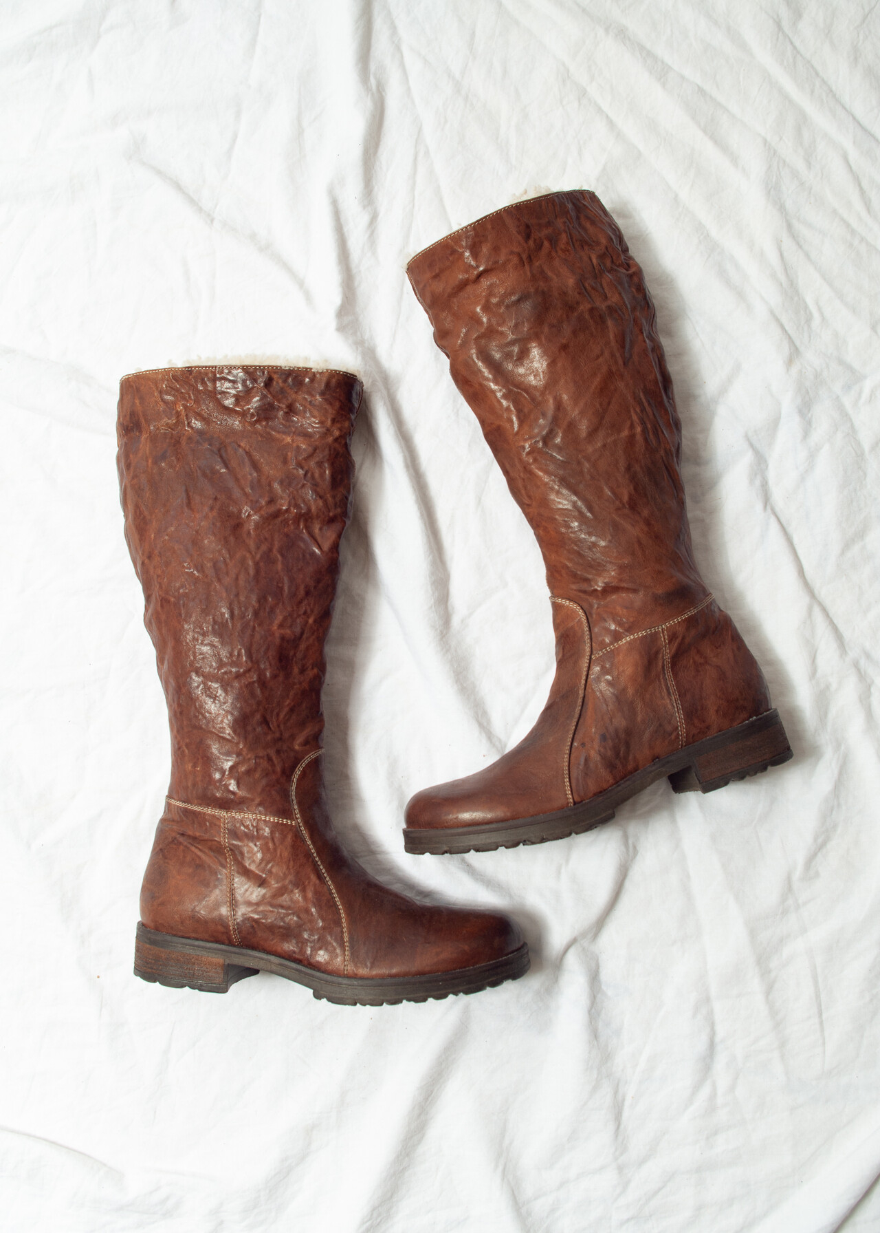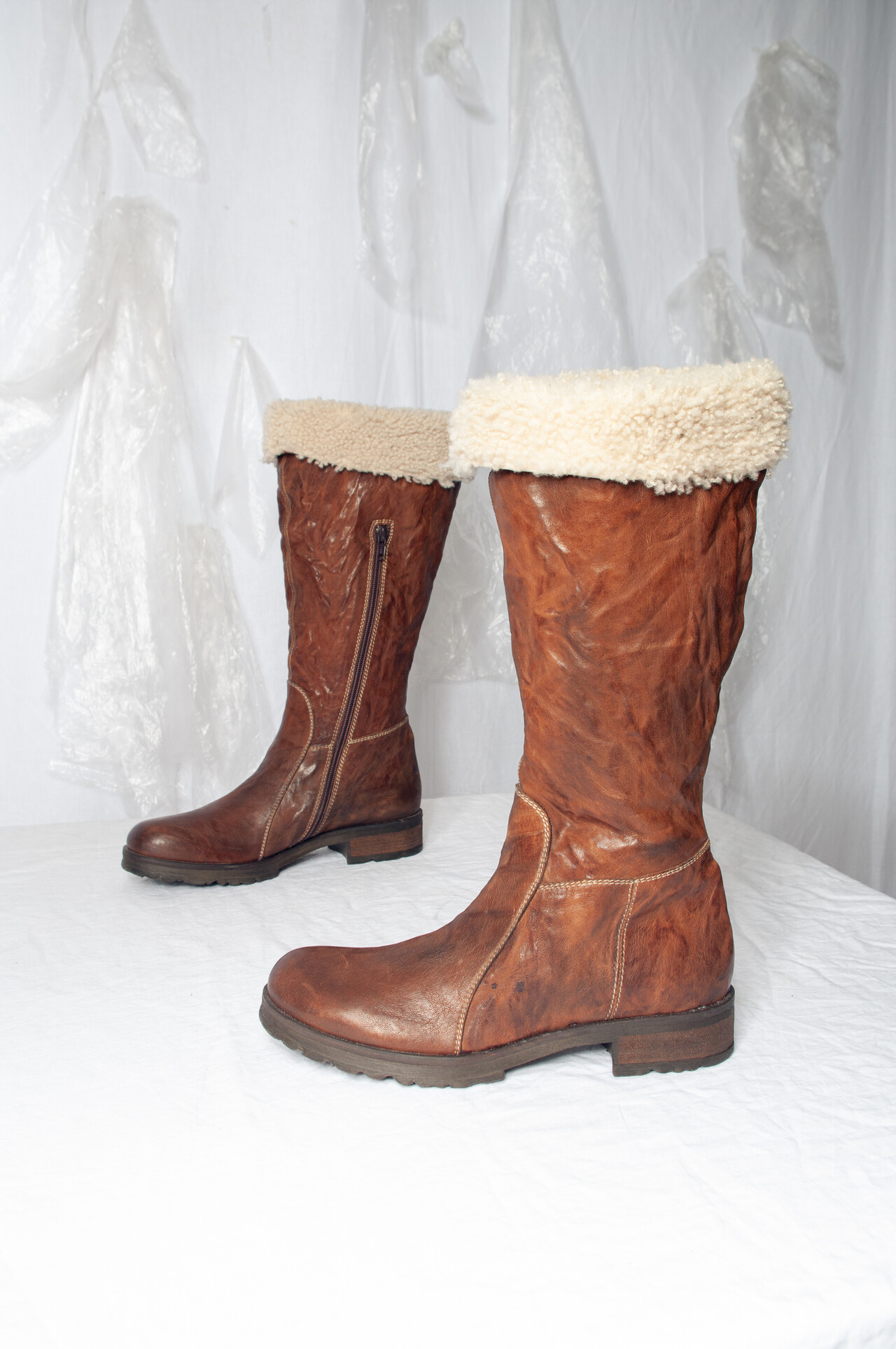 Vintage Y2K Shearling Knee Boots in Brown Leather