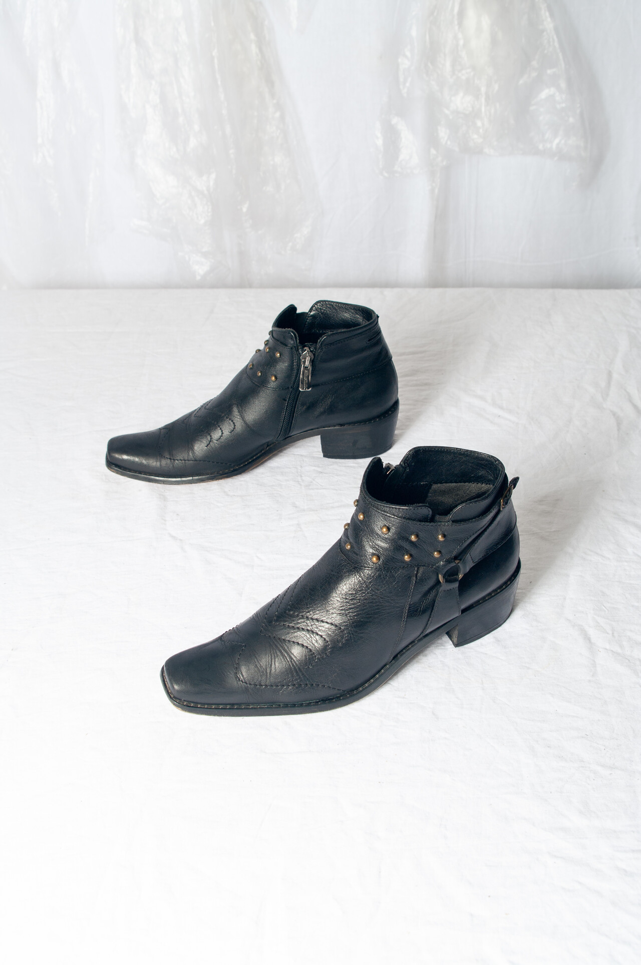 Tags: 00s streetwear look, 2000s vintage fashion, ankle boots, cowboy boots, European vintage, pointed toe, real leather boot, studded, western boots, whimsical aesthetic, y2k grunge outfit, y2k style accessory