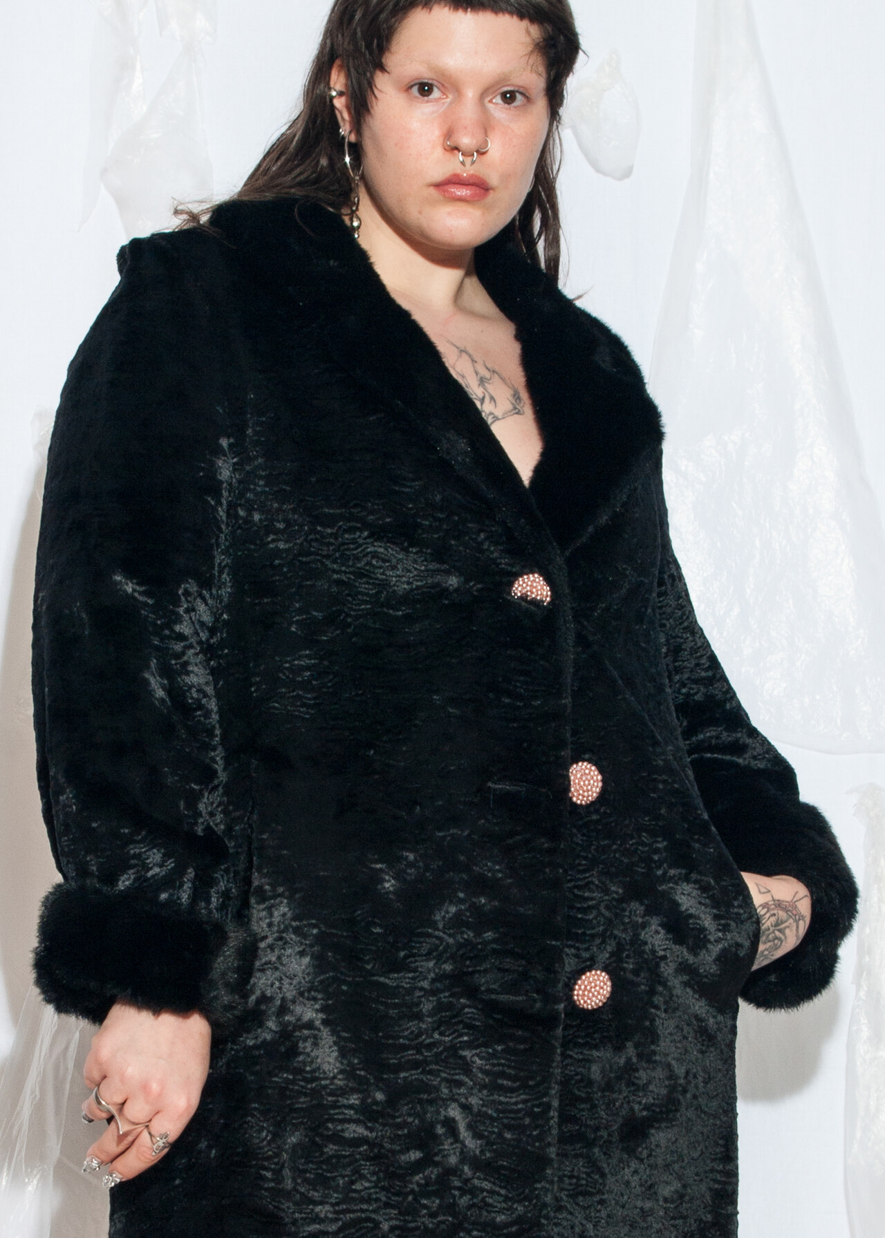 This 60s vintage coat by Kiss Créations is the ultimate faux fur hug from a shiny black plush universe, making winter feel like a chic French film.