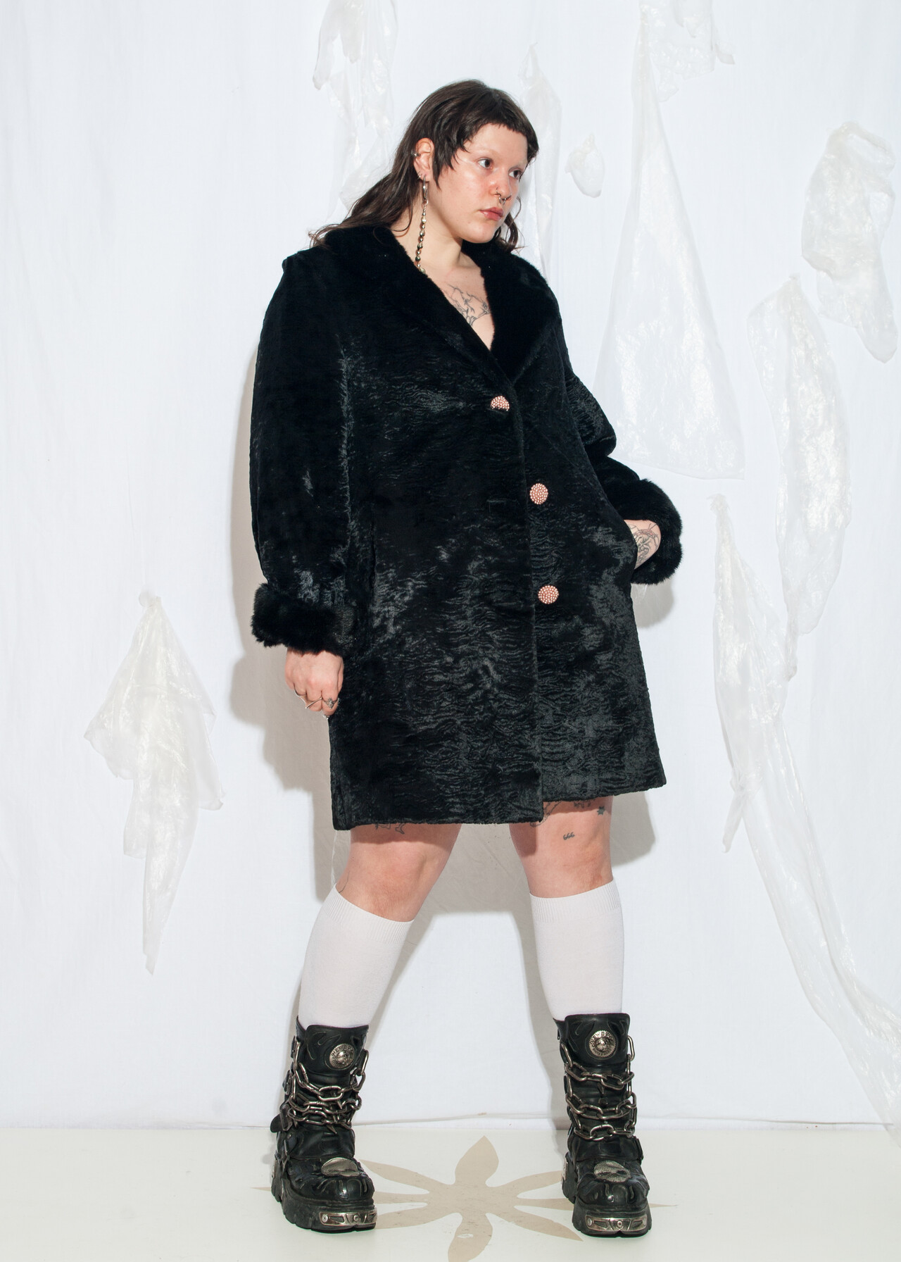 Tags: 60s vintage fashion, European vintage, faux fur coat, French brand, shiny black plush, whimsigoth, winter glam, y2k style outfit