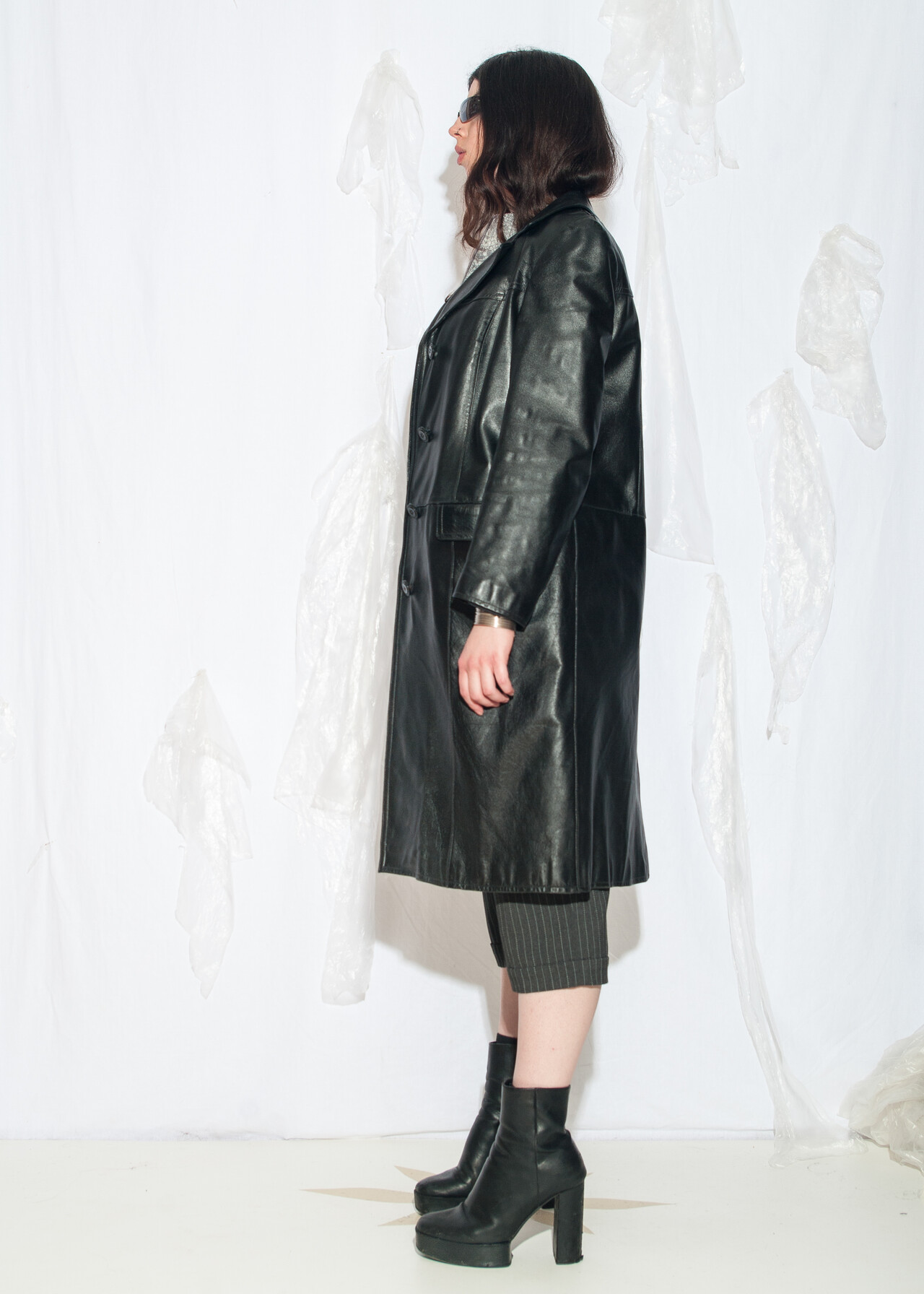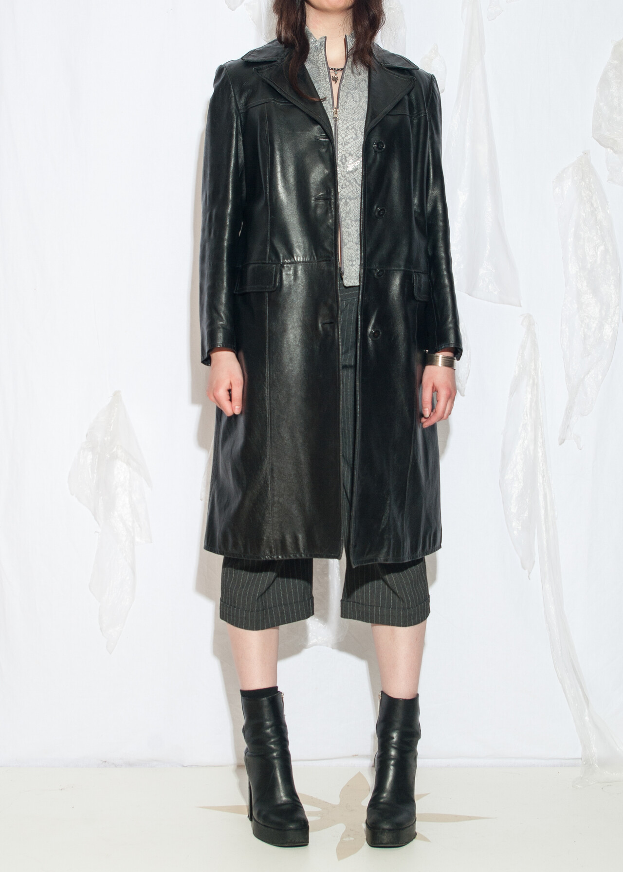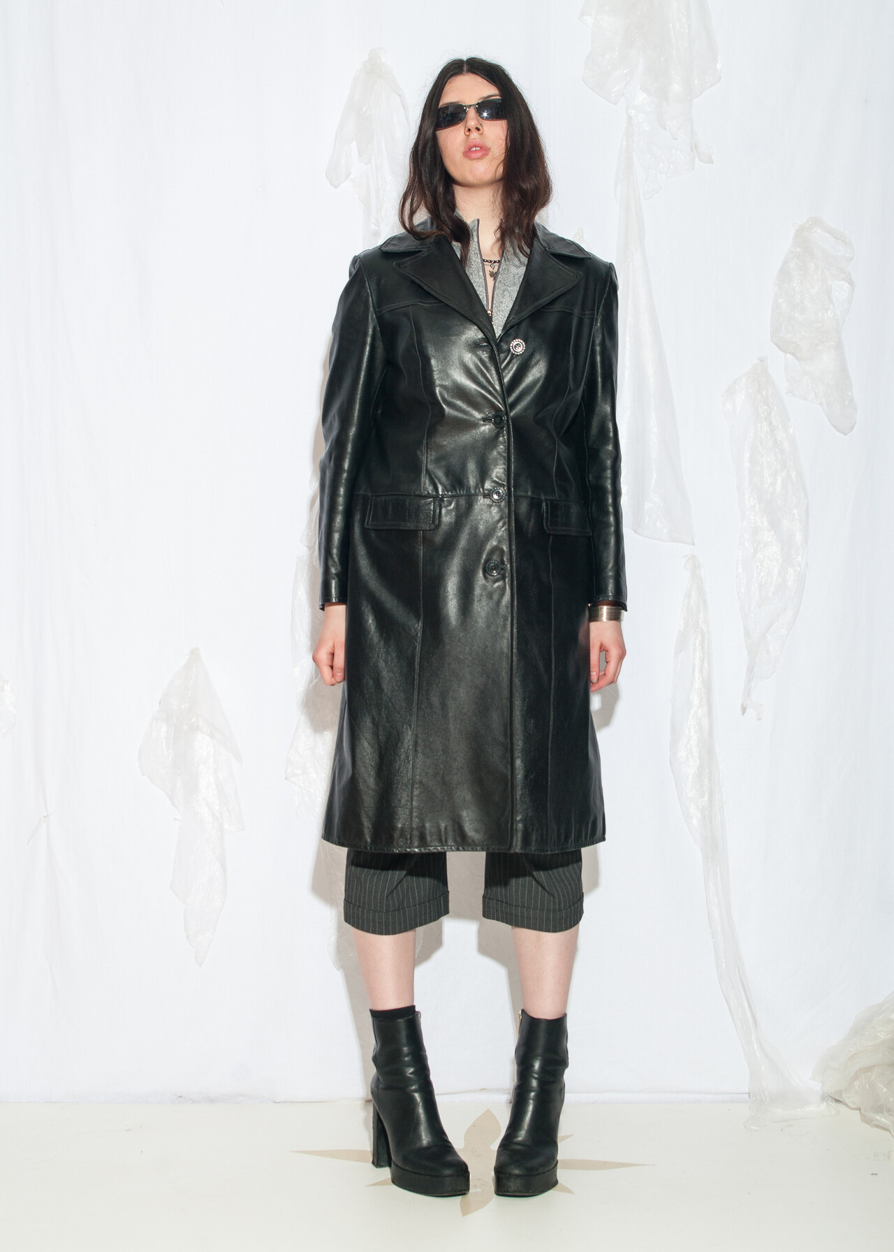Tags: 00s streetwear, 60s vintage clothing, European vintage, grunge outfit, long blazer cut coat, Matrix style jacket, minimalist look, real leather coat, whimsigoth, y2k style fashion