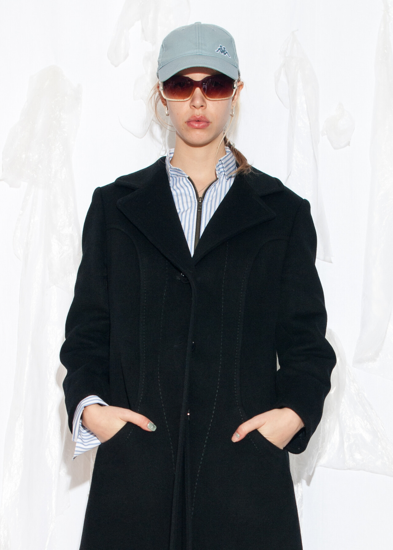 Tags: 70s vintage fashion, black long jacket, longline coat, minimalist aesthetic, Modell Velisch, office siren, tailored coat, warm winter coat, wool winter coat