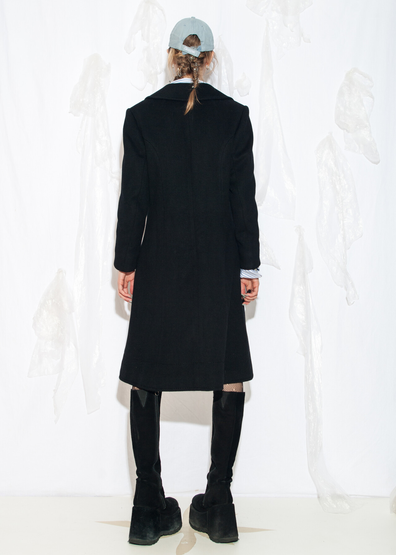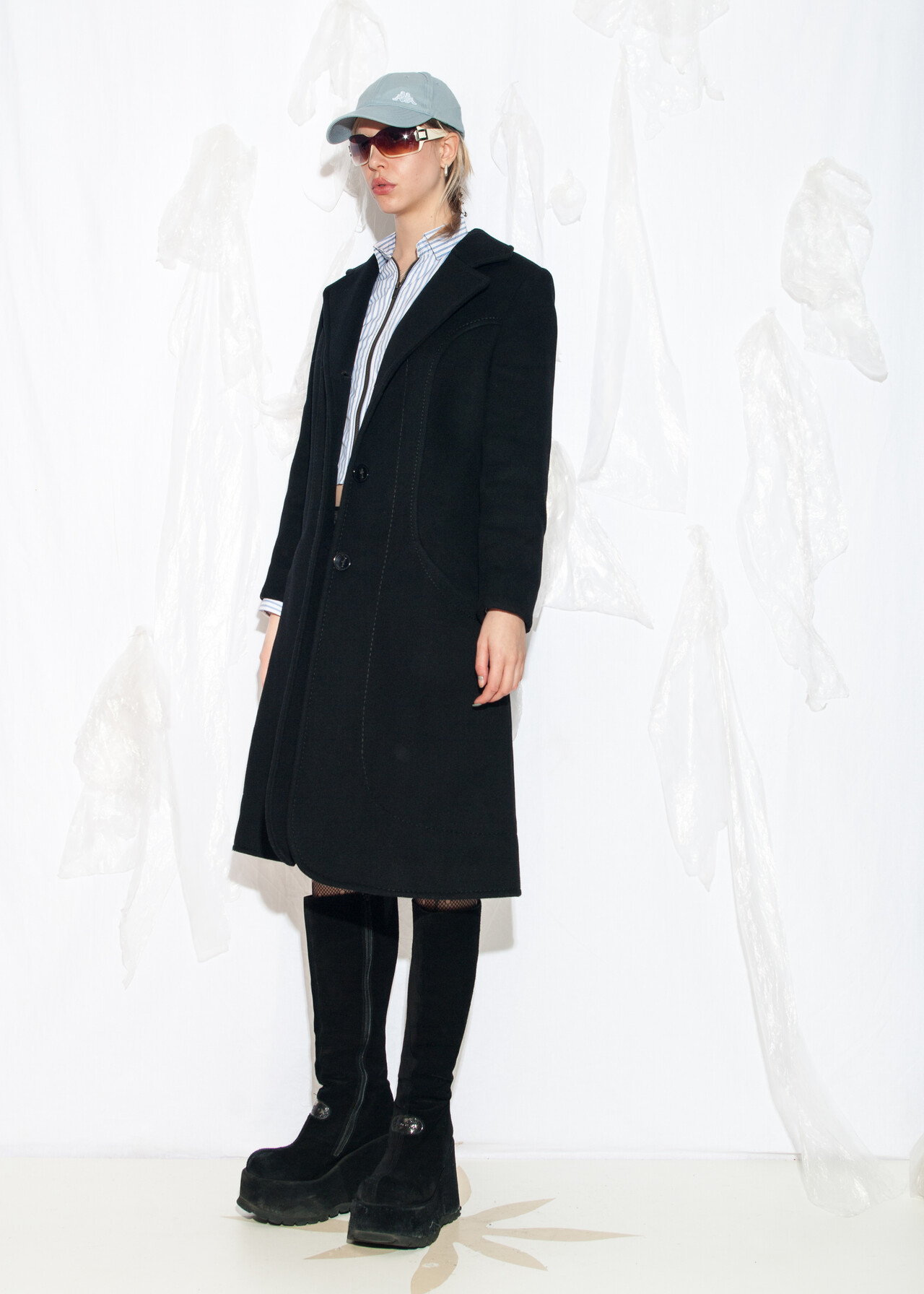 70s vintage wool winter coat – this black longline jacket is ready to wrap you in minimalist warmth.