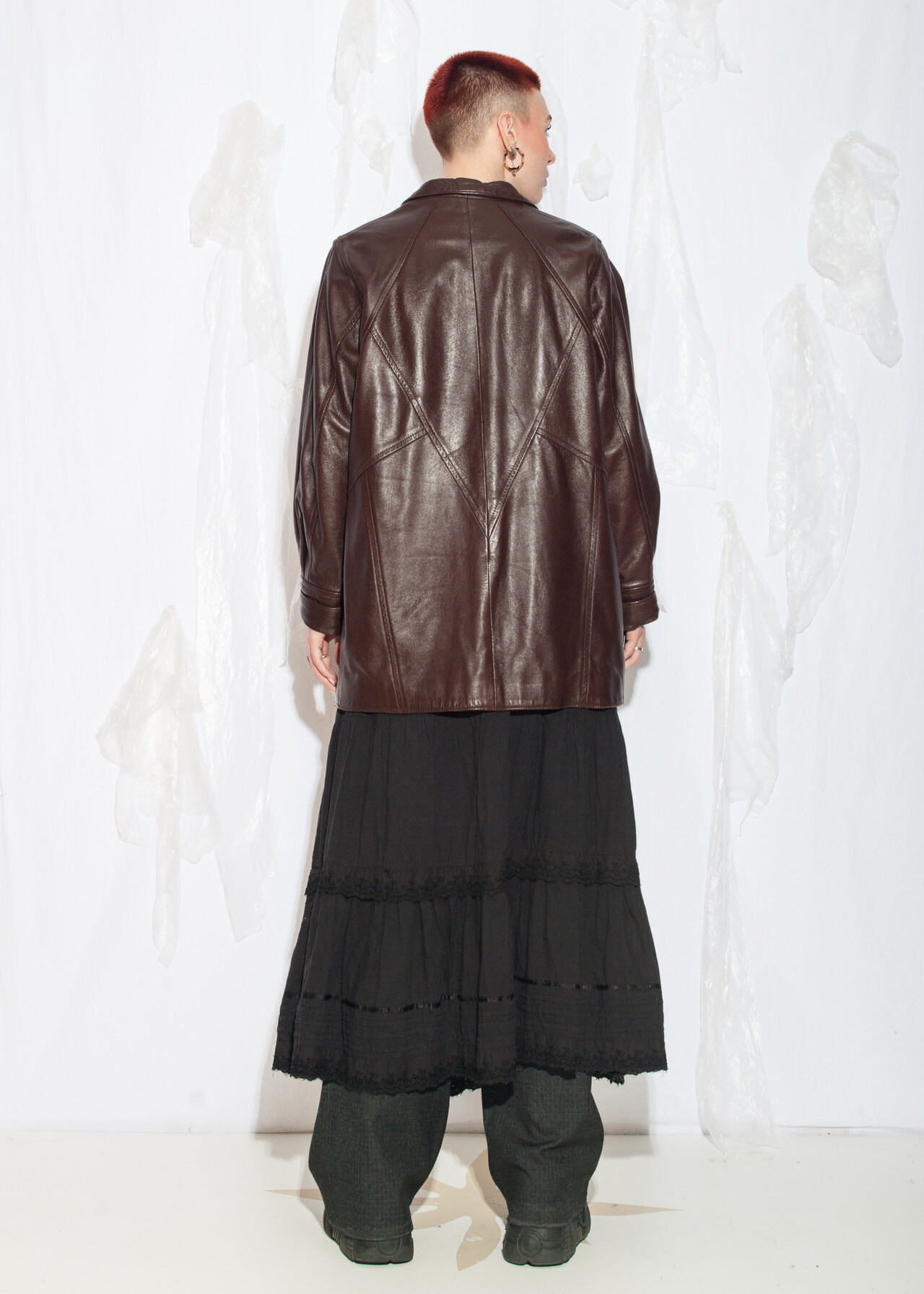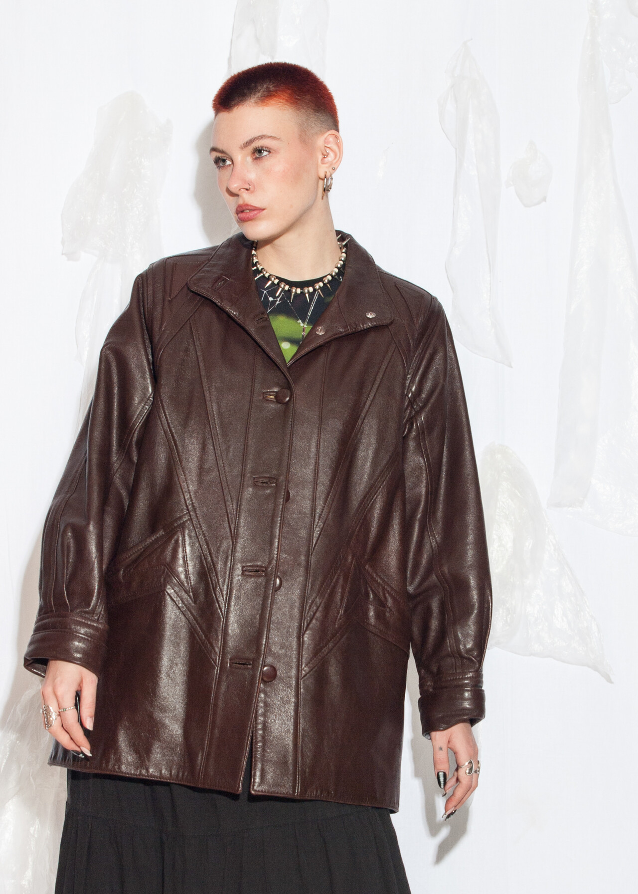 This 80s vintage coat is your ticket to grunge heaven with its oversized maroon brown leather vibes that scream “I just raided my cool aunt’s closet!”