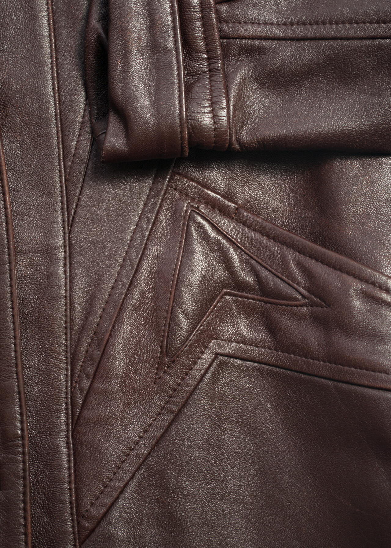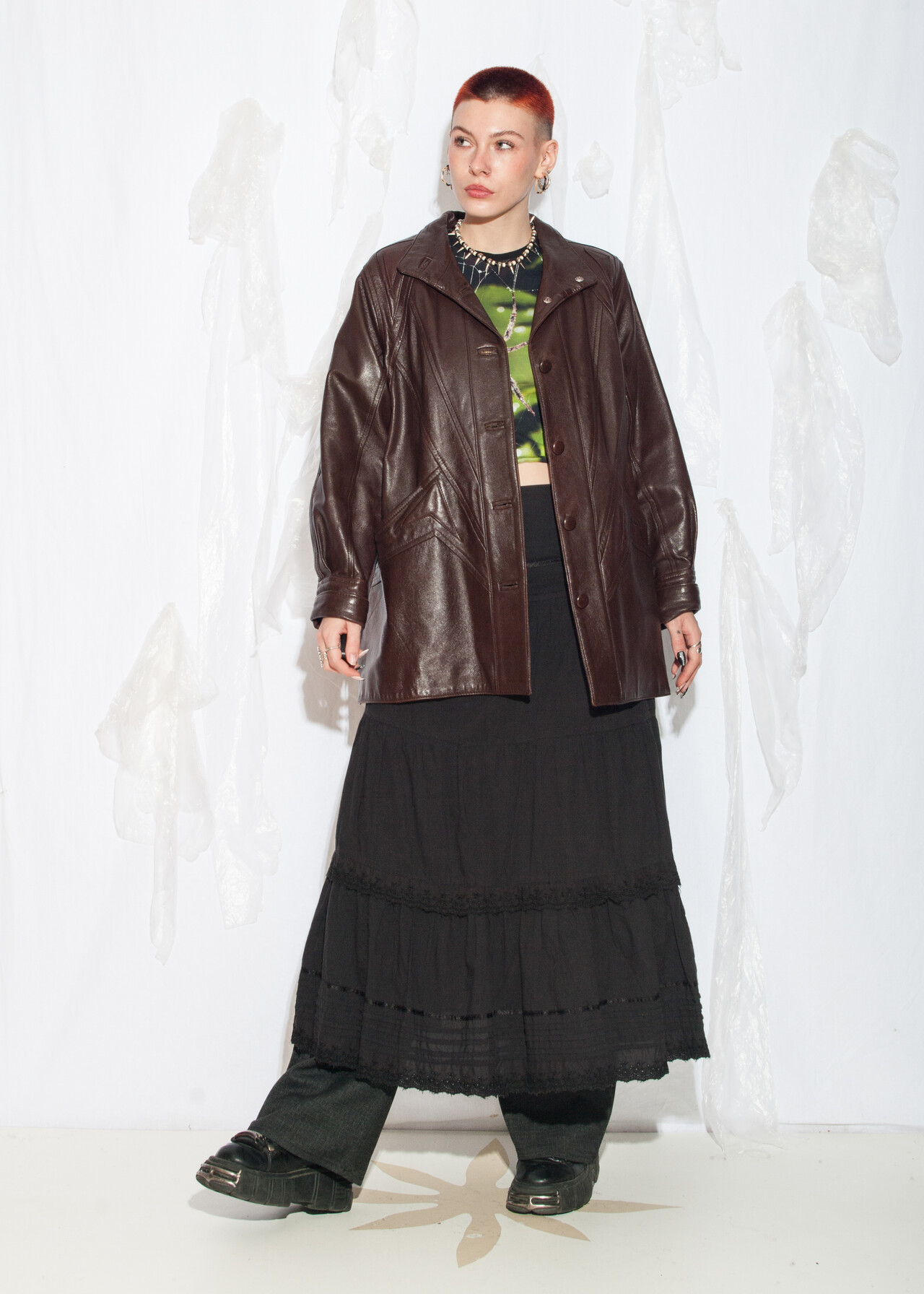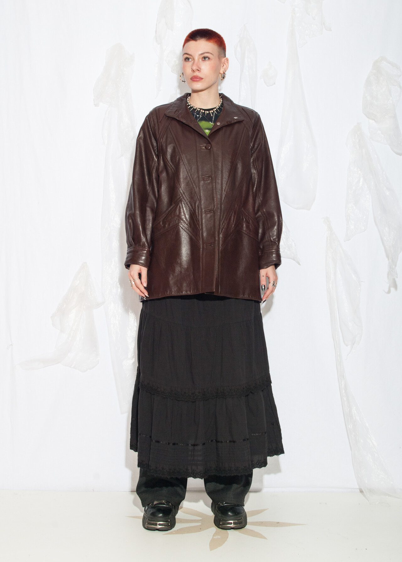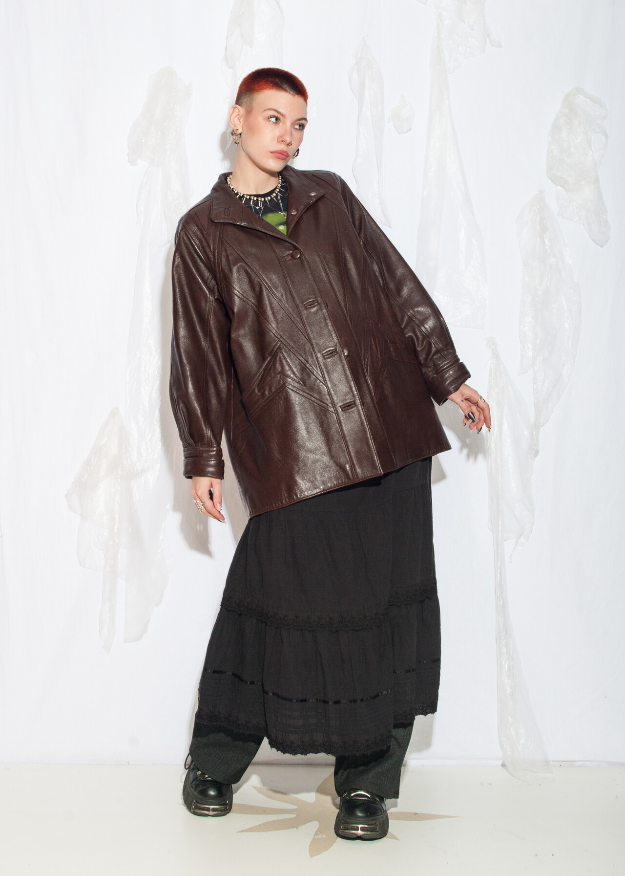 Tags: 80s vintage fashion, alt punk look, brown leather coat, chunky jacket, European vintage, maroon brown, oversized parka, whimsigoth, y2k grunge outfit