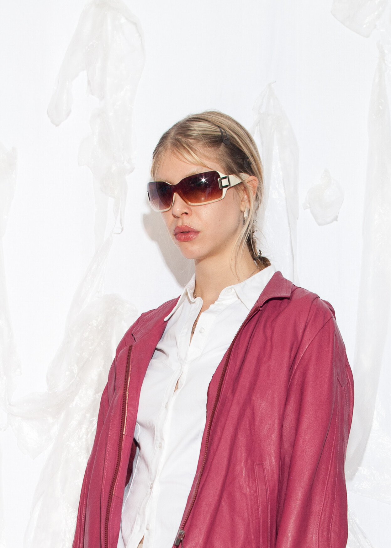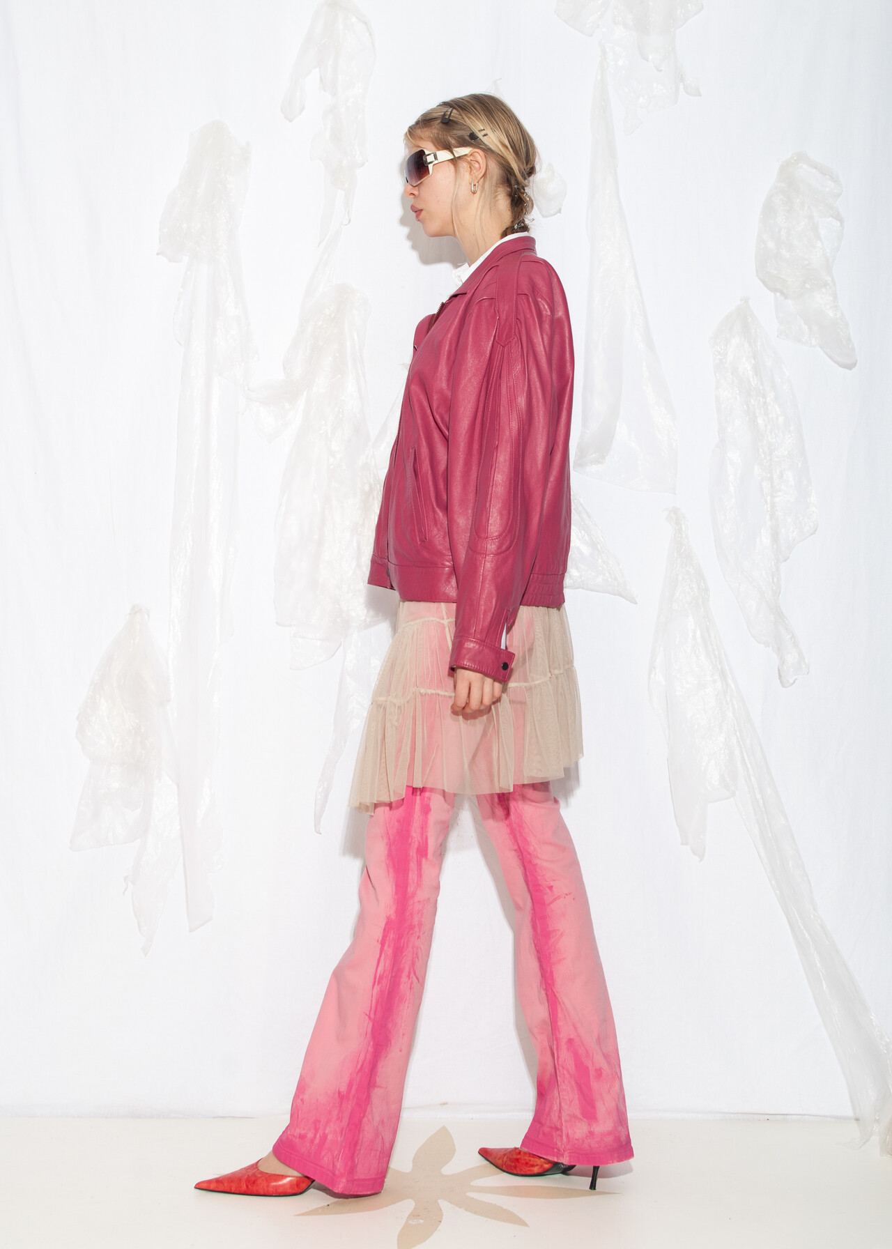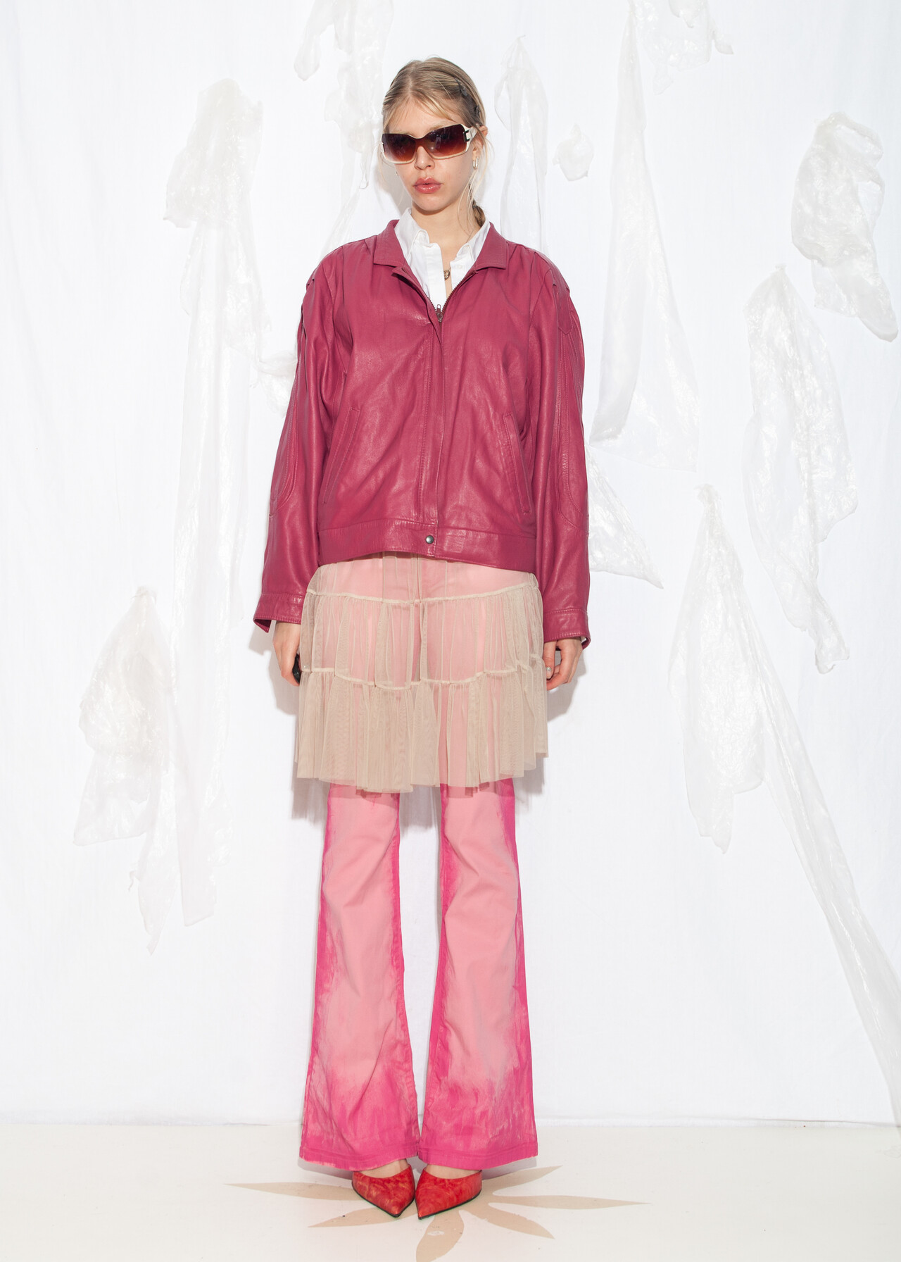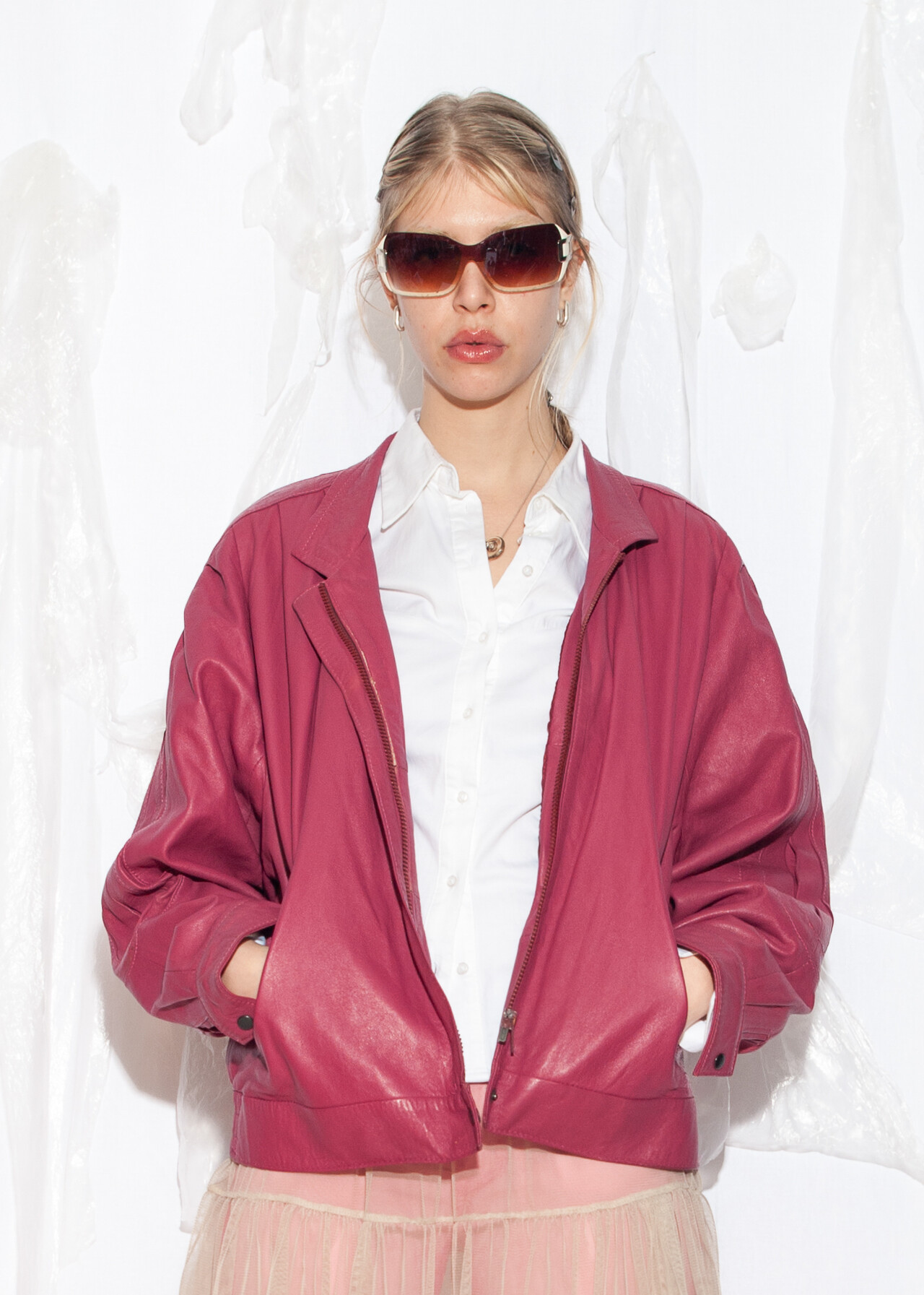 Tags: 80s vintage fashion, autumn womens coat, biker jacket, oversized jacket, pink bomber jacket, real leather coat, short coat, whimsi twee look, y2k grunge outfit
