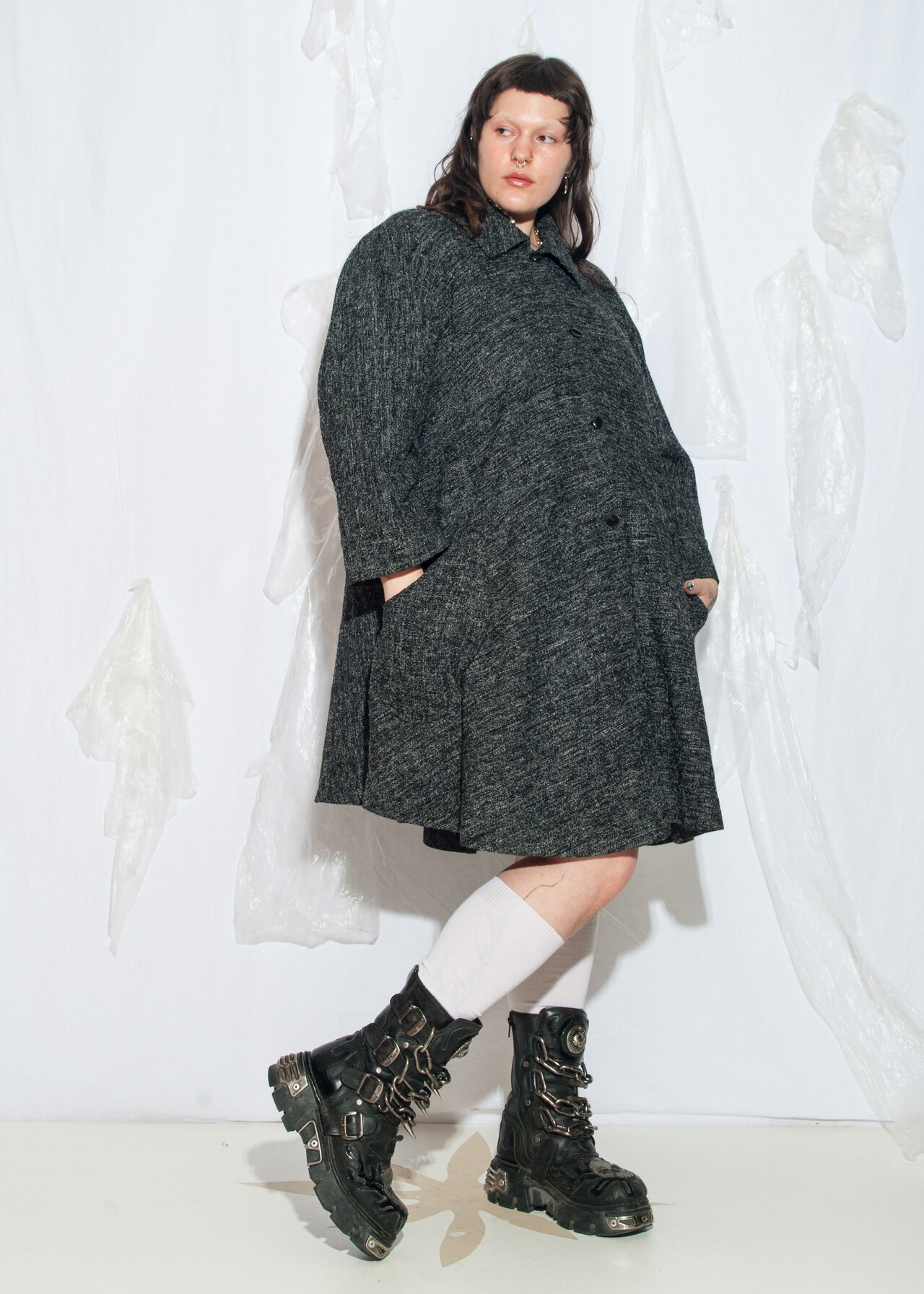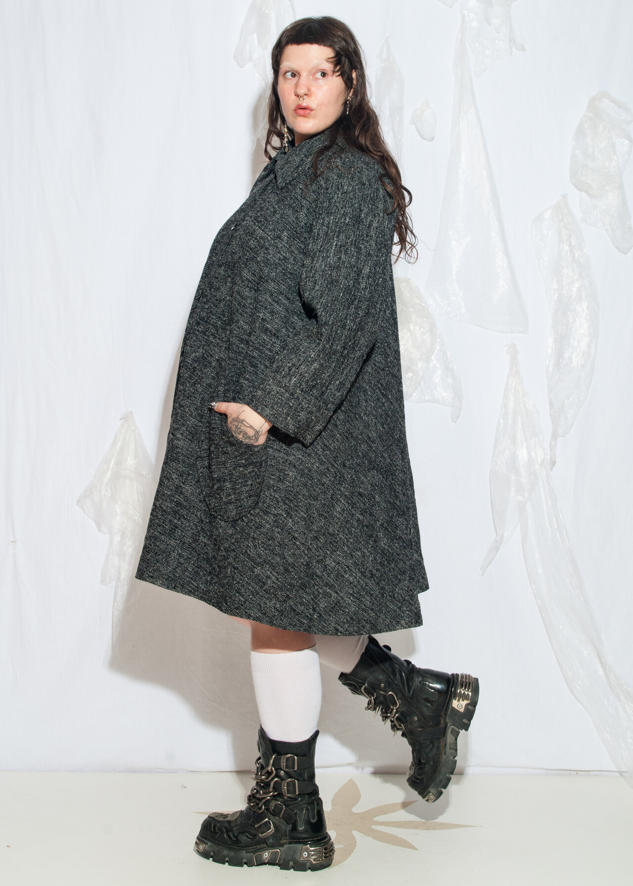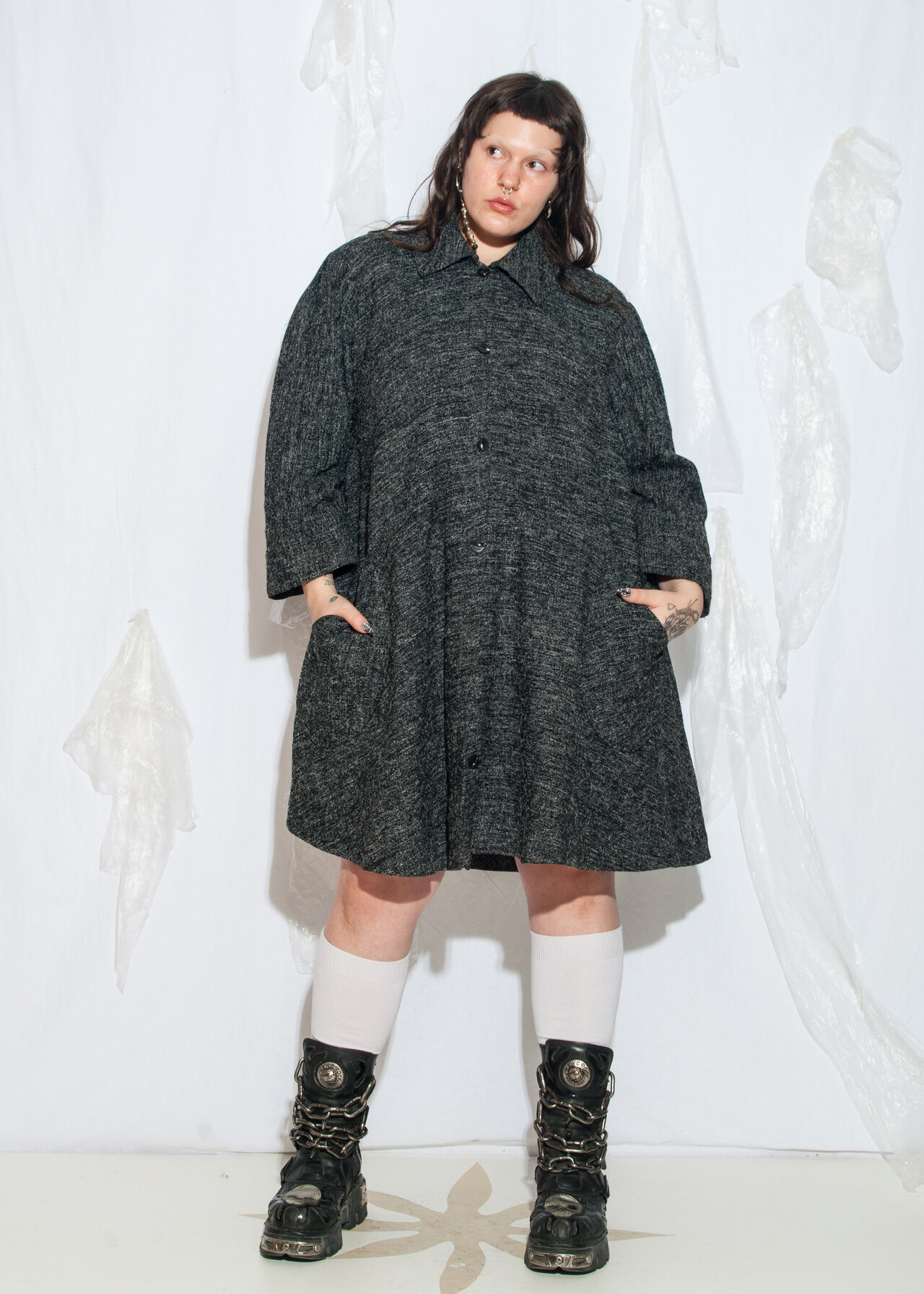 Tags: 1990s style fashion, 90s vintage clothing, A line coat, minimalist look, noisy pattern, office siren, plus size fashion, venus size vintage, whimsigoth, y2k grunge outfit