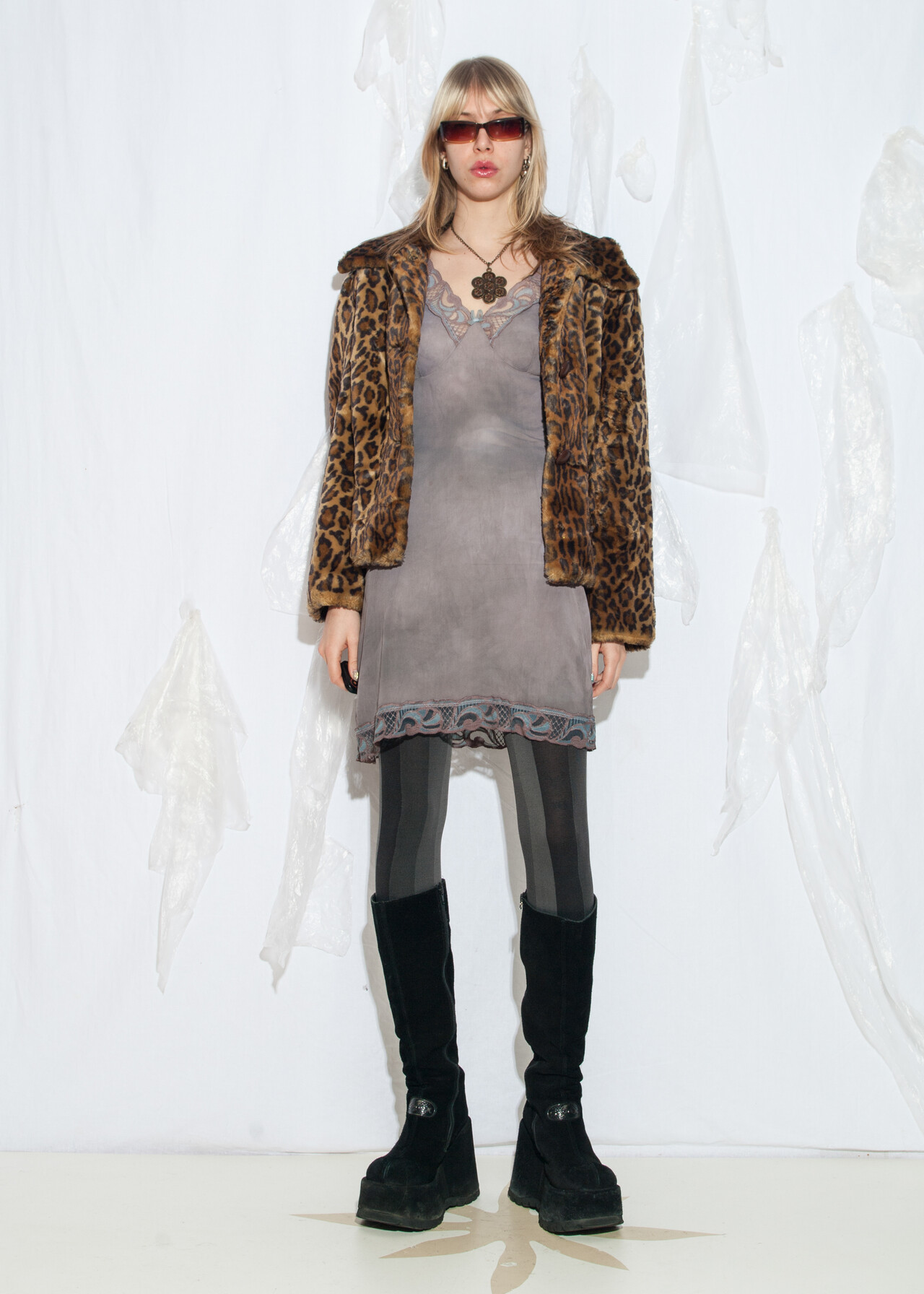 Tags: 90s vintage fashion, European vintage, faux fur jacket, indie sleaze, leopard pattern, made in Italy, ocelot print, slim fit coat, y2k grunge outfit