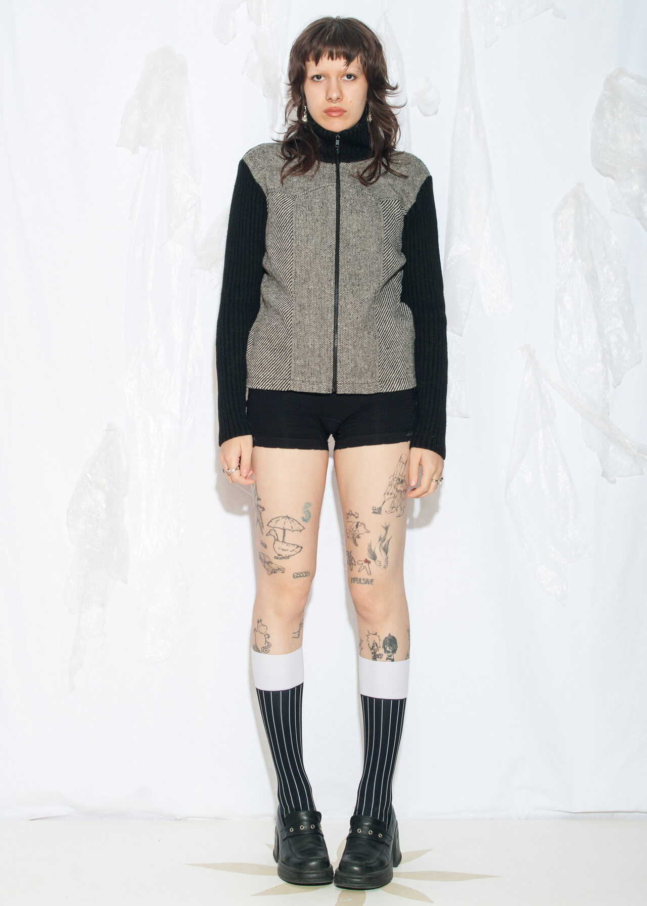 Tags: 90s vintage fashion, knitted jacket, slim fit jumper, wool blend coat, y2k grunge outfit, y2k style clothing, zip front sweater