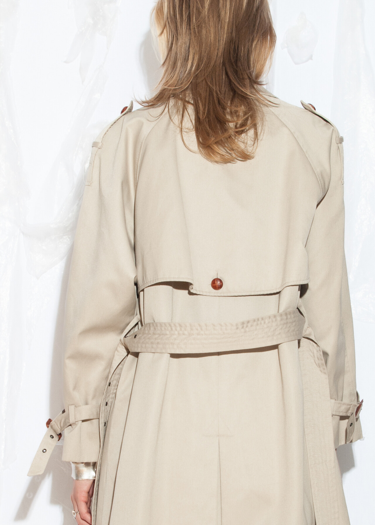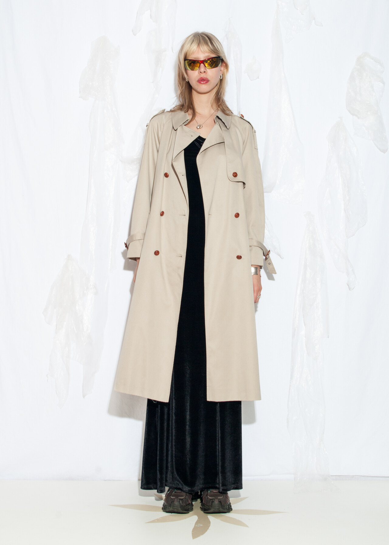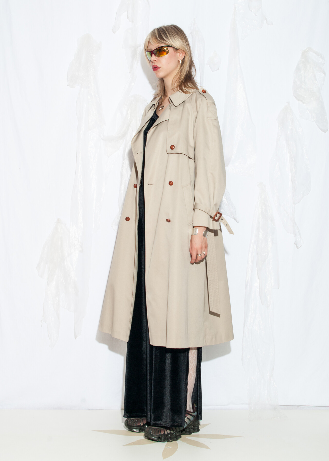 Tags: 90s vintage fashion, double breasted, long beige jacket, minimalist style, Nuage duster coat, trench coat, y2k grunge outfit
