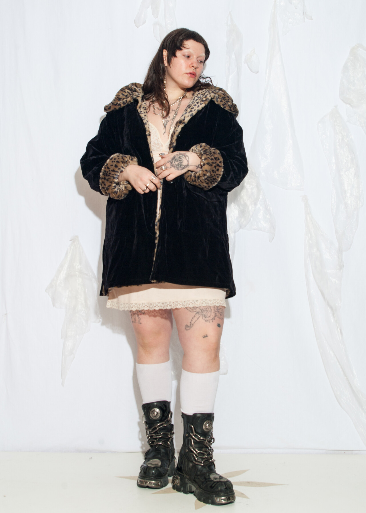 Tags: 2000s style fashion, faux fur coat, glam look, grunge outfit, leopard pattern, oversized jacket, plush fabric, reversible coat, y2k vintage clothing