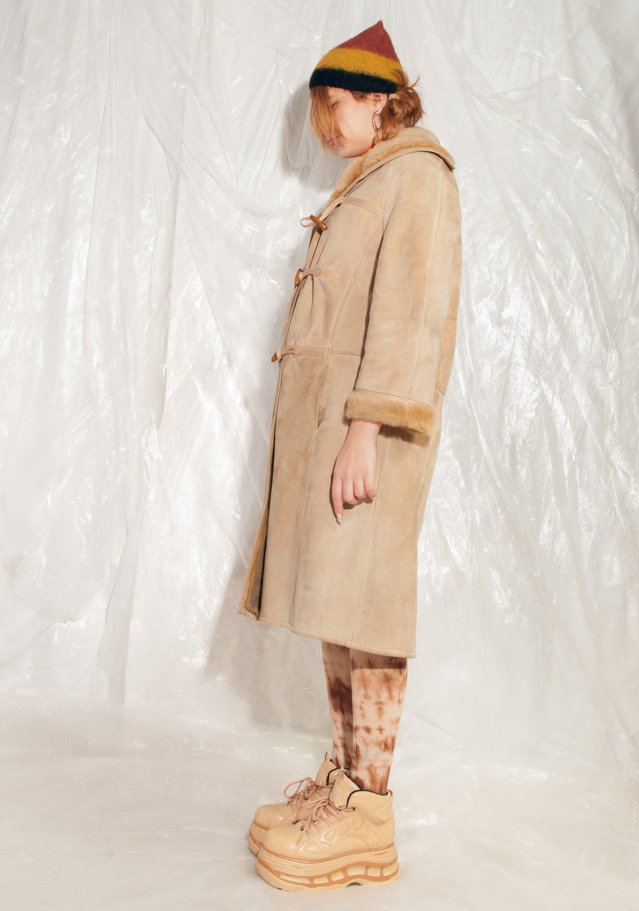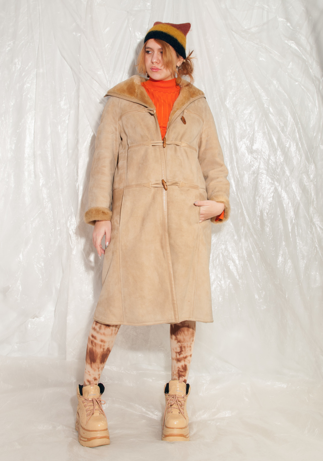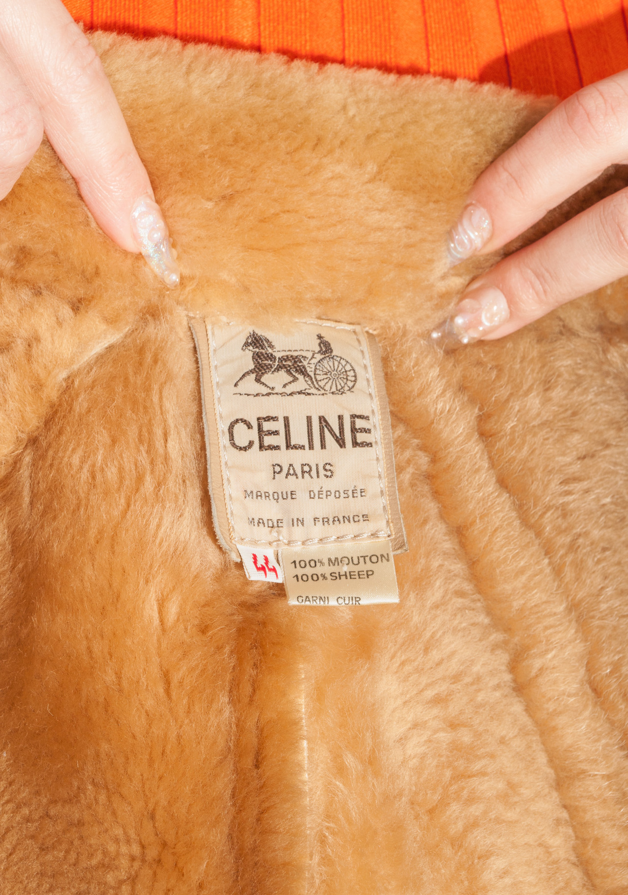 An authentic vintage Celine shearling coat from the 70s in mint condition. I still can’t believe the thrift gods blessed me with this one. It’s made of beige sheepskin with the softest fur inside and has two pockets and a button closure. We recommend it for an EU size 38-42 depending on the desired fit.