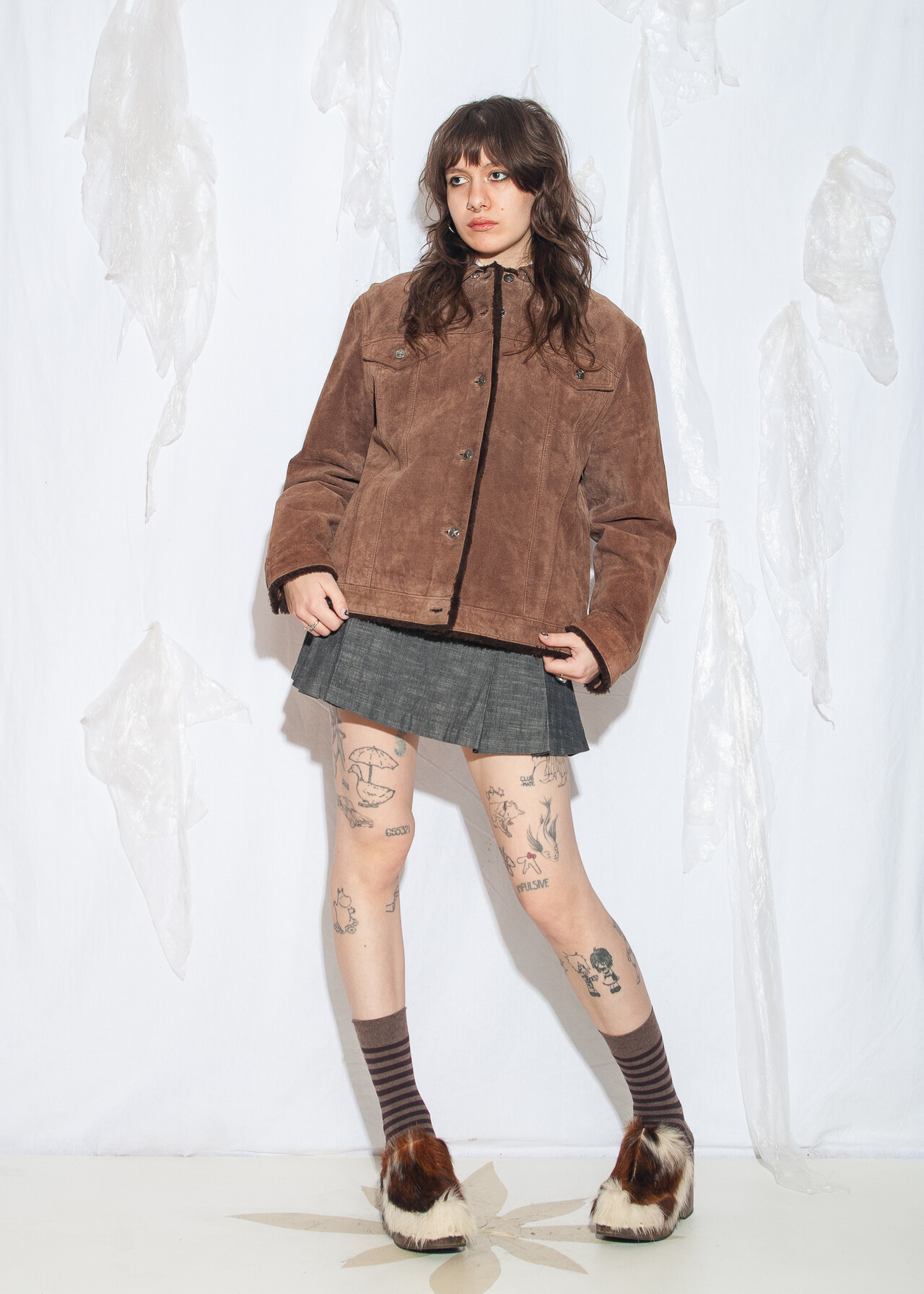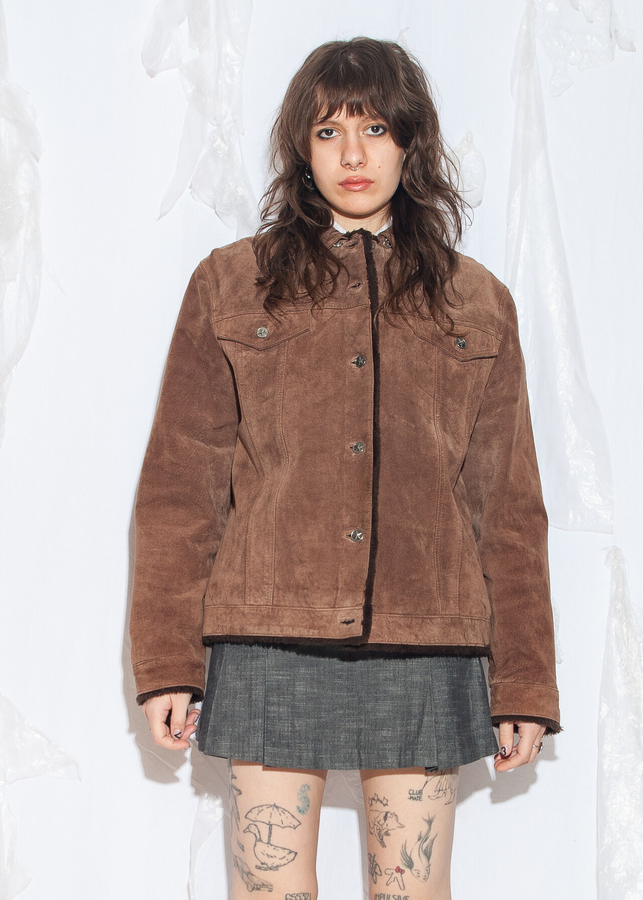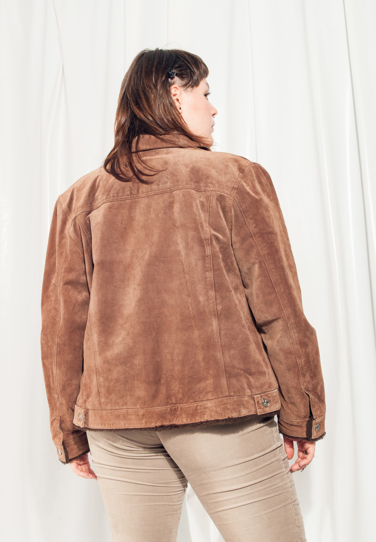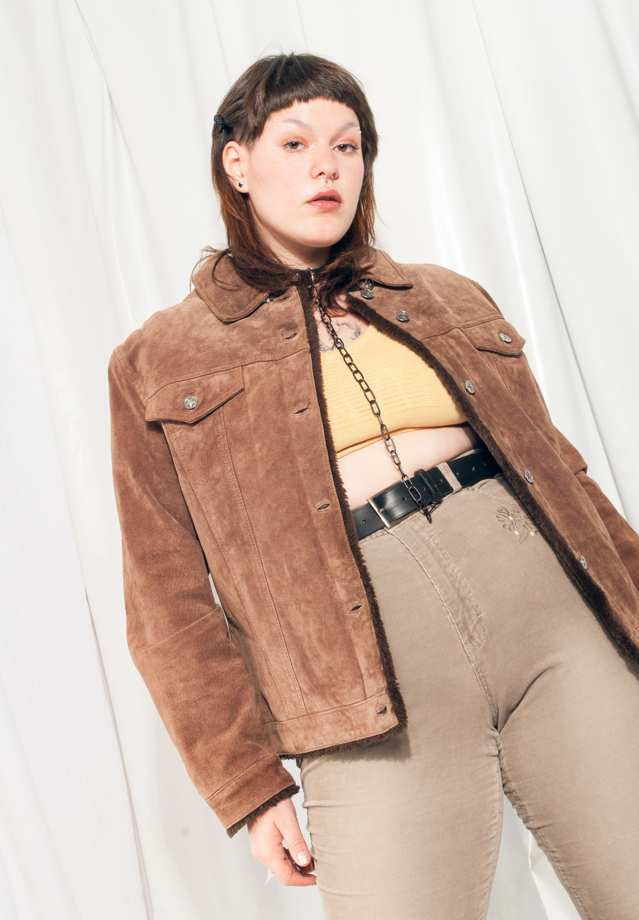 Say hi to this rad vintage leather jacket from the shiny 90s. We cleaned it for you both inside and outside, so it comes in mint condition. Made from genuine suede, this babe features the coolest cut, two pockets and button closure. It’s fully lined with faux fur. Get the vibe of those decades passed by — don’t hesitate, this piece of vintage clothing is a one-off chance.