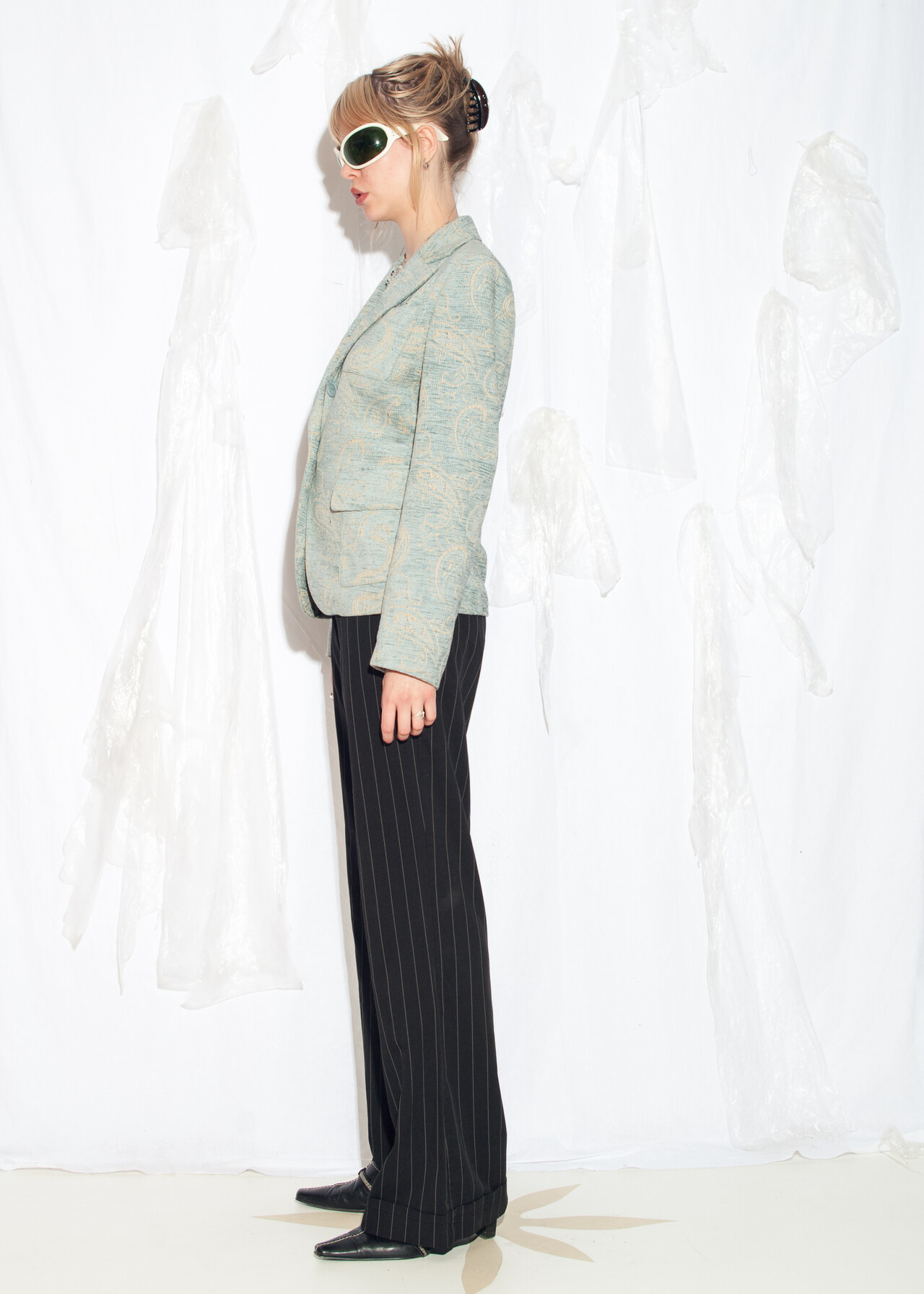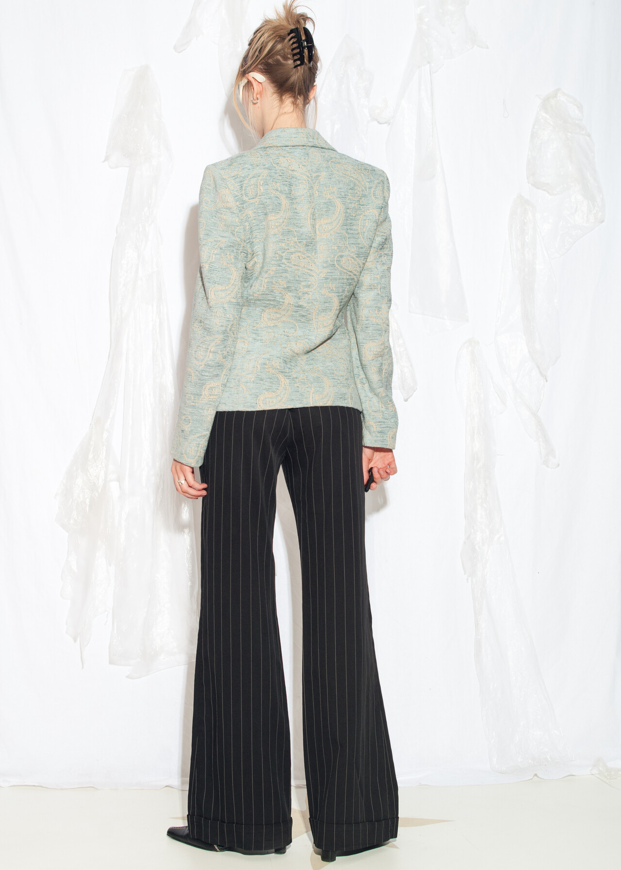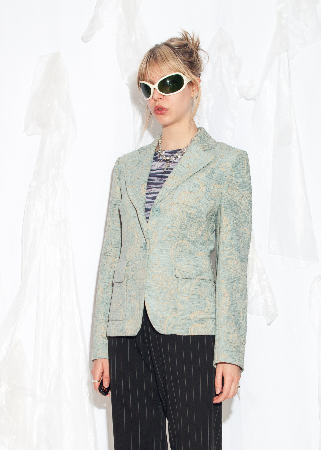 Tags: 2000s style fashion, baroque pattern, fitted blazer, office siren, y2k vintage clothing