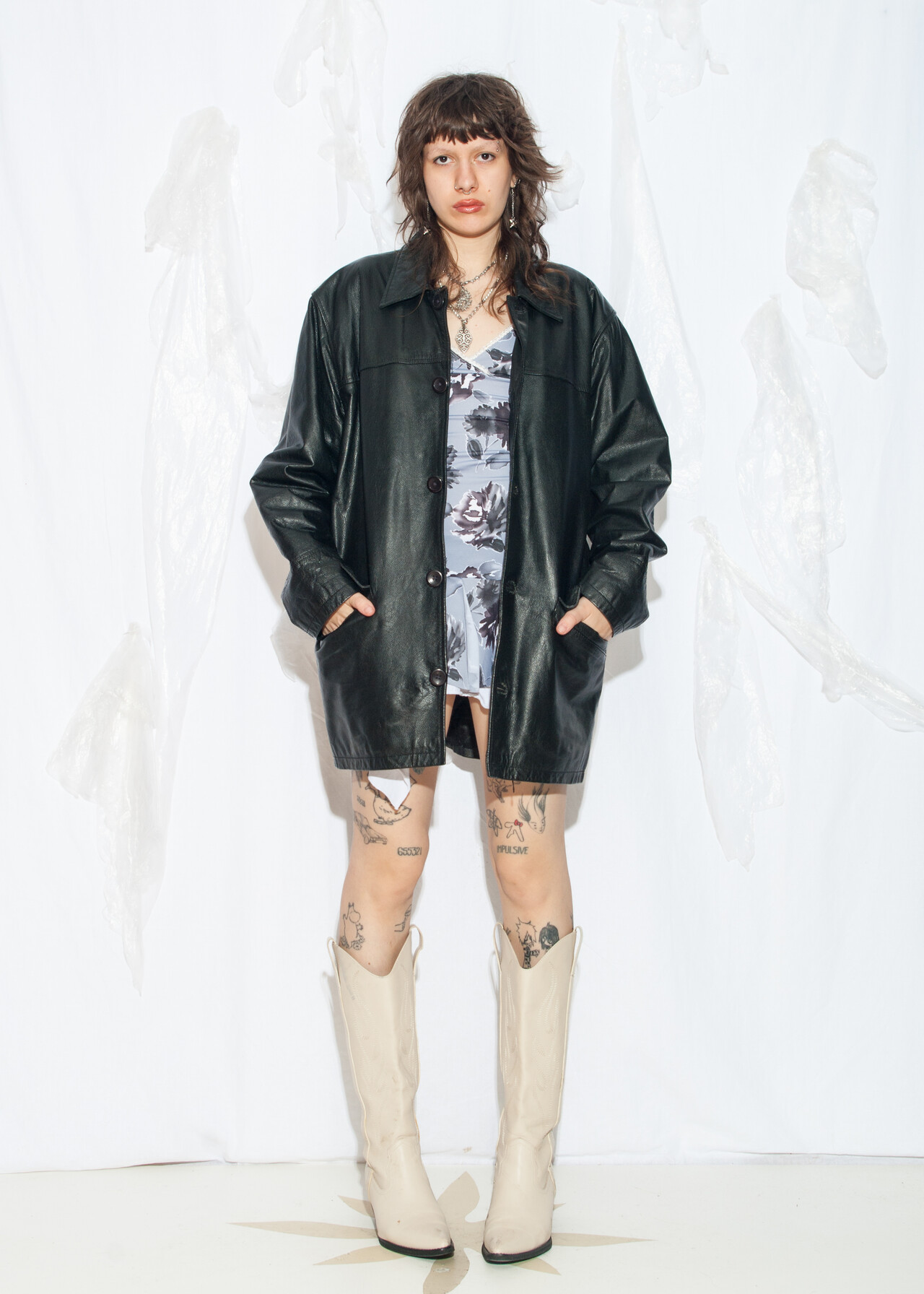 This Y2K vintage boyfriend leather coat is your ticket to reliving the 2000s, complete with a boxy fit that’s as grandpacore as it gets!