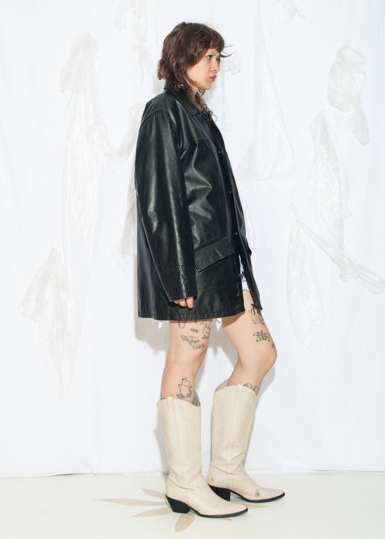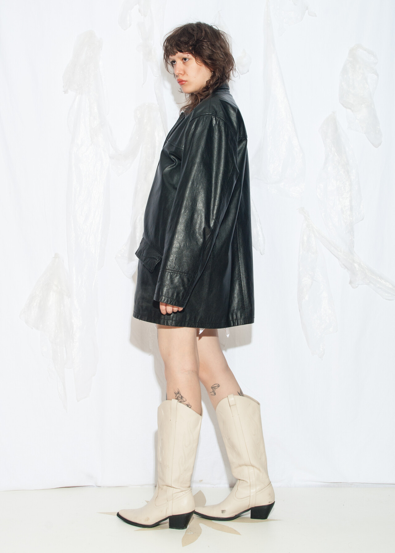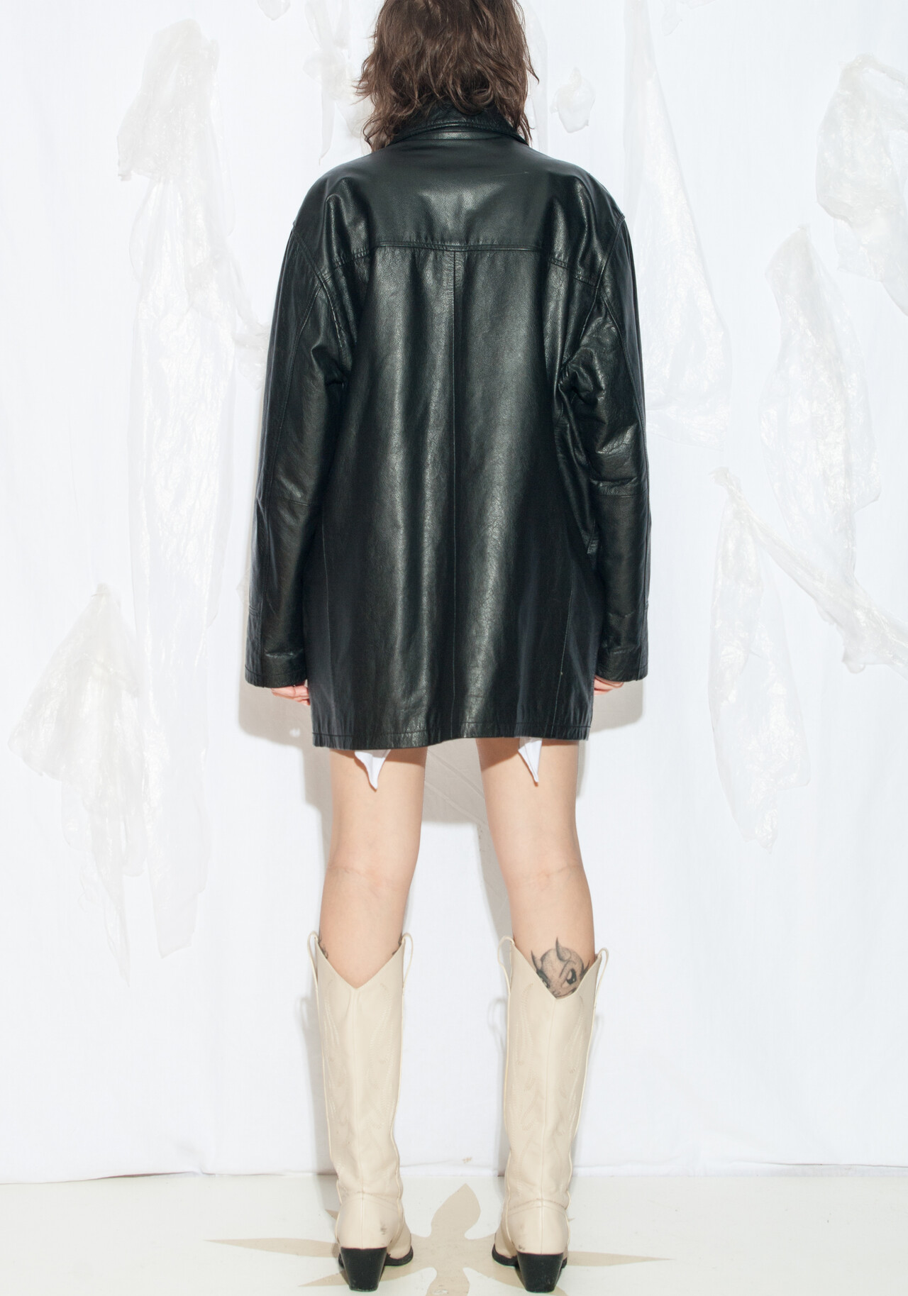 Vintage Y2K Boxy Fit Leather Coat in Black