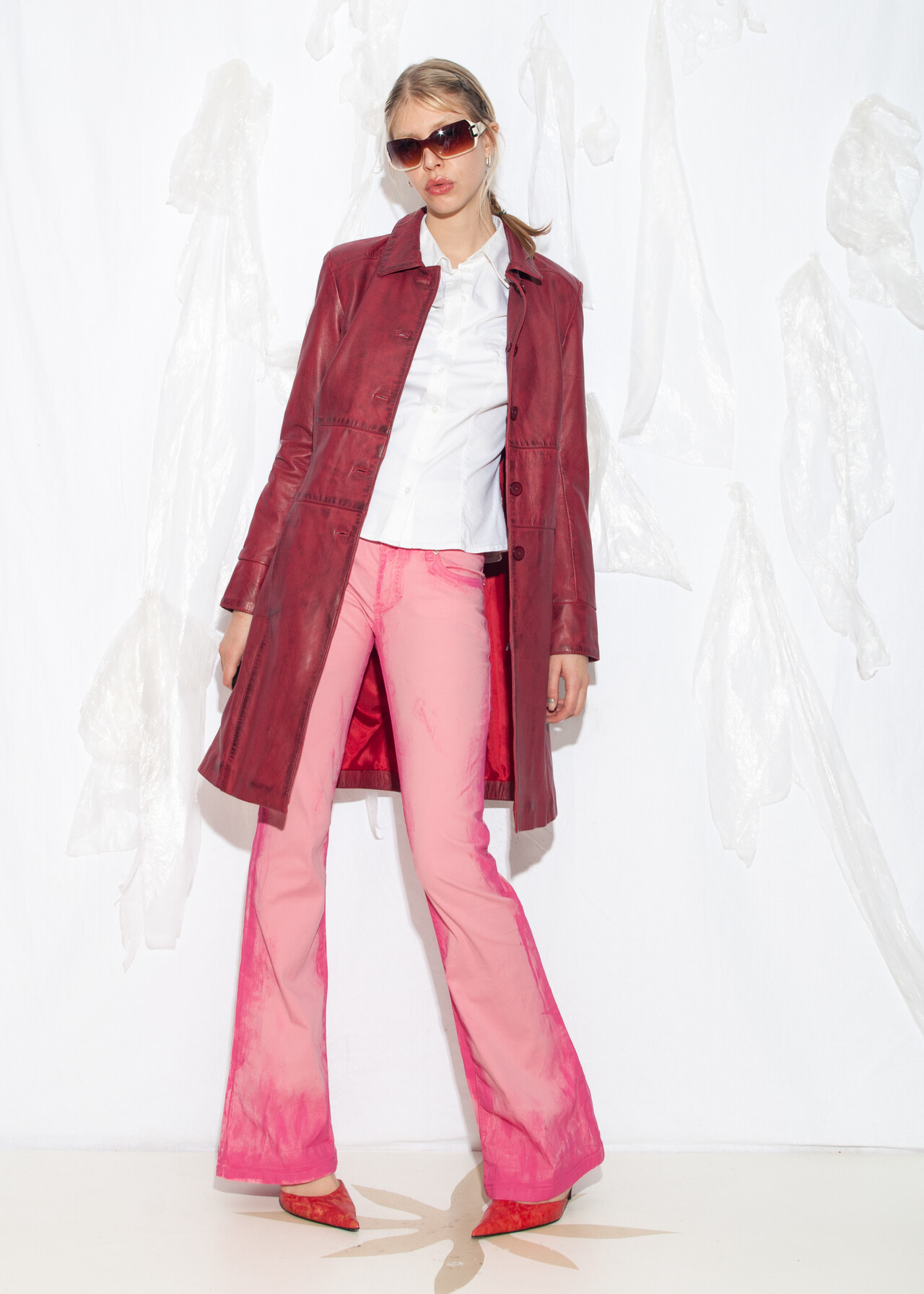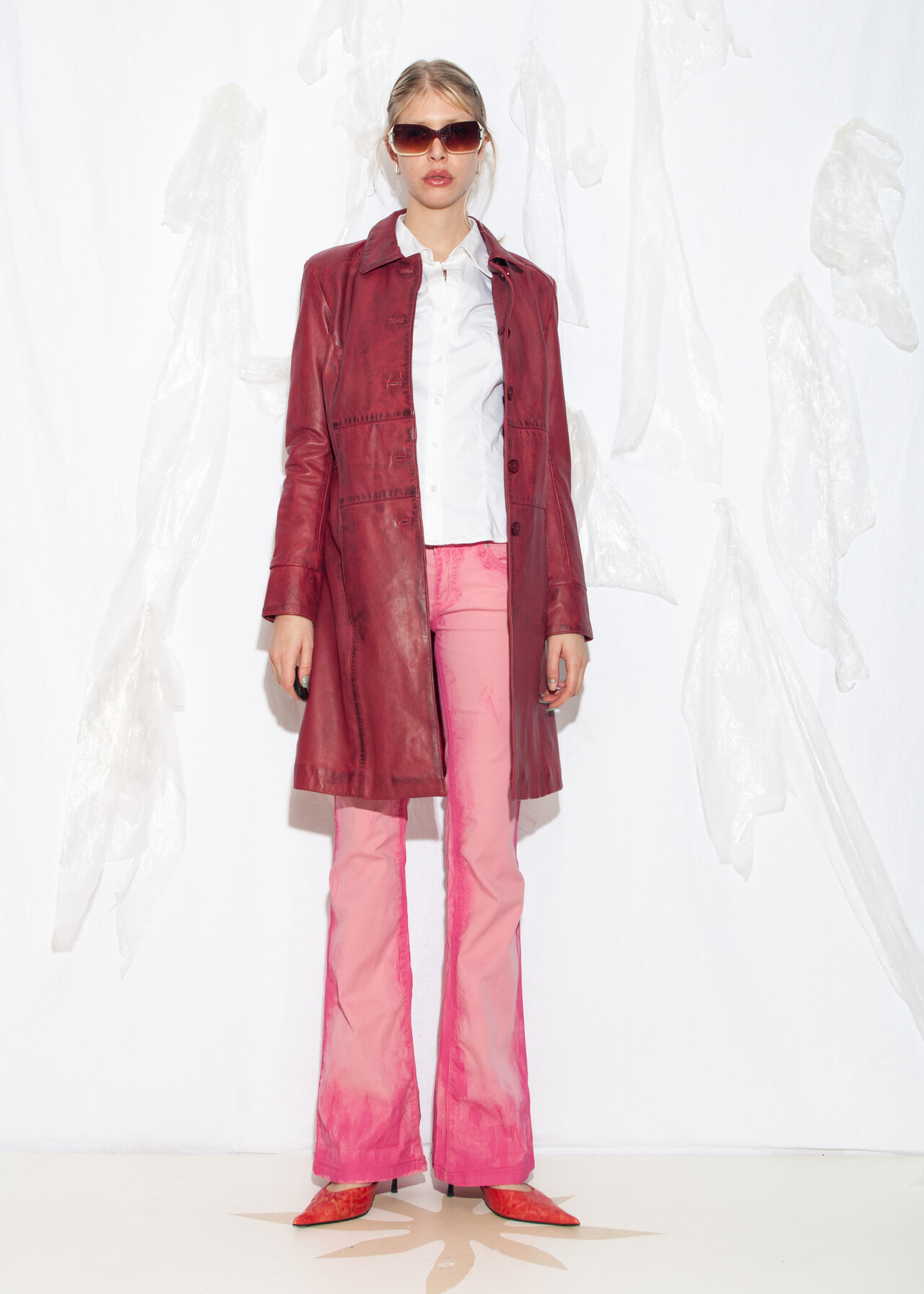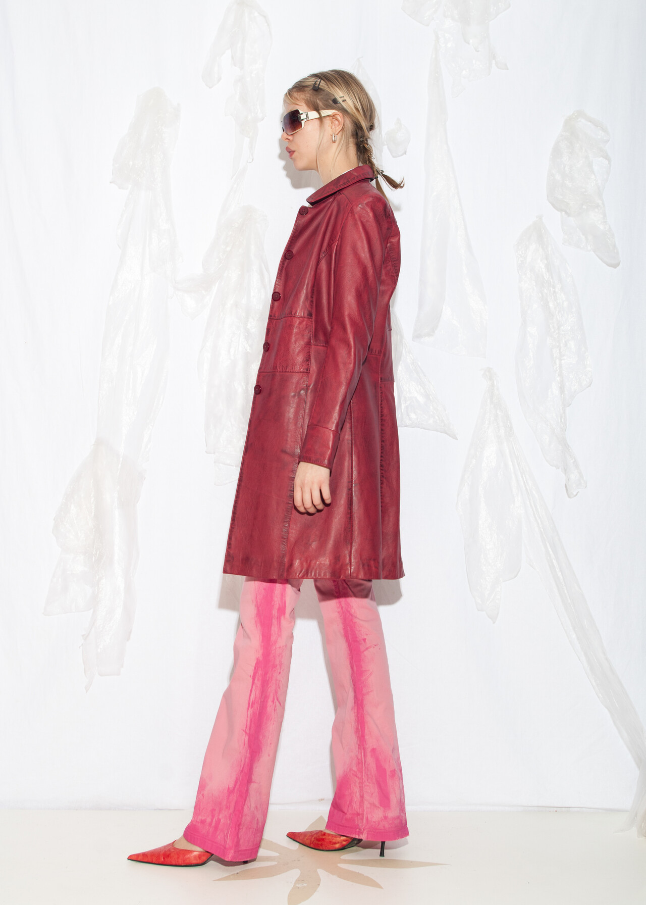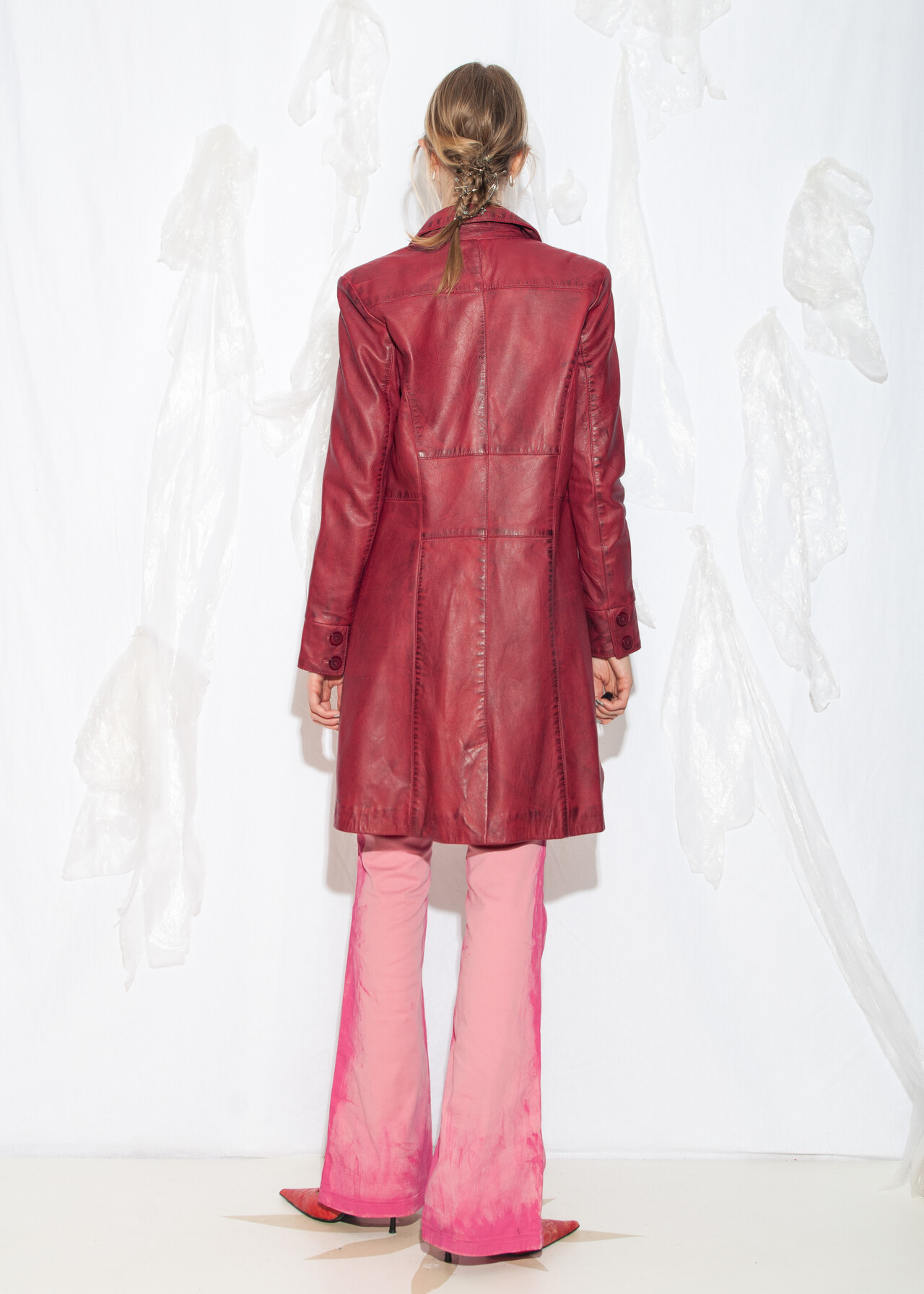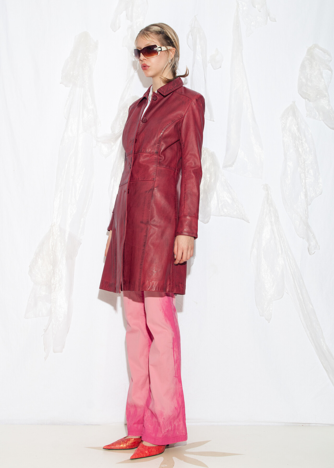 This Y2K vintage maroon coat is the ultimate ticket to the era of flip phones and frosted tips, with its dirty look and leather trench vibe ready to make you feel like an office siren who’s just escaped a 2000s rom-com.