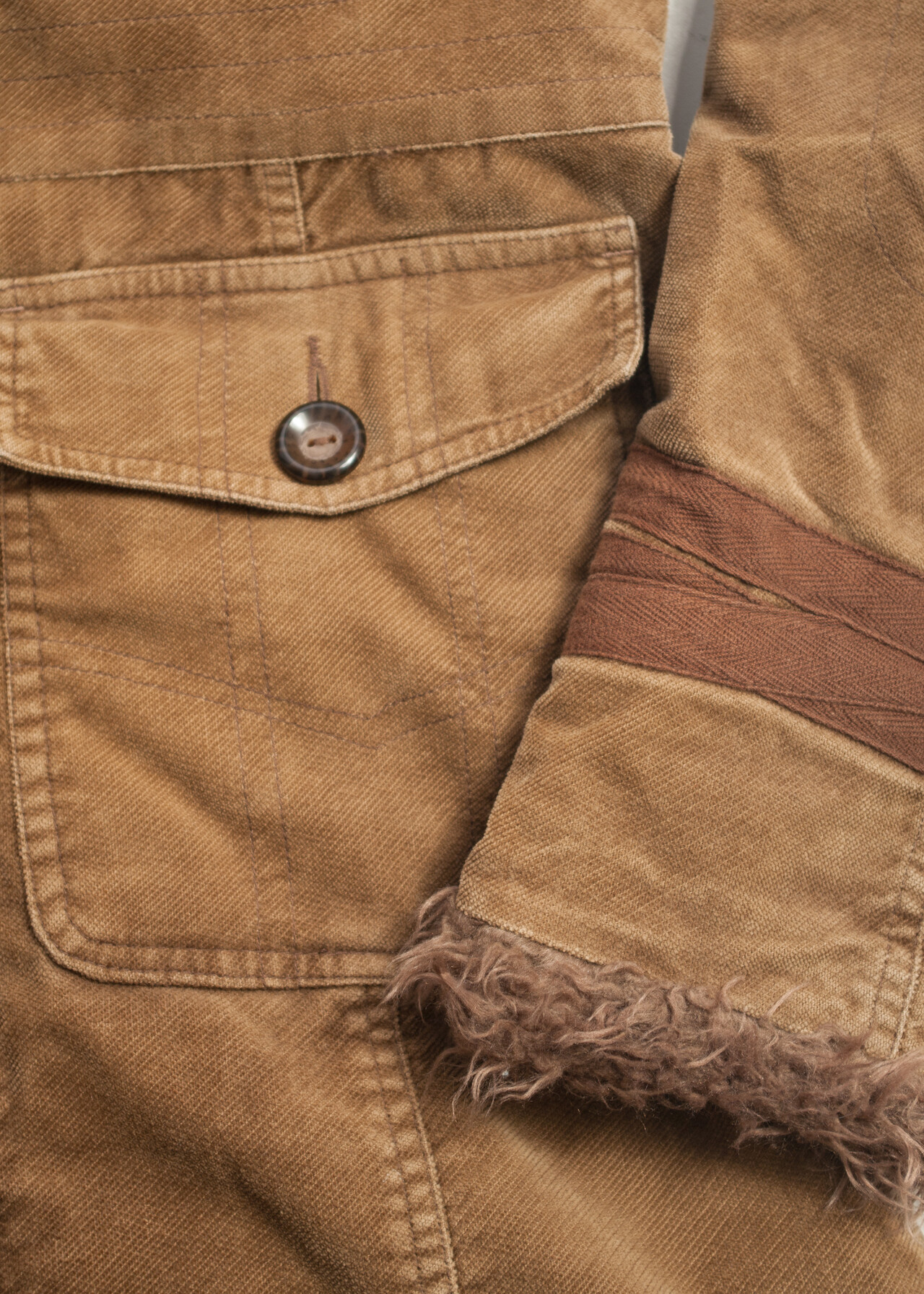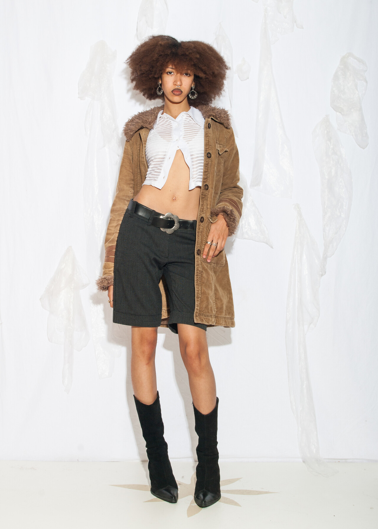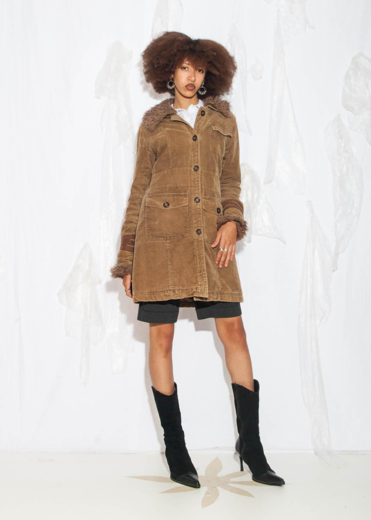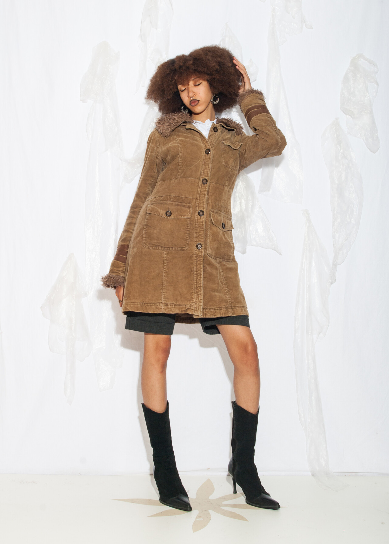 Tags: 2000s style clothing, faux shearling coat, long cord jacket, natural brown cotton, slim fit coat, whimsigoth, y2k vintage fashion
