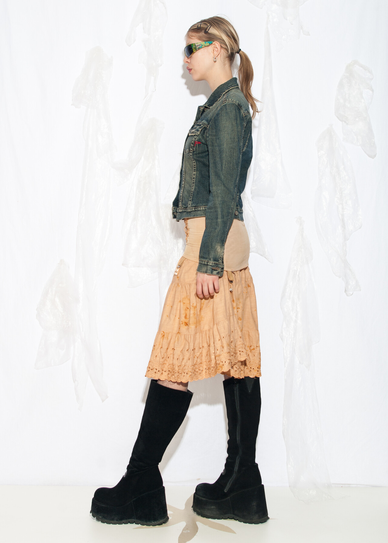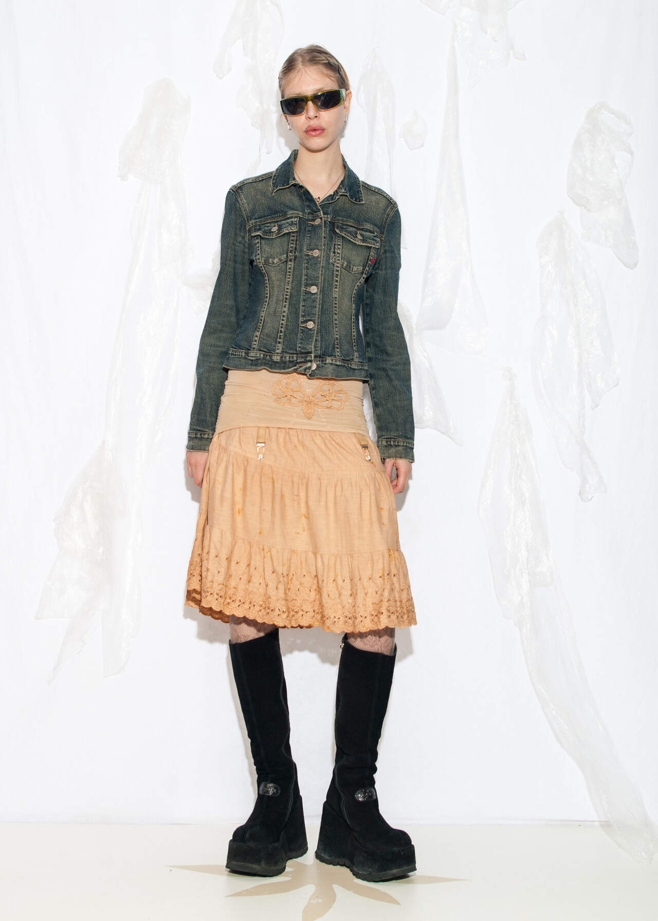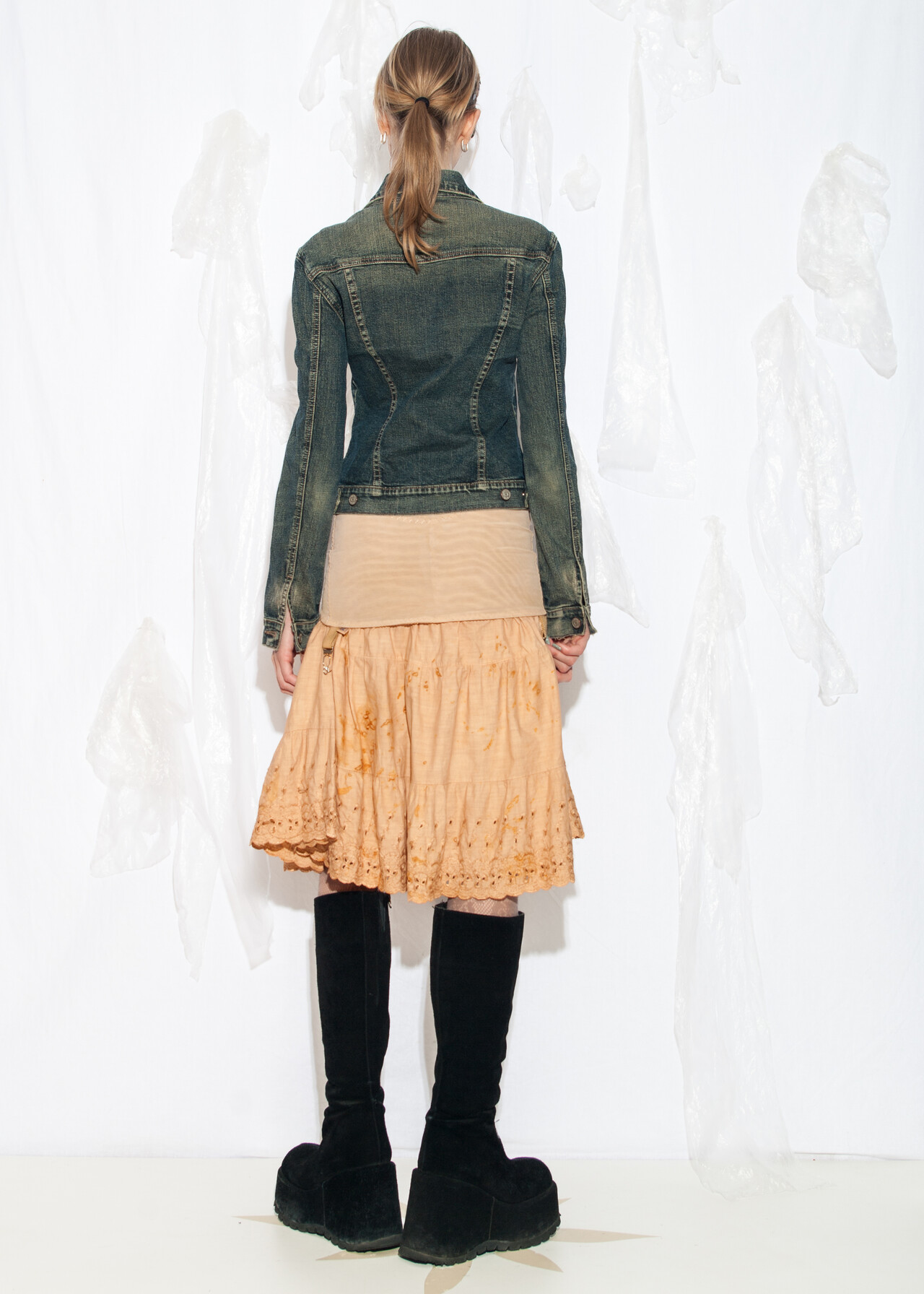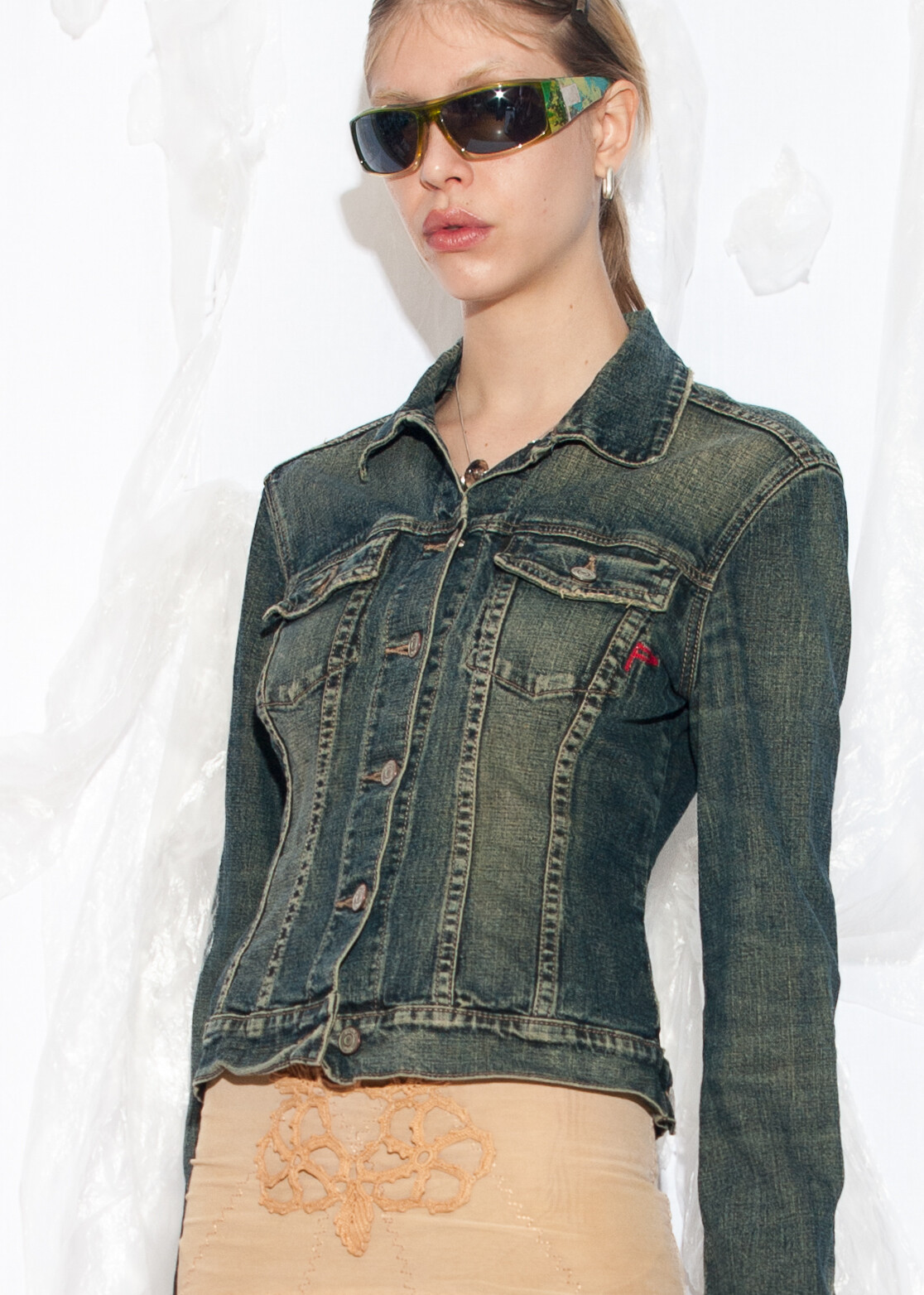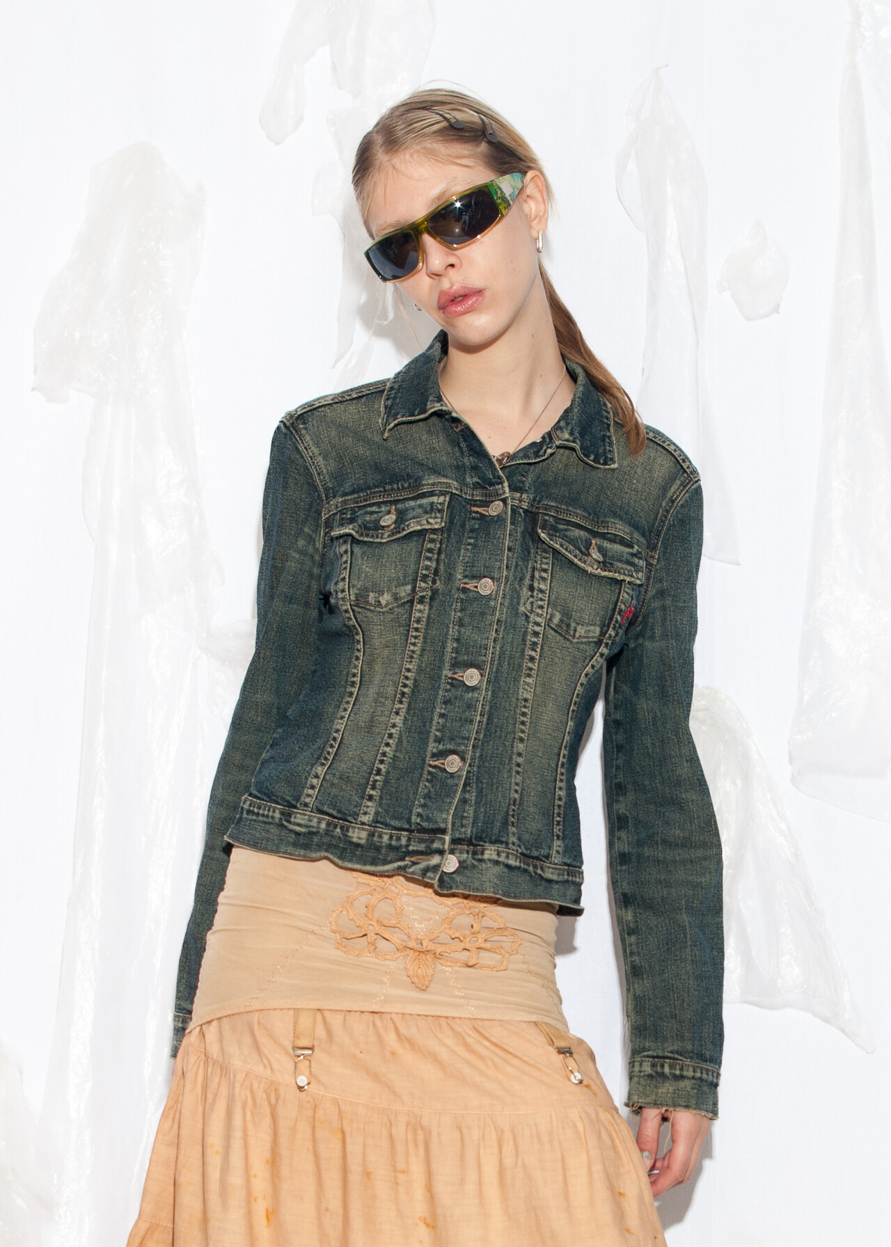 Tags: 00s streetwear, 2000s style clothing, denim on denim, European vintage, fitted coat, jean jacket, Paris Hilton, slim fit jacket, stonewashed, y2k grunge outfit, y2k vintage fashion