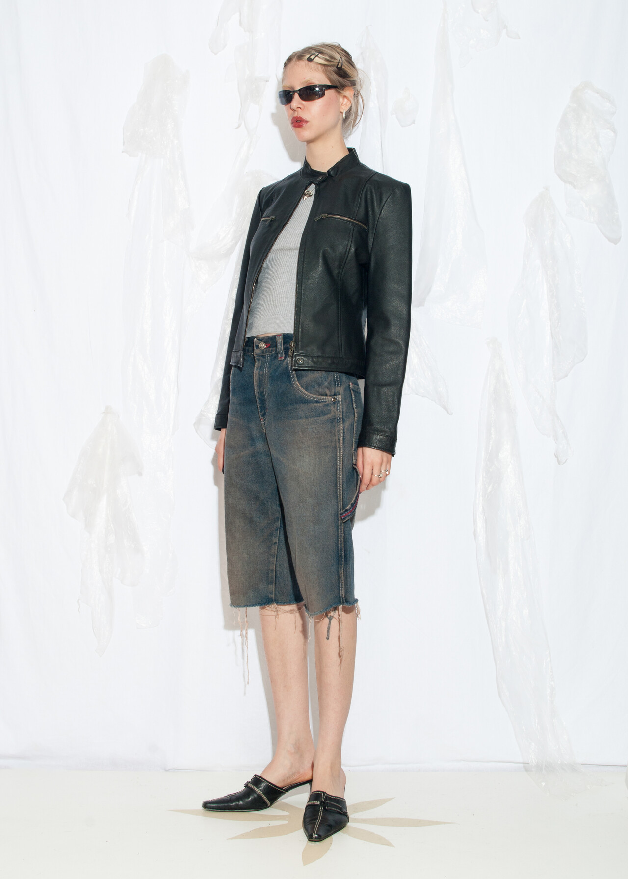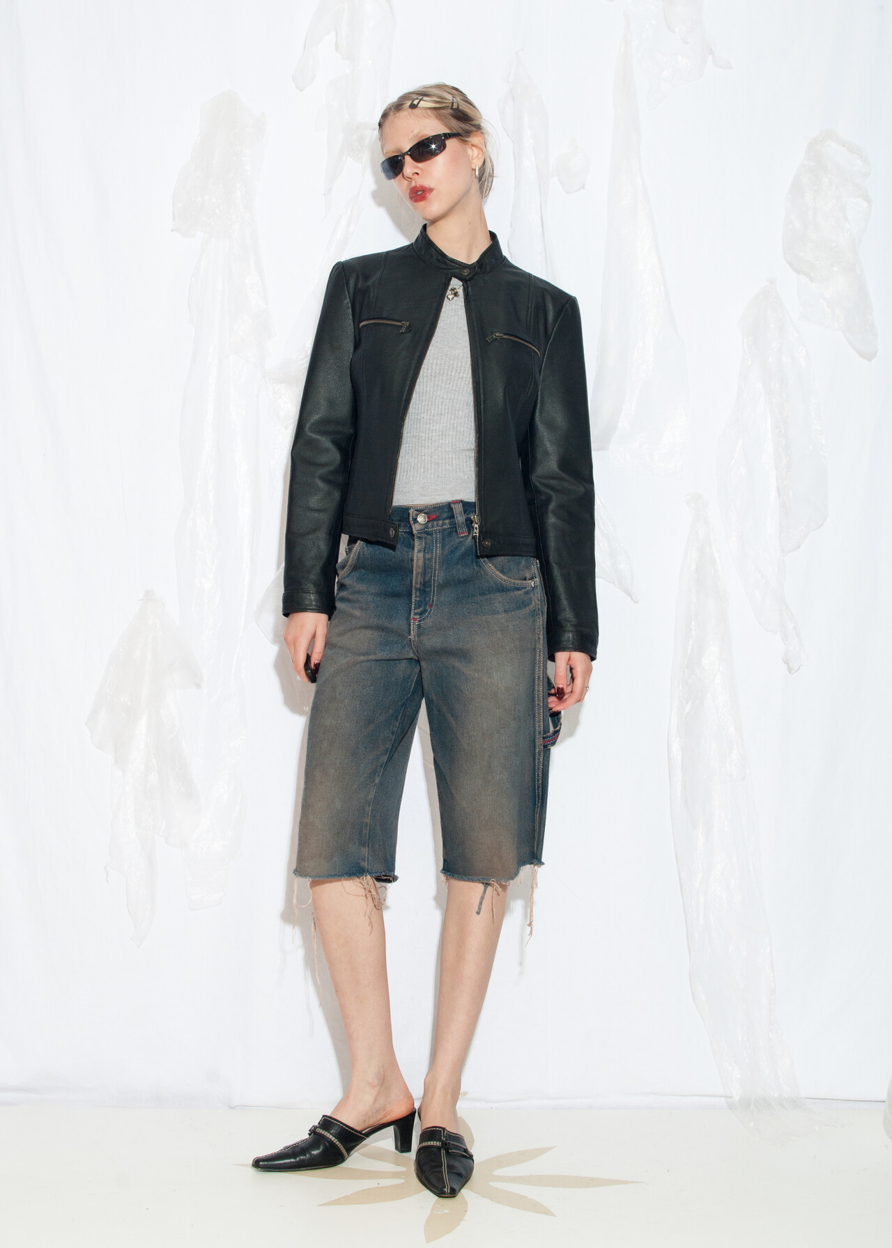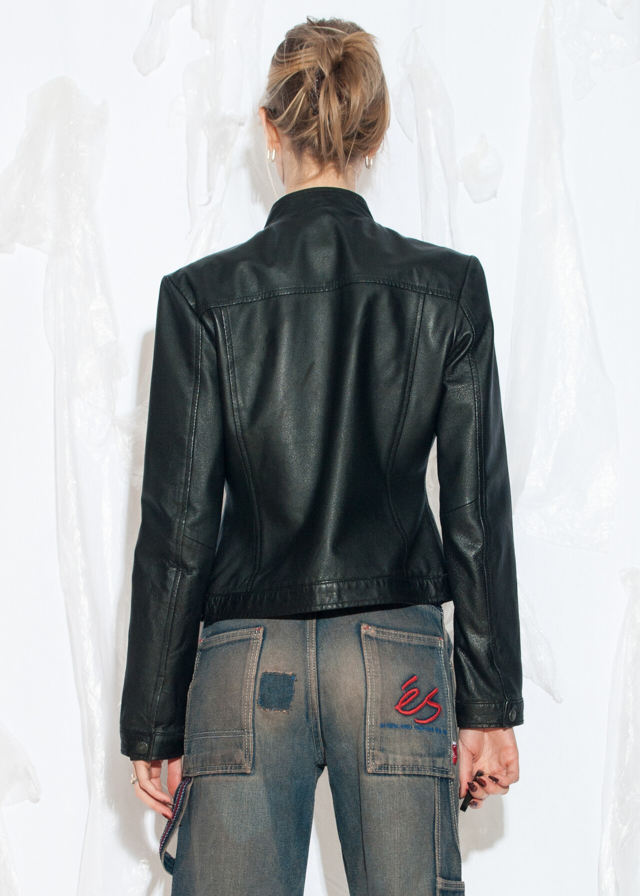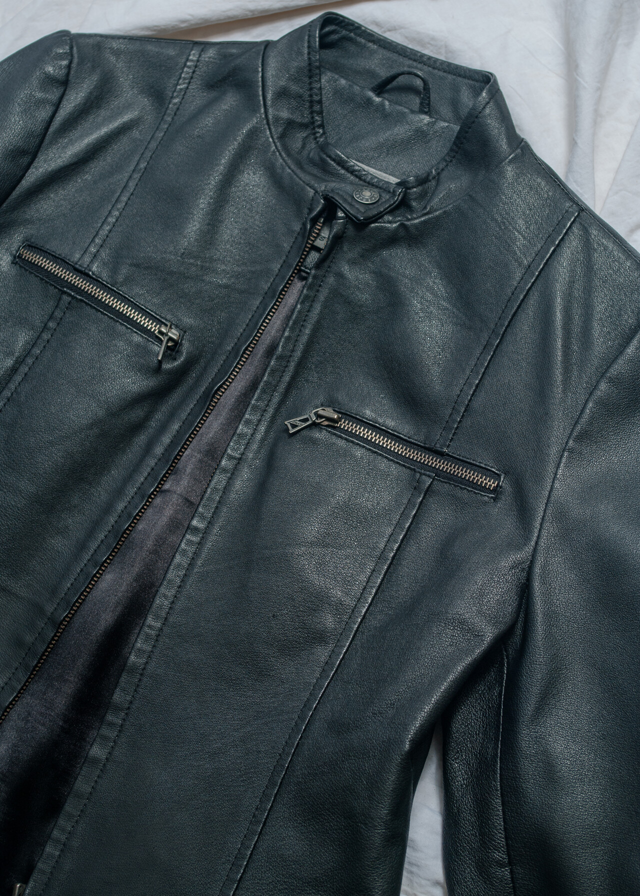 Tags: 2000s style clothing, downtown girl, fitted crop jacket, minimalist, racing style coat, real leather jacket, slim fit, y2k vintage fashion