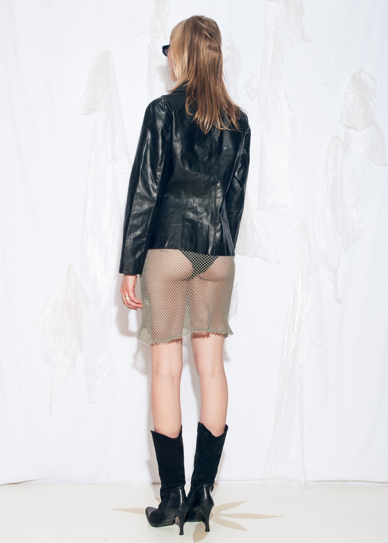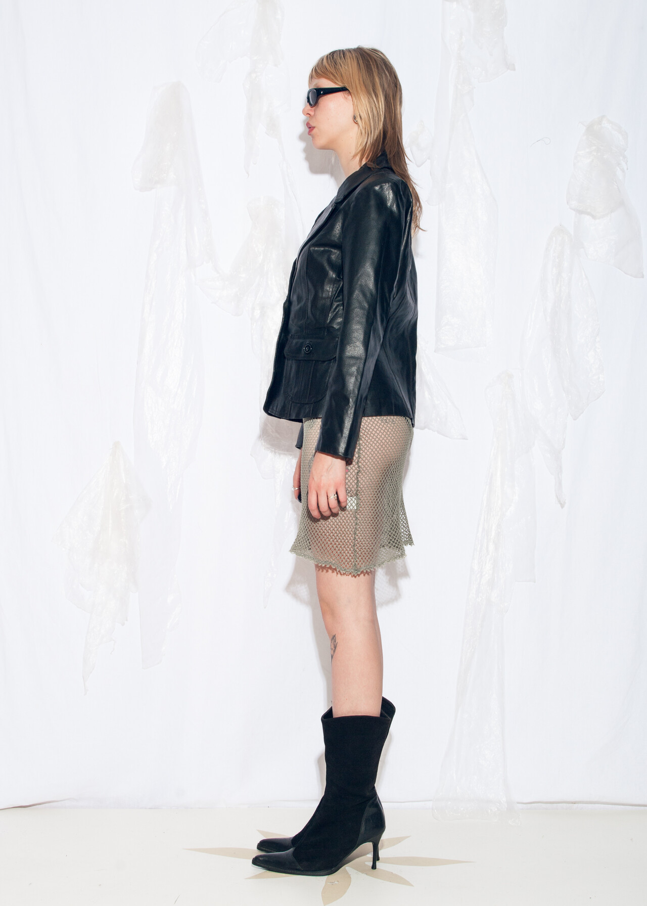 Y2K vintage office siren jacket – an impeccably slimming real leather blazer ready to channel your inner corporate diva while making you look as cool as an early 2000s pop star.