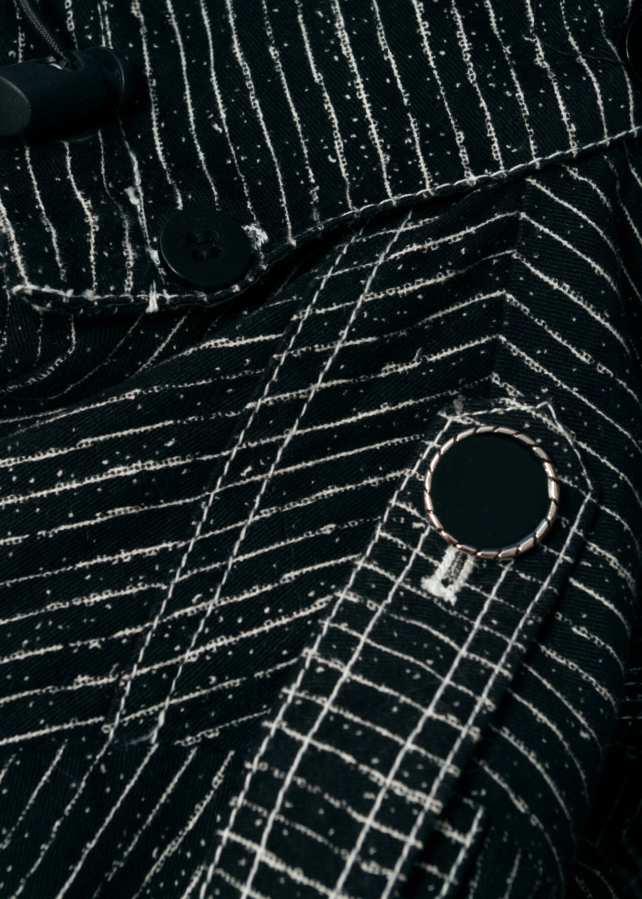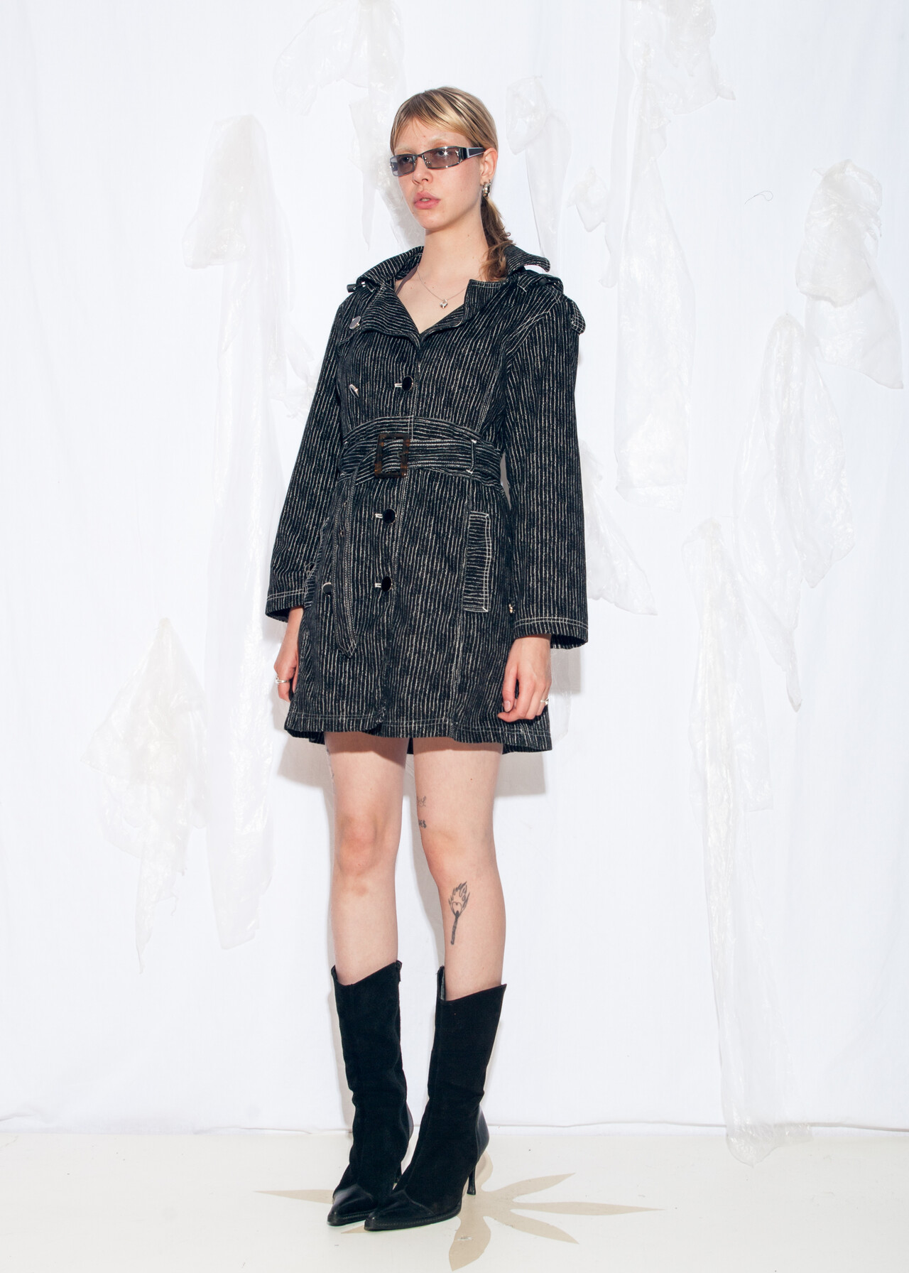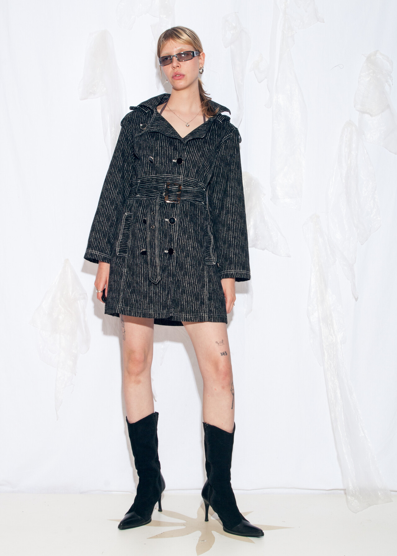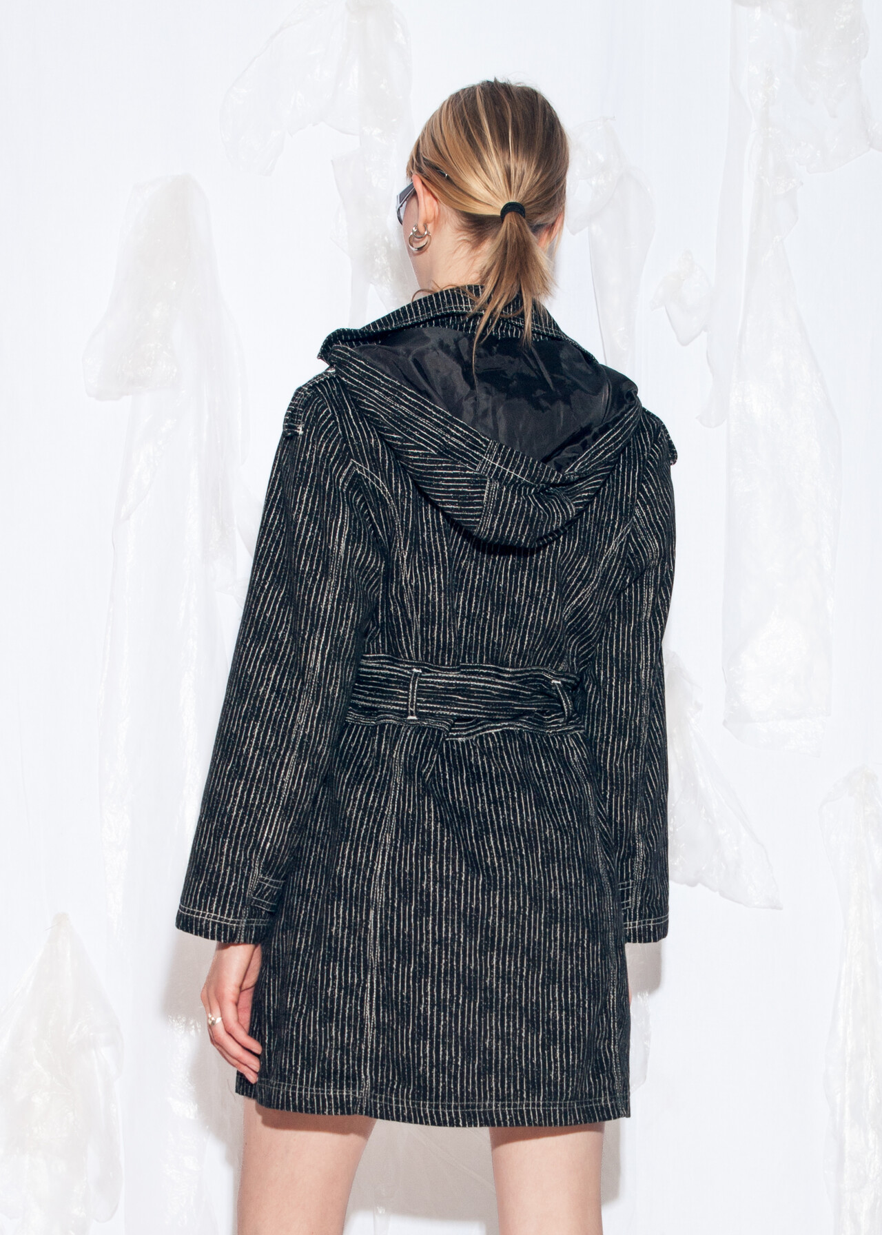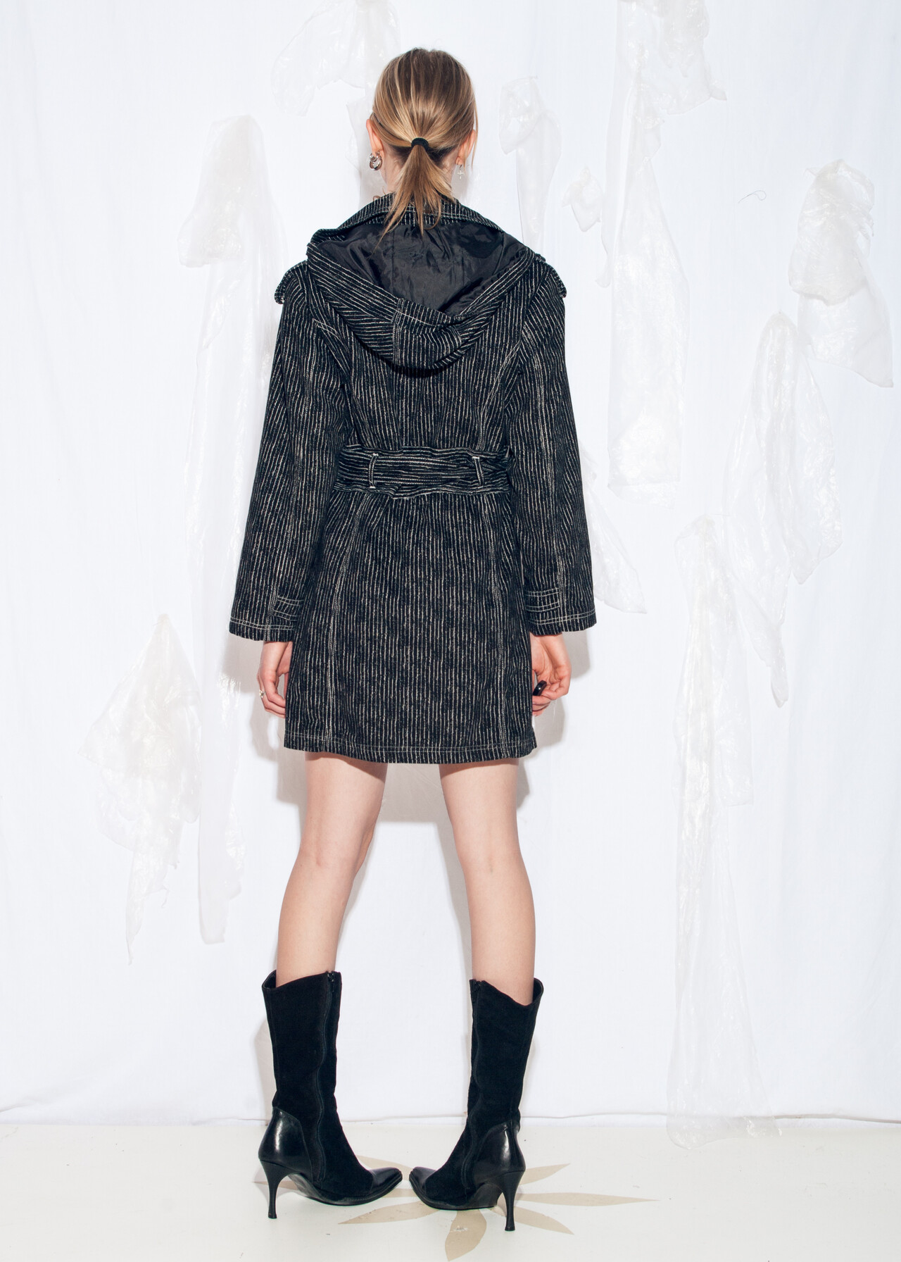 Tags: 2000s style clothing, black trench coat, double breasted, hooded coat, pinstriped jacket, techno cowboy outfit, y2k vintage fashion