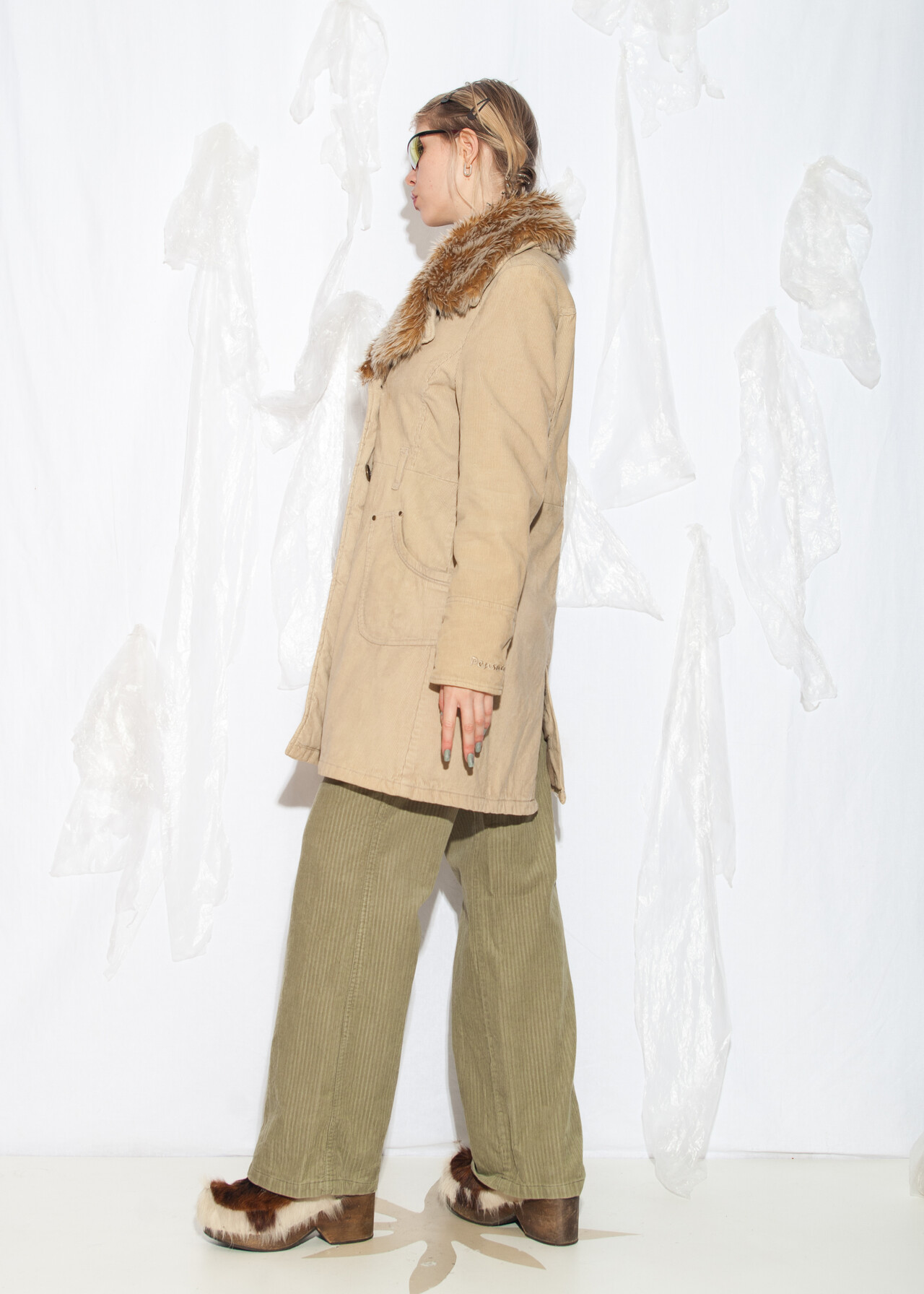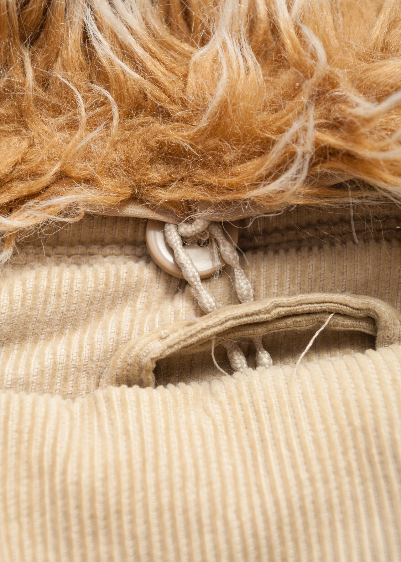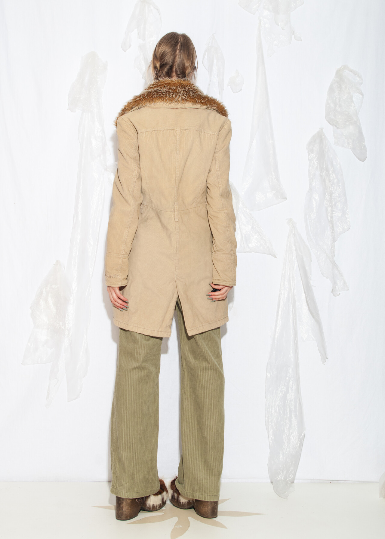 Tags: 2000s style clothing, beige shaggy coat, corduroy jacket, double breasted coat, fur collar coat, long jacket, natural cotton, shaggy furry jacket, y2k vintage fashion