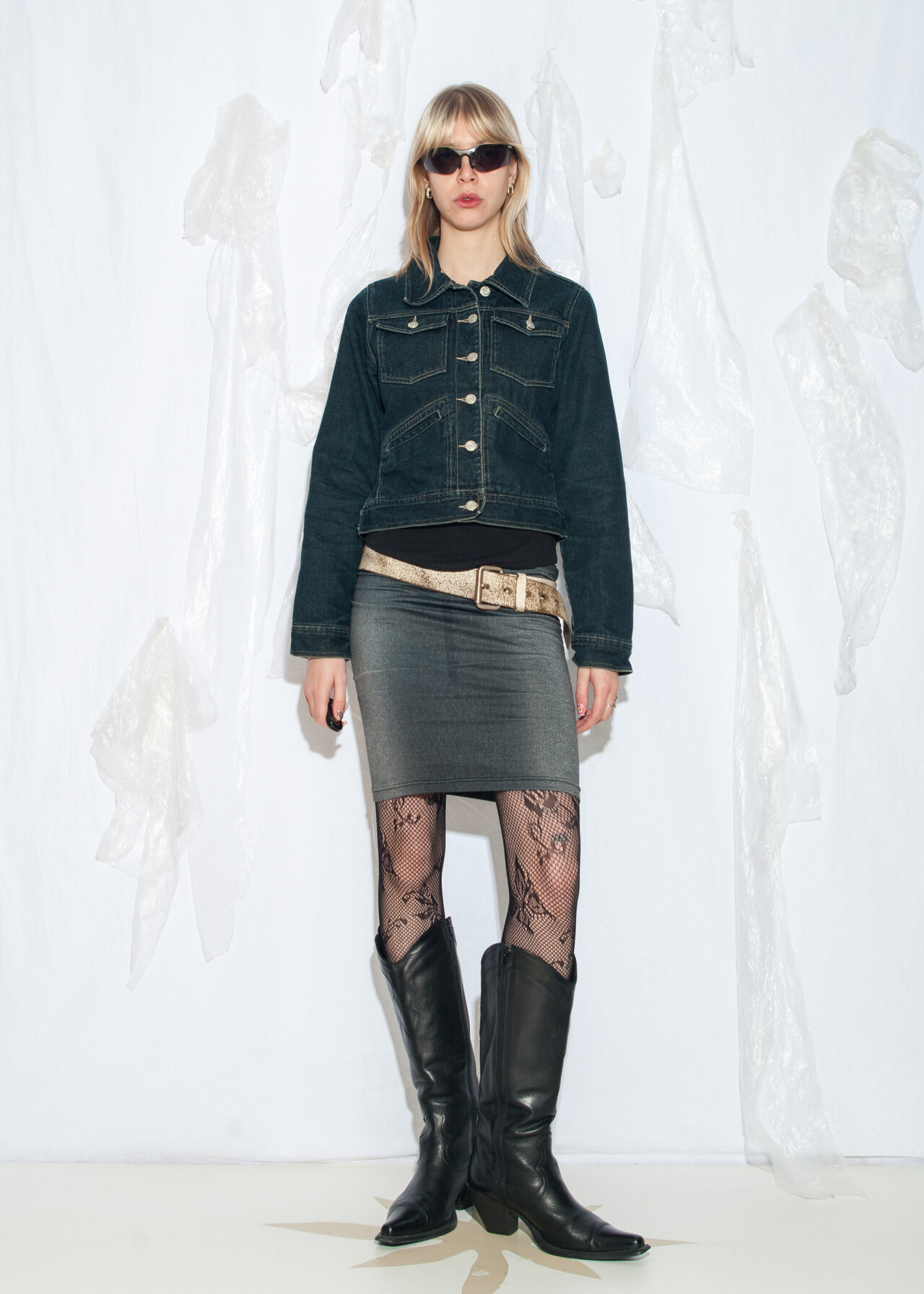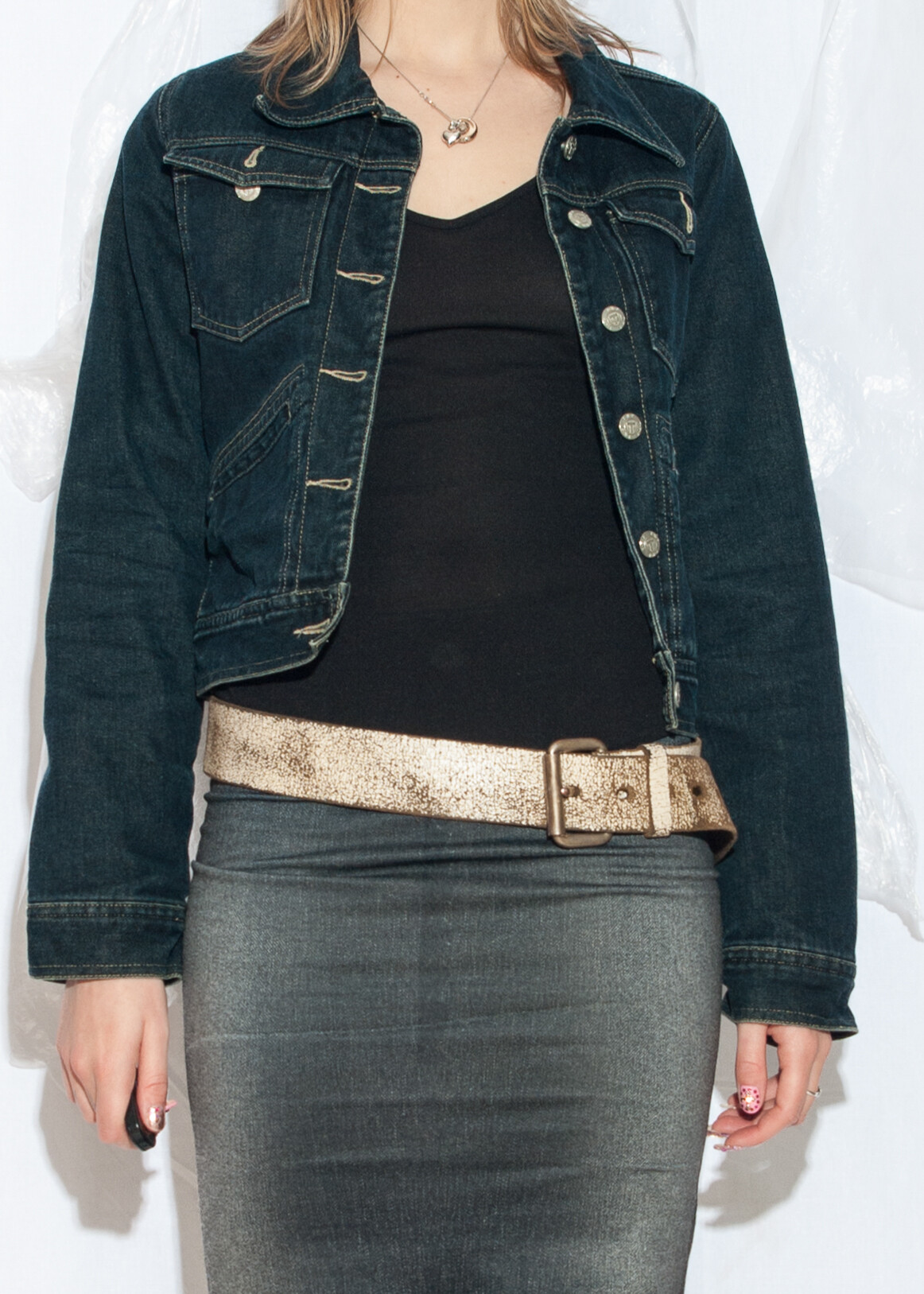 Tags: 00s streetwear, 2000s vintage fashion, cropped, dark wash denim, fitted denim coat, jean jacket, slim fit jacket, y2k grunge outfit, y2k style clothing