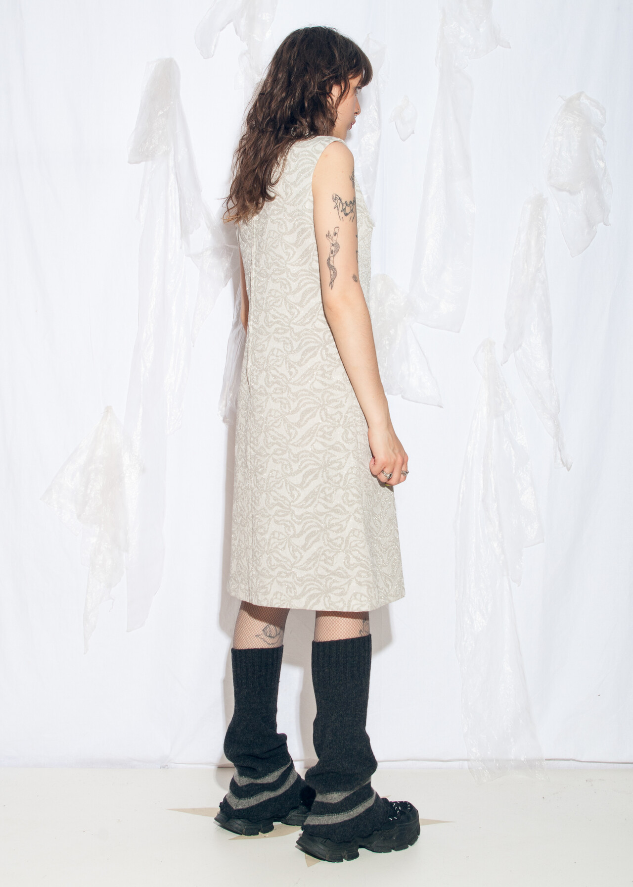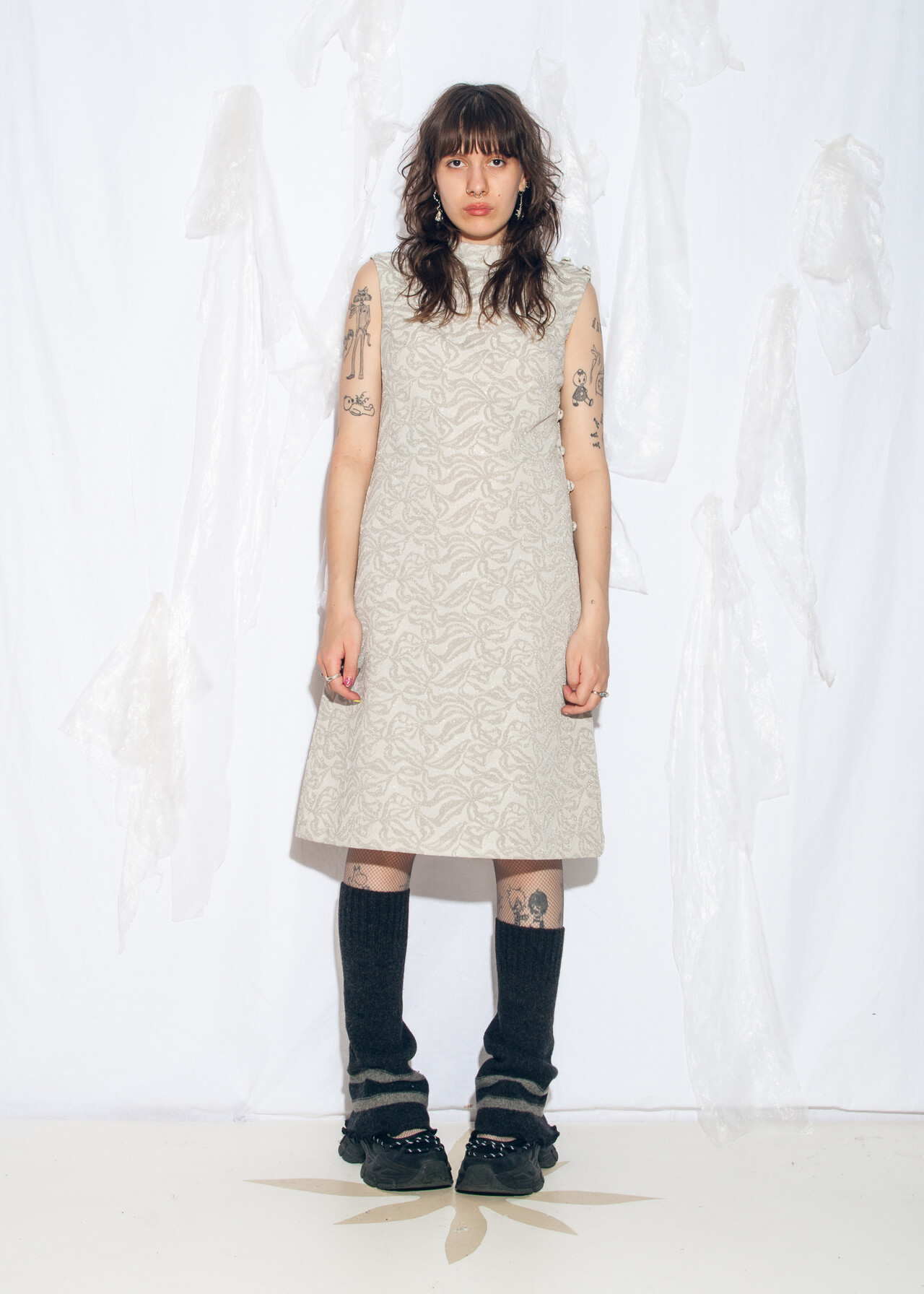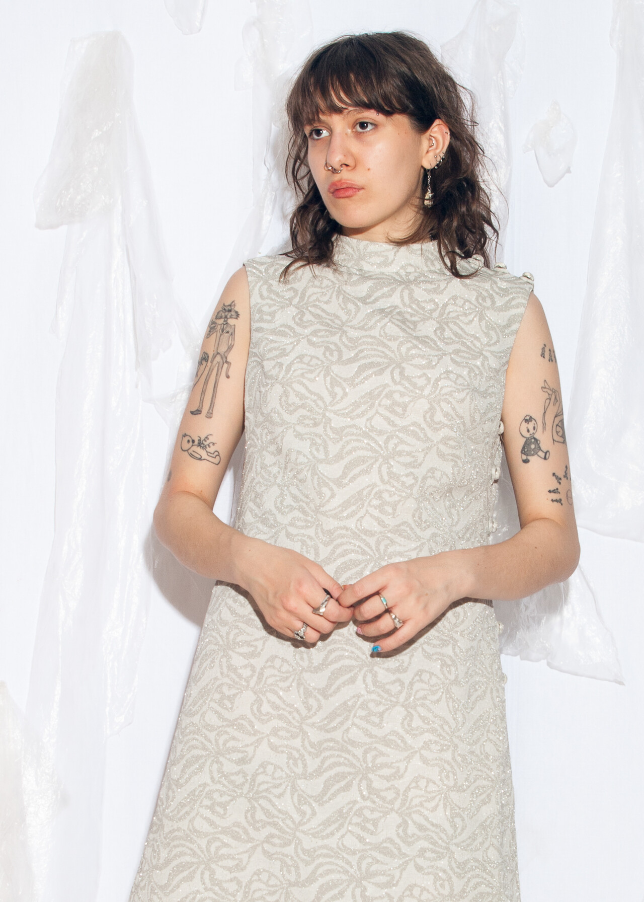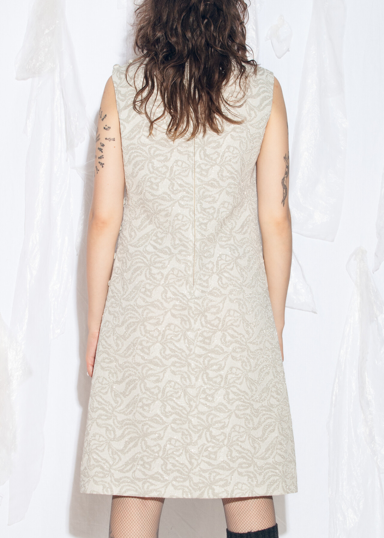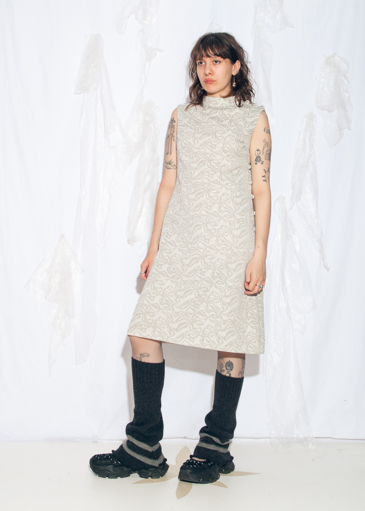 Tags: 60s vintage fashion, dark bridalcore, designer vintage, Leslie Fay, mod midi dress, silver party dress, space age dress, wedding dress