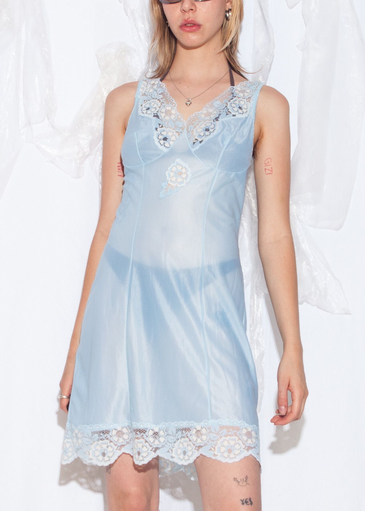 Vintage 70s Lace Slip Midi Dress in Pastel Blue