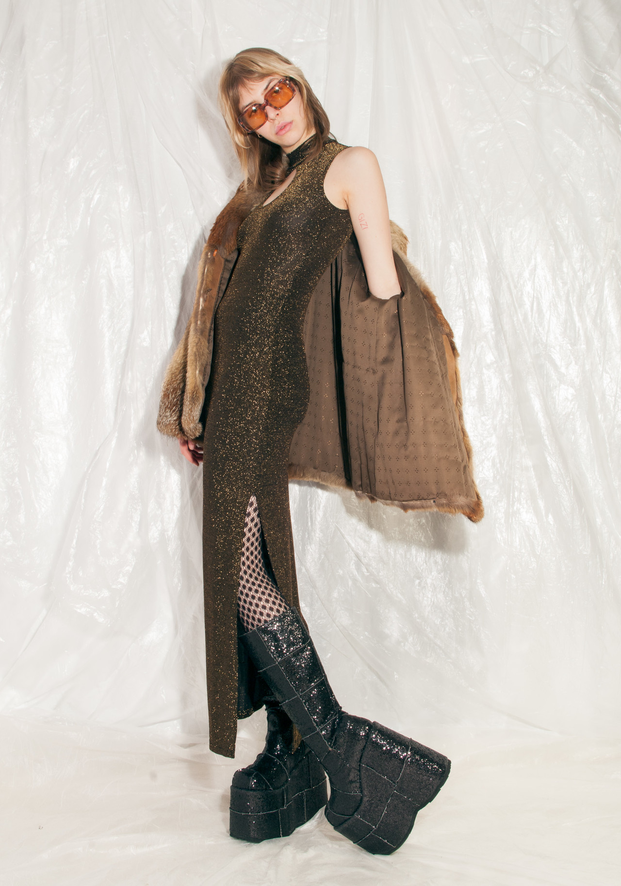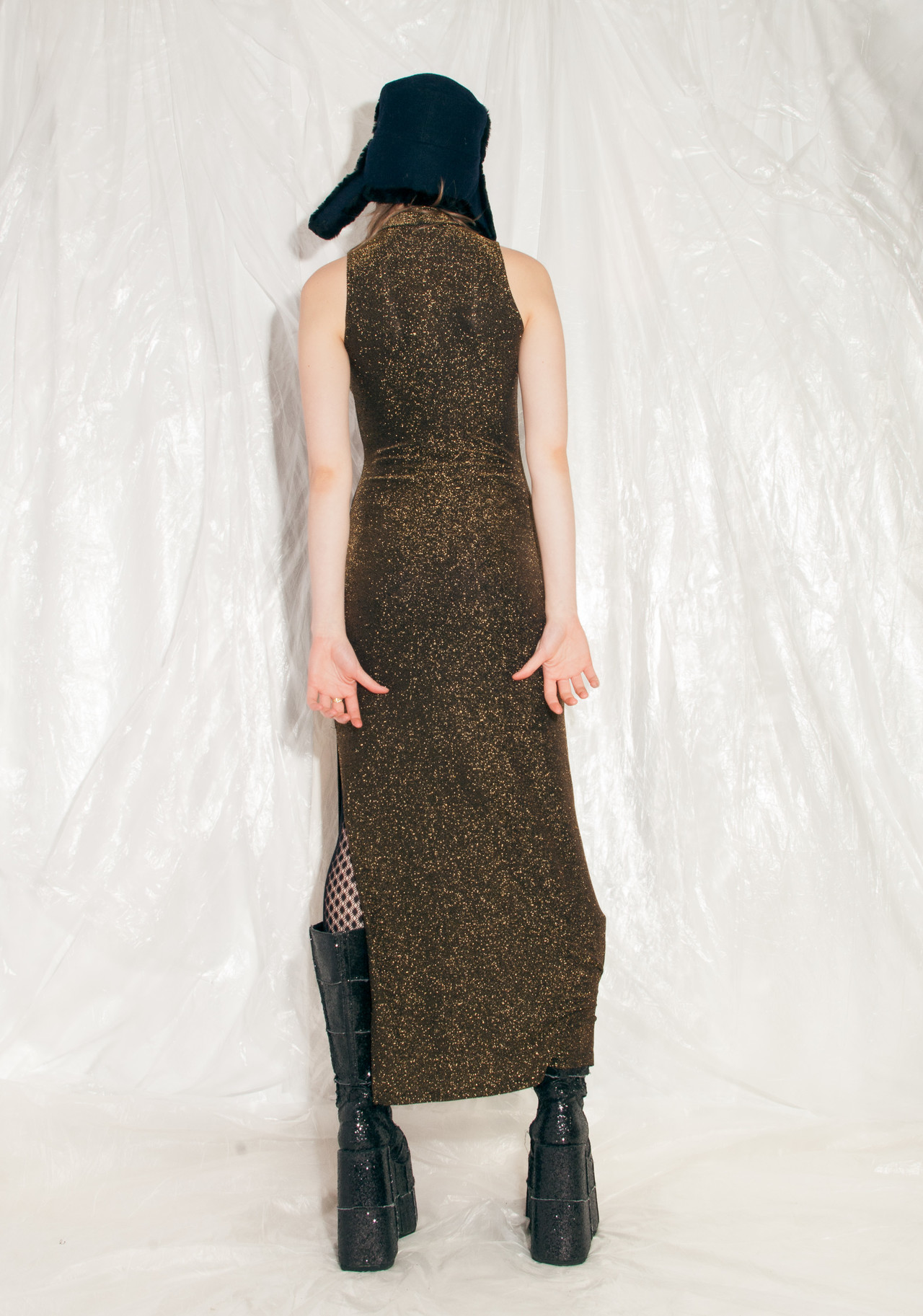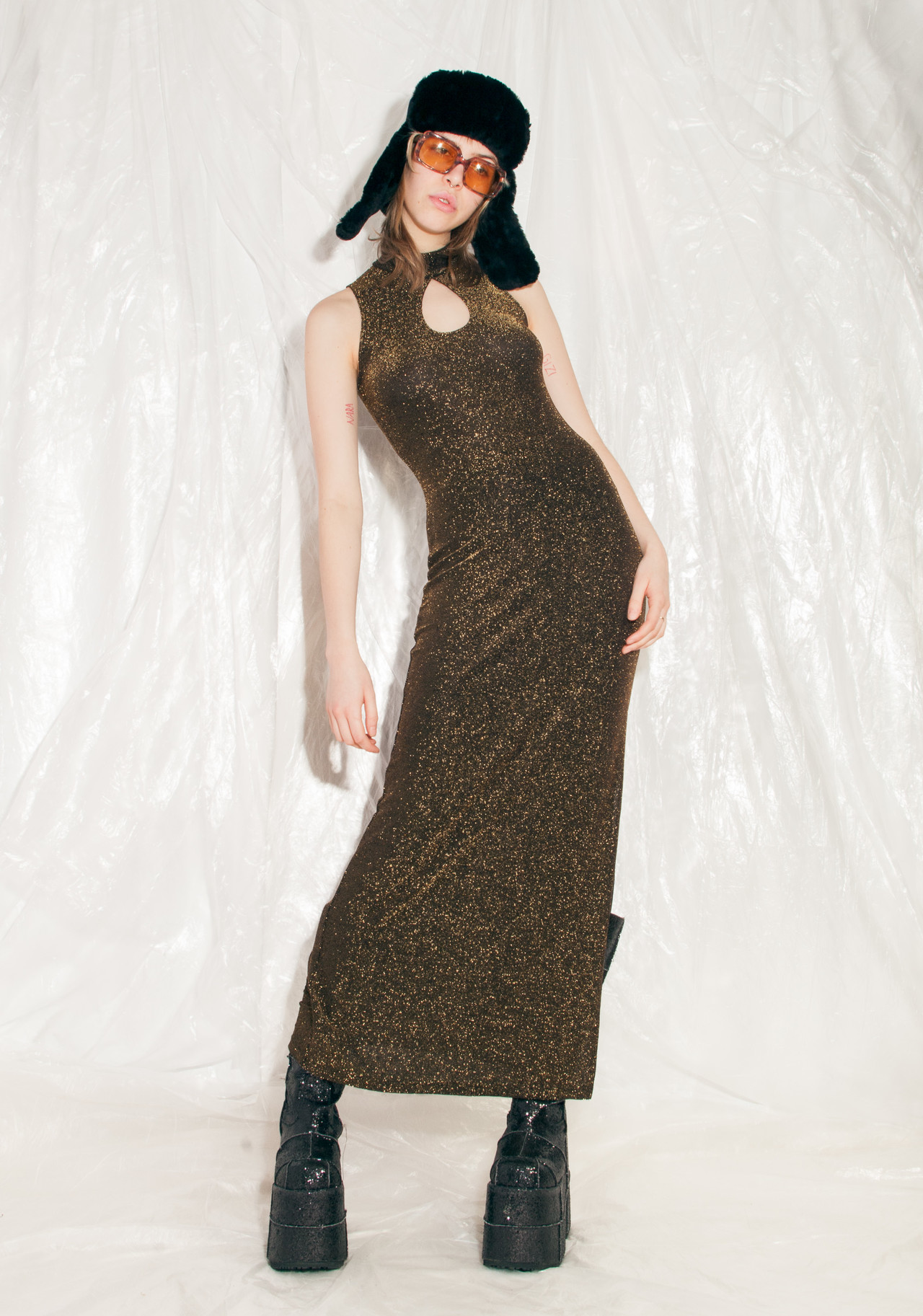 Tags: 90s vintage fashion, cut out detail, evening dress, glam partywear, keyhole neck, long step slit, prom maxi dress, shiny sparkling gold, y2k style clothing