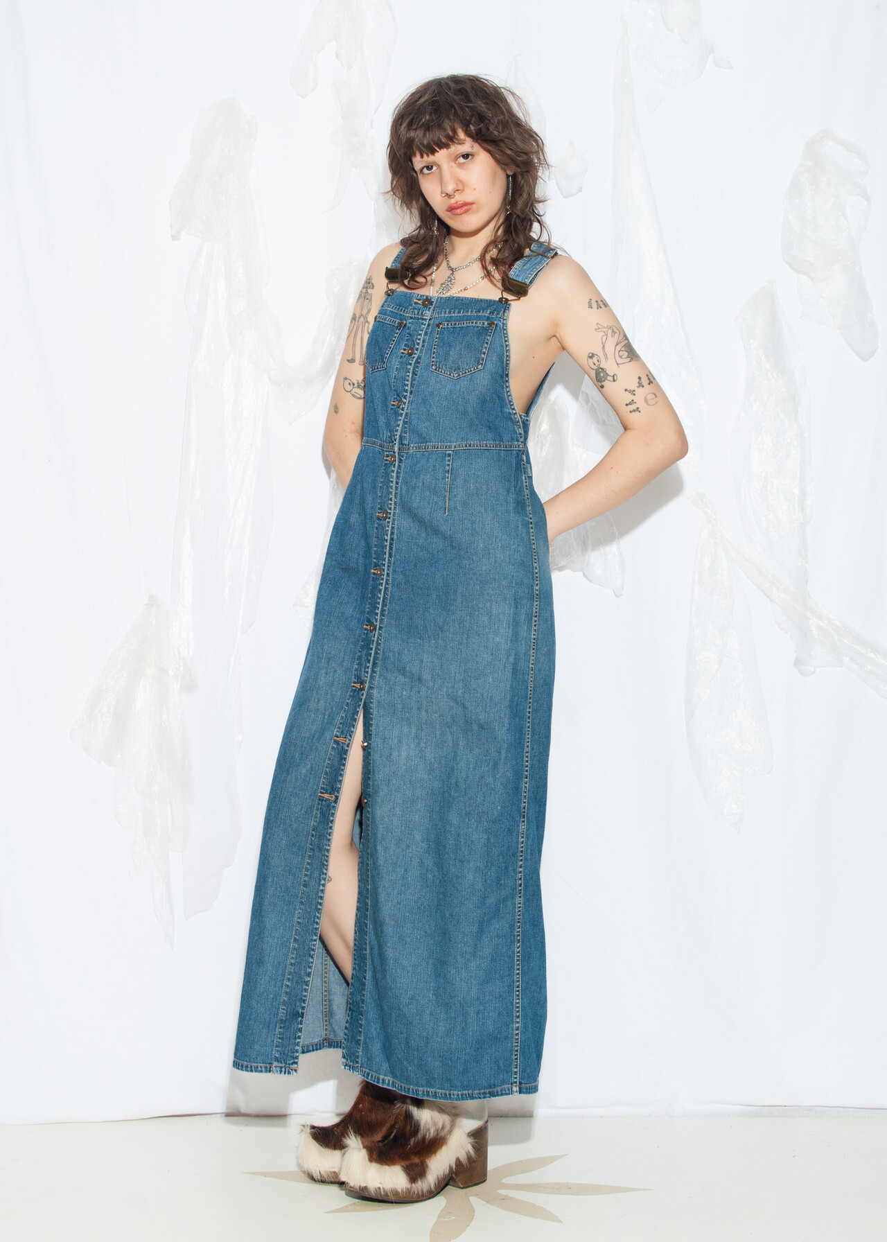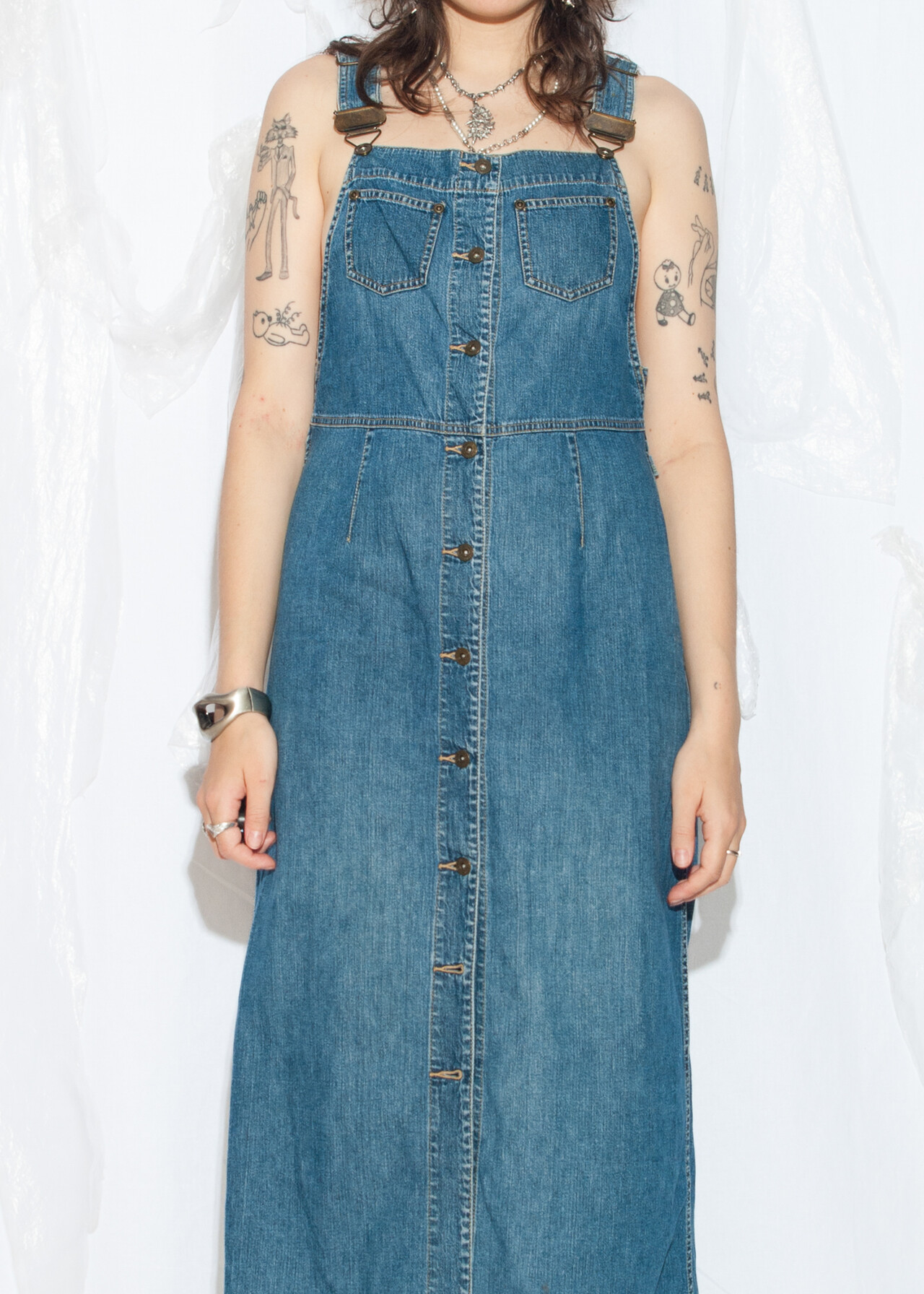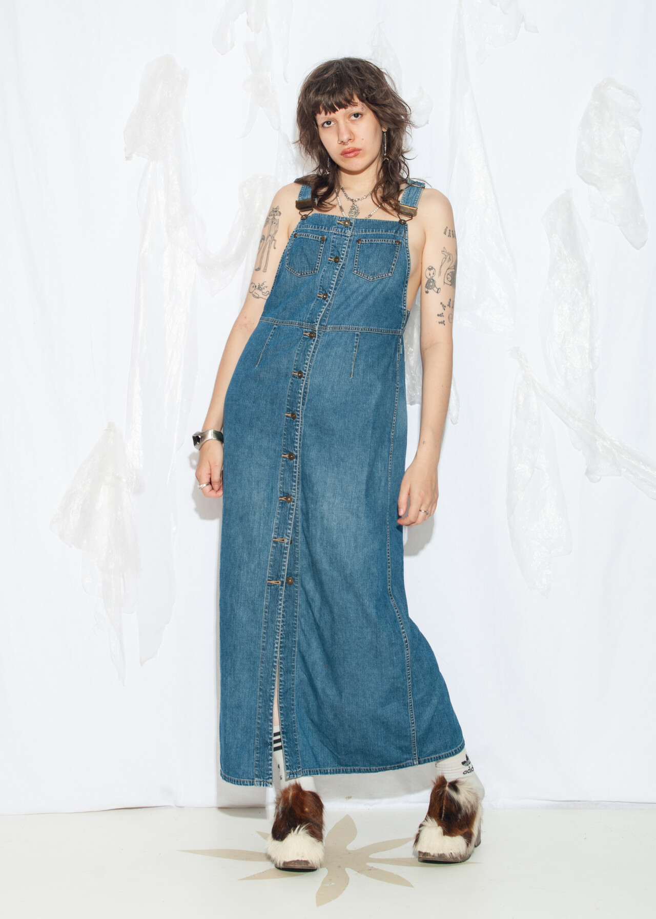 Tags: 90s vintage fashion, button front dress, denim maxi dress, designer vintage, dungaree dress, grunge style outfit, Liz Claiborne, pinafore dress
