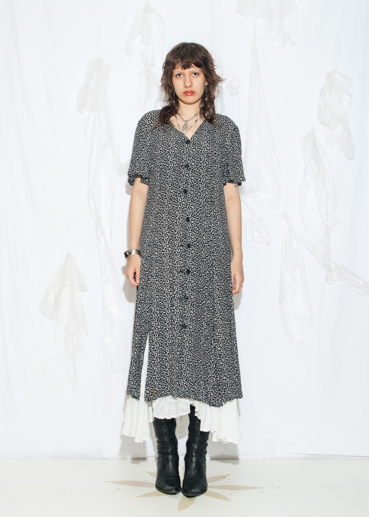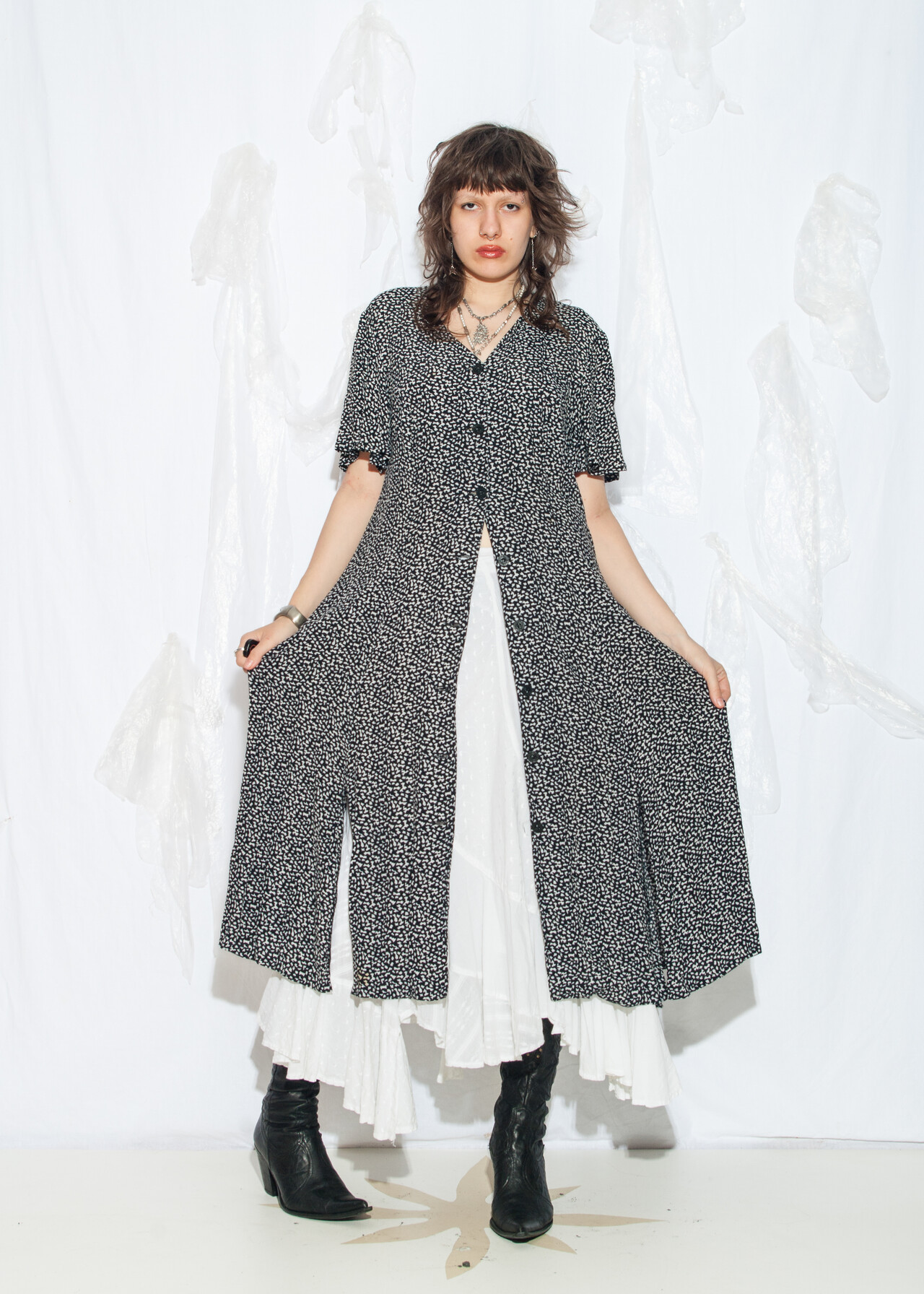 This 90s vintage dress is your one-way ticket to grunge style outfit heaven, complete with button front drama and whimsigoth vibes that scream ‘pass the plaid and Nirvana, please!’