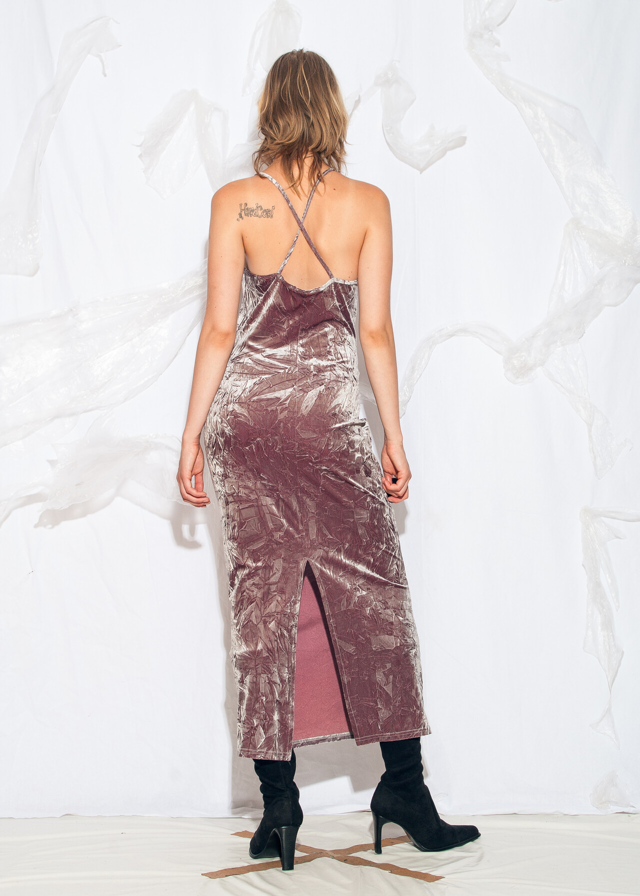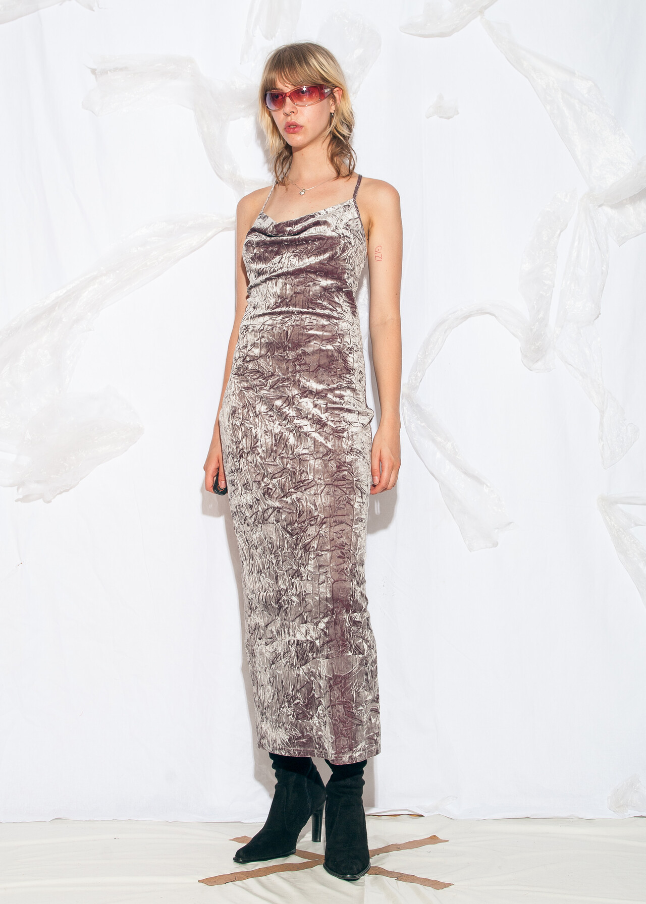 Vintage Y2K Crushed Velvet Maxi Dress in Silver Pink