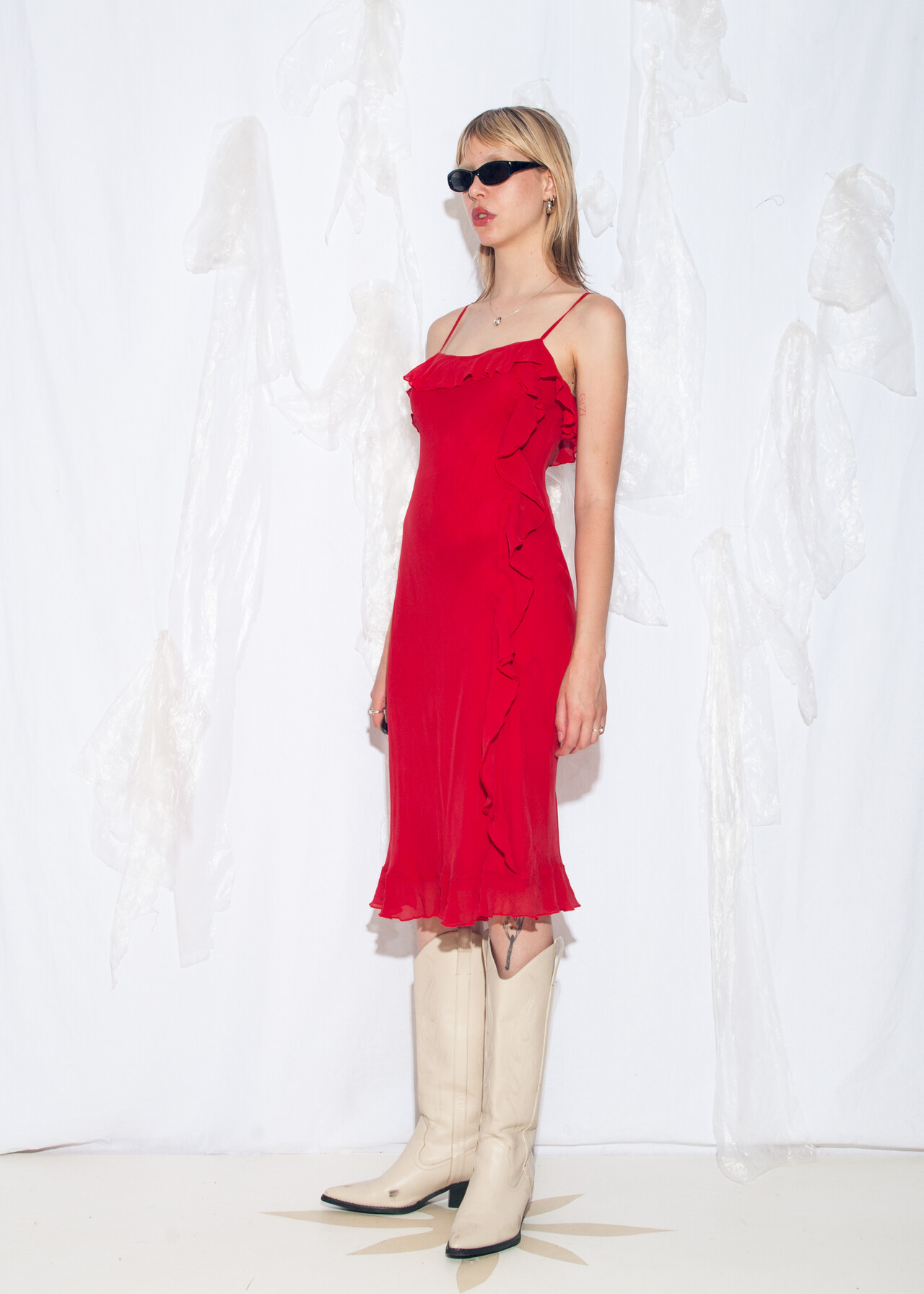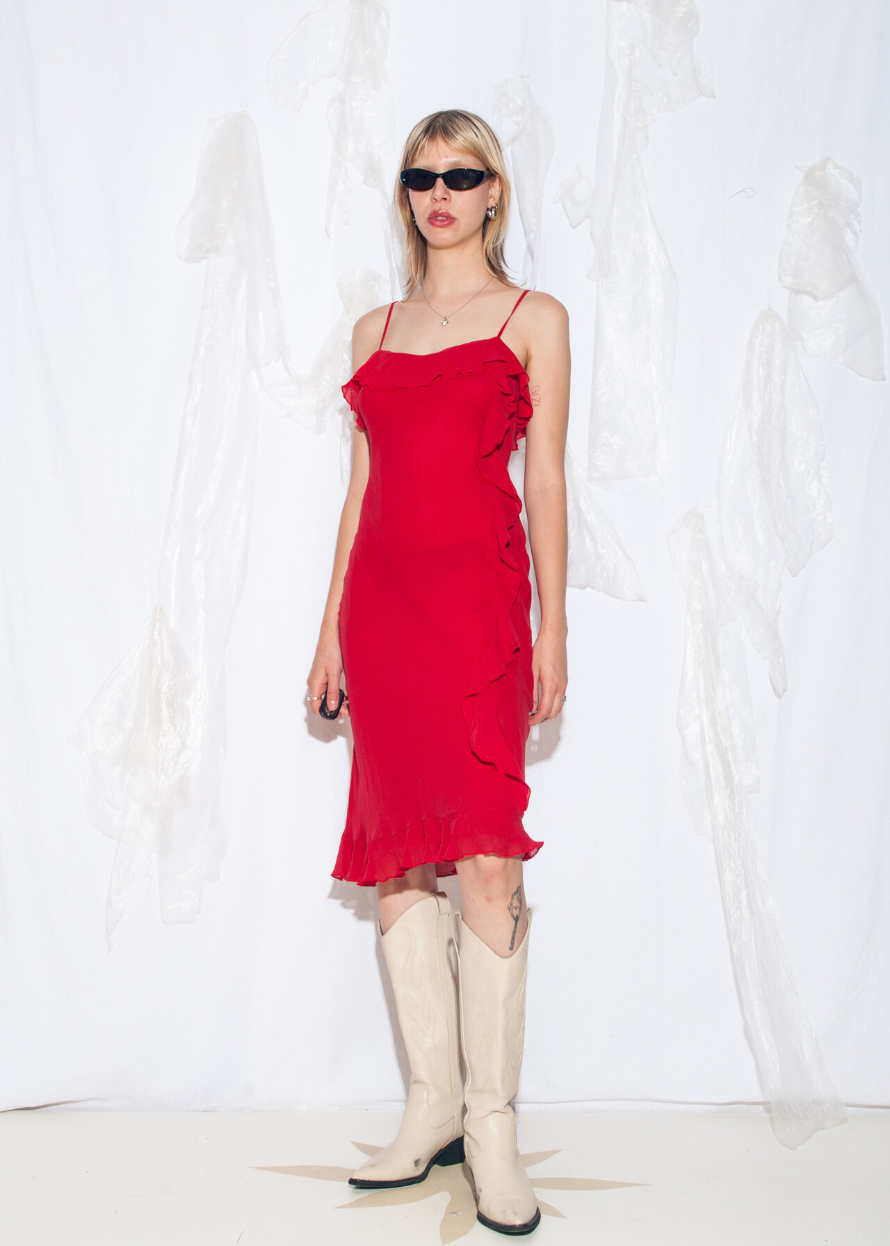 Tags: 2000s style clothing, evening slip dress, frilly party dress, prom outfit, pure silk, red midi dress, y2k vintage fashion