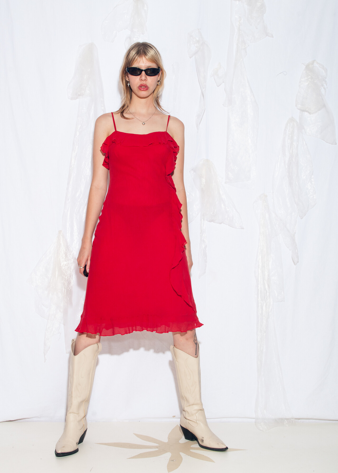 Be the first to review “Vintage Y2K Frilly Silk Dress in Red” Cancel reply
