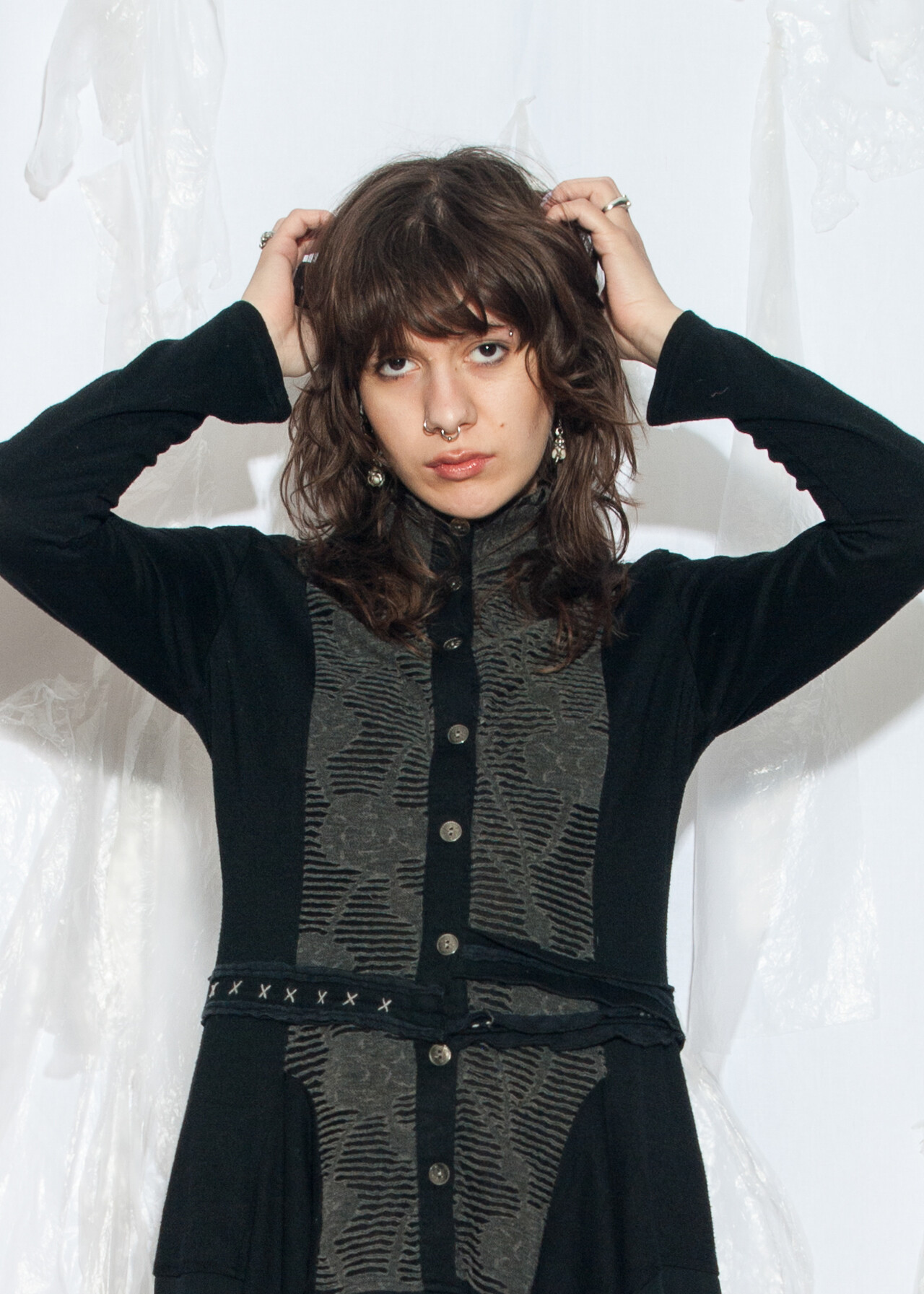 Tags: 2000s style fashion, dark whimsi twee, frilly tunic, grunge outfit, preppy goth look, vampire punk, y2k vintage clothing